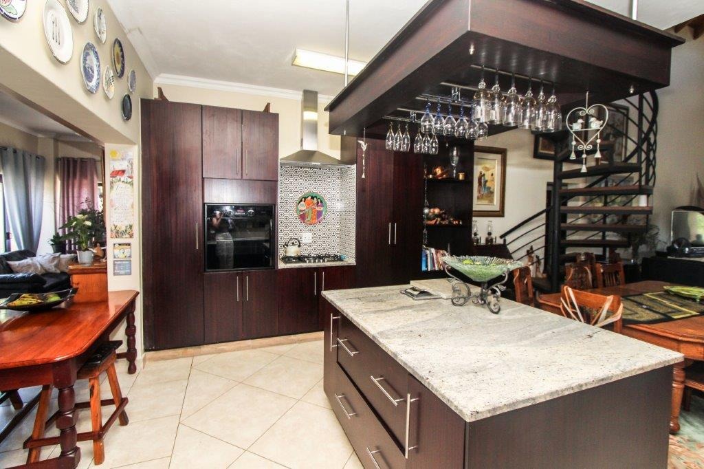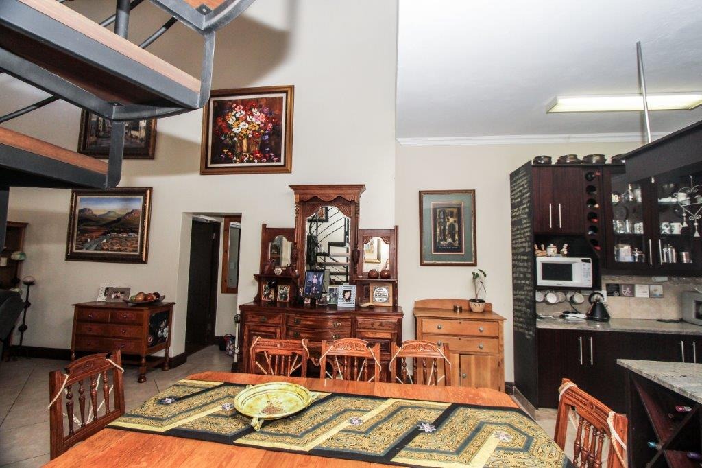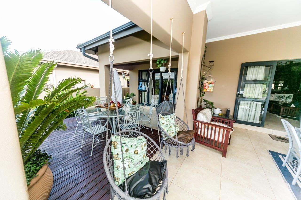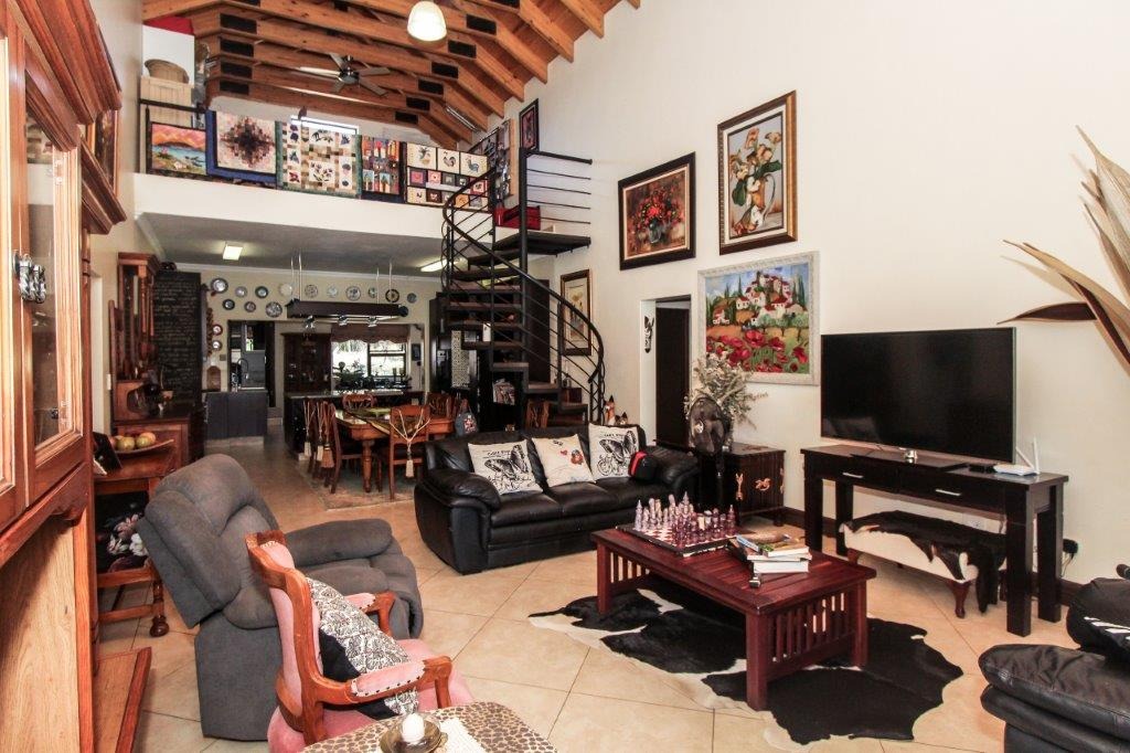 The open patio, complete with a built-in braai and whimsical swings, sets the stage for memorable outdoor moments. Step inside to a spacious open-plan living area crowned with high ceilings, leading to a lofted sanctuary via a charming spiral staircase.