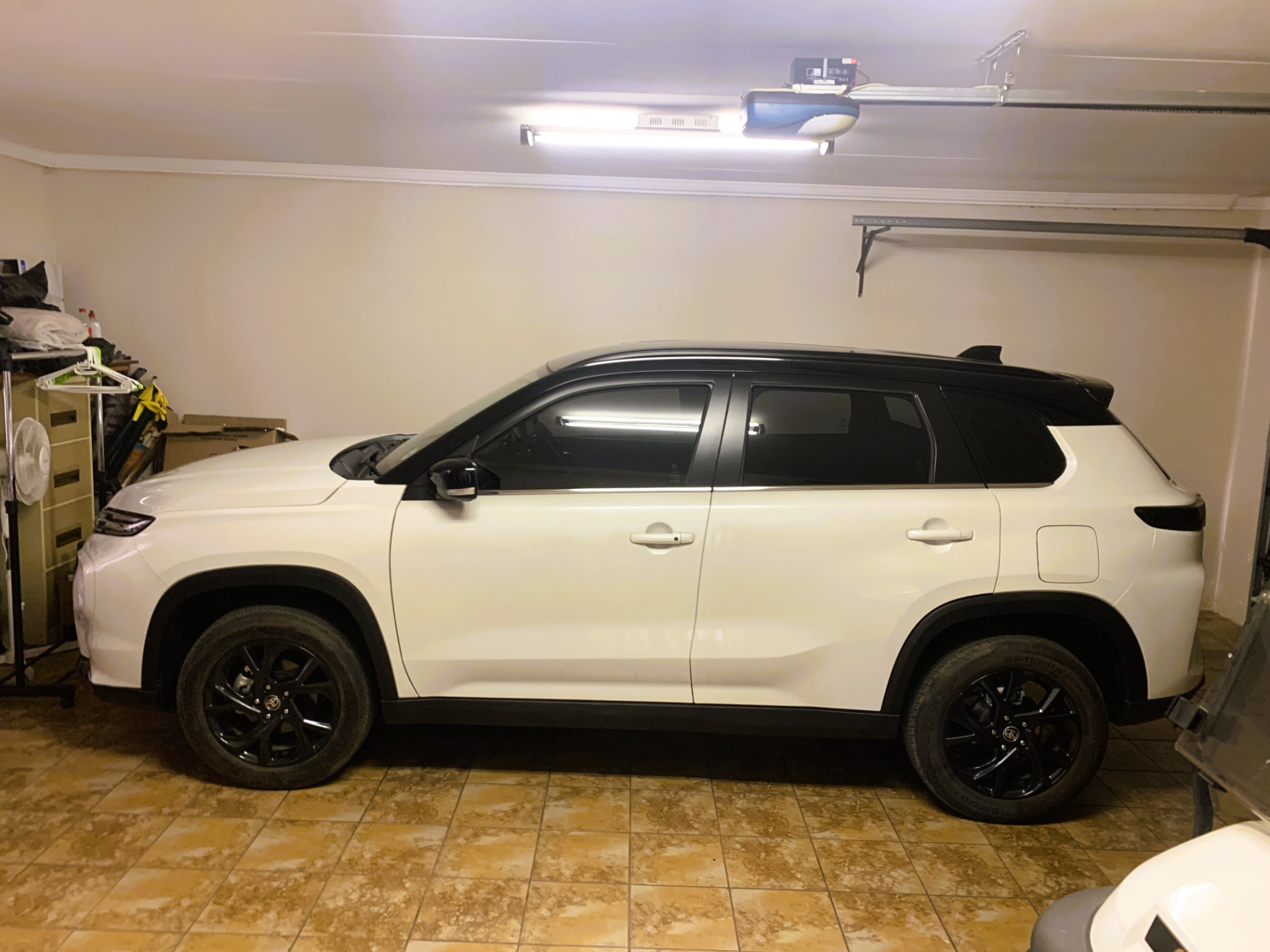 The property features a large driveway leading to a double garage with an automatic roll-up door, providing ample parking and convenience.