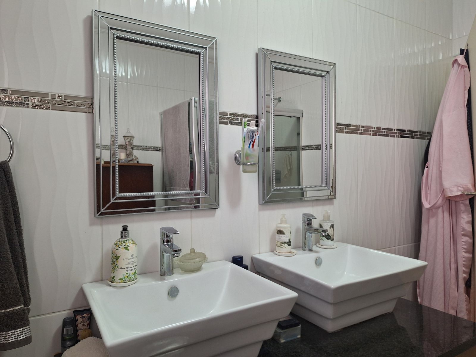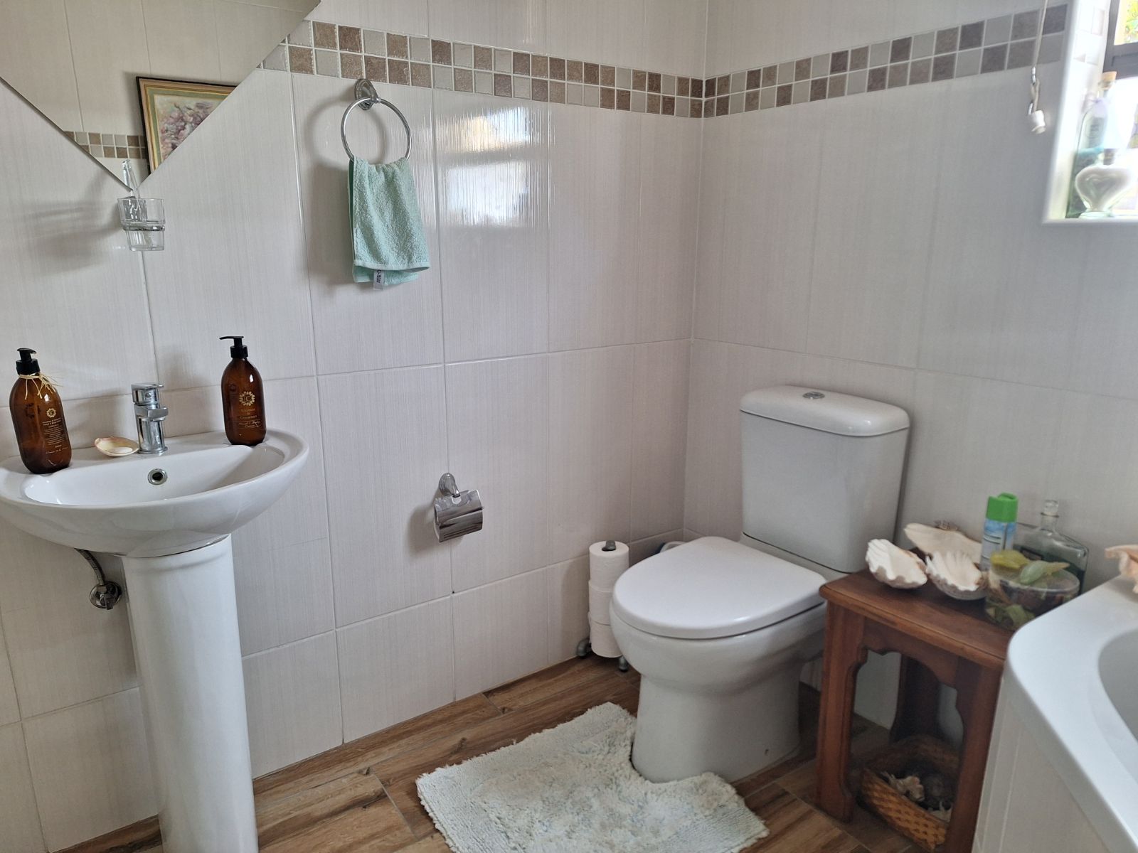 The home itself is beautifully designed with an open-plan layout, encompassing a spacious dining and living area that leads to an entertainment deck overlooking the greenbelt. The kitchen is modern and fully equipped with a gas hob, electric oven, ample cupboard space, and a separate scullery/laundry that opens to a private courtyard. All three bedrooms are generously sized, complete with built-in cupboards, ceiling fans, and serene views. The main bedroom includes an en-suite bathroom, while one of the guest rooms opens directly to the deck with a private outdoor braai area.