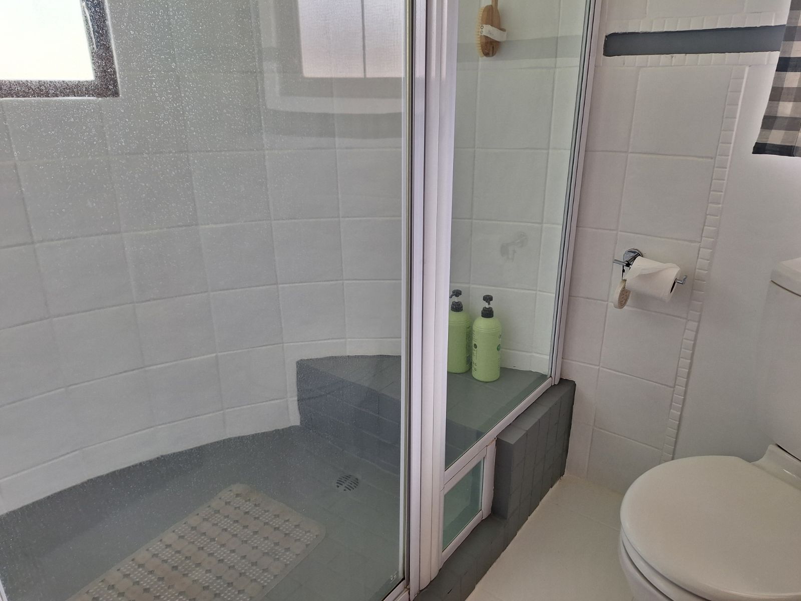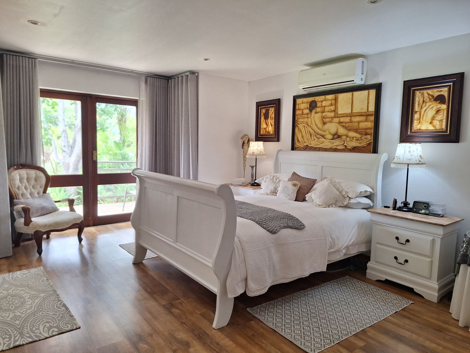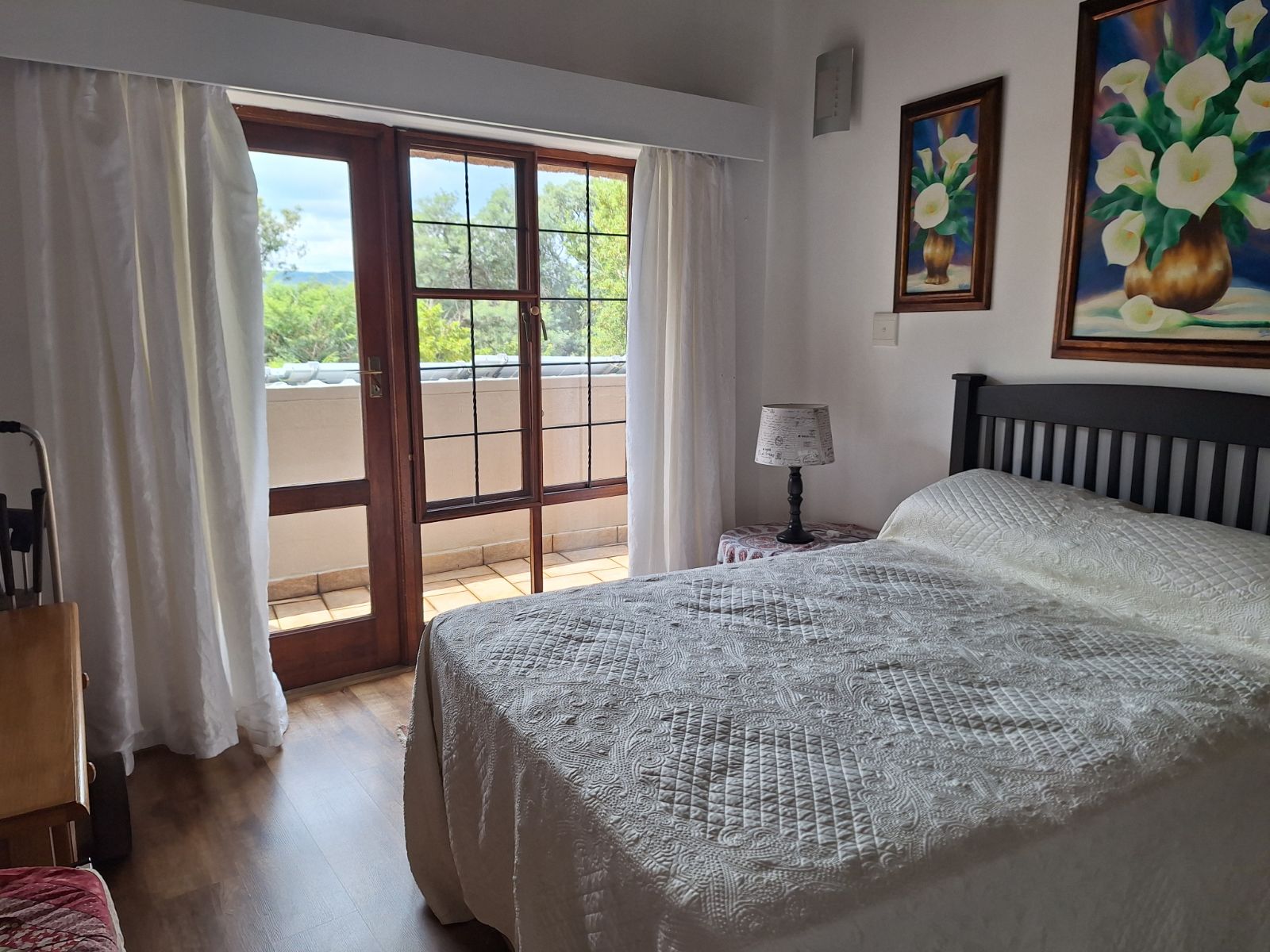 bedrooms and three bathrooms. The downstairs main bedroom boasts built-in cupboards, air conditioning, a full en-suite bathroom, and private patio access. Upstairs, the second main bedroom mirrors these features, including a private balcony. Two additional bedrooms, each with built-in cupboards, share a bathroom and open onto a shared balcony with stunning views.
