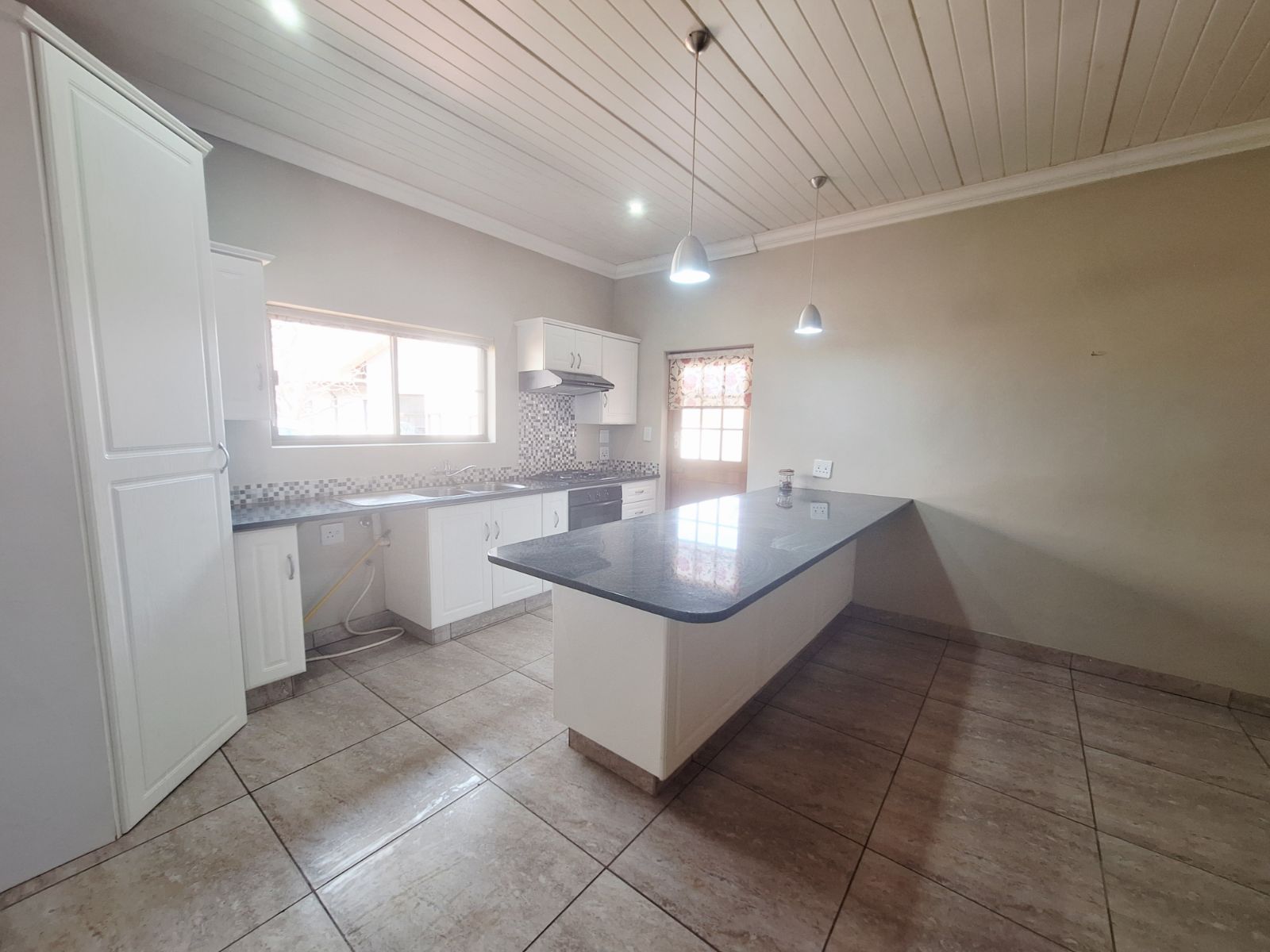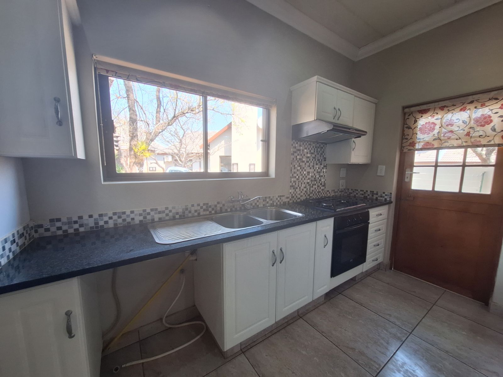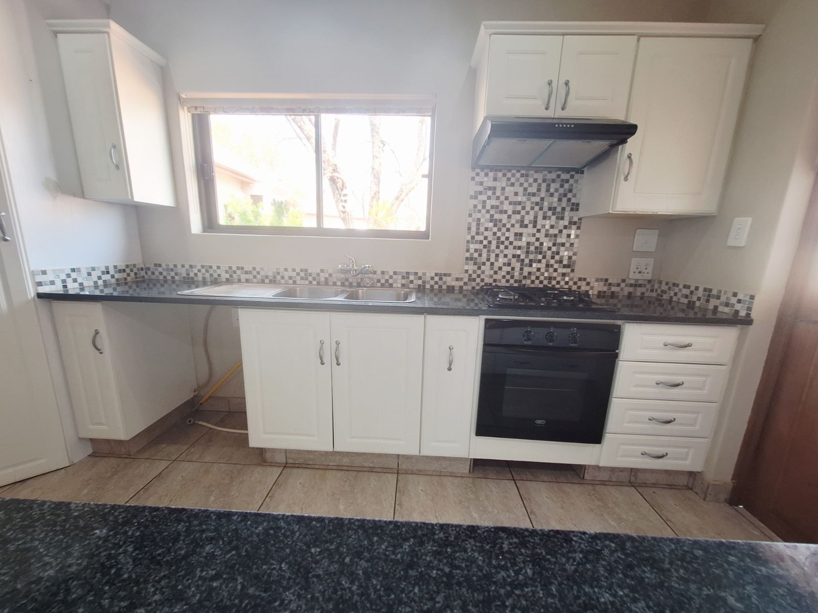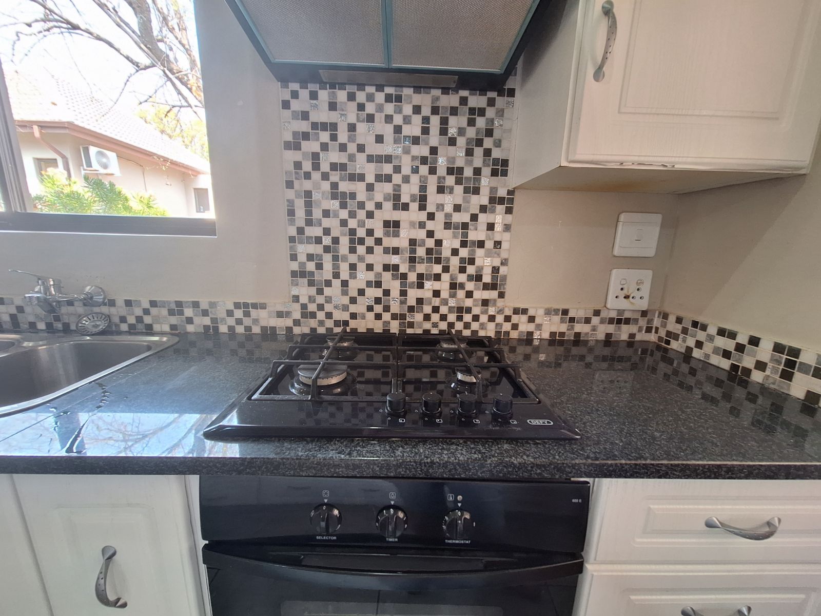 Modern kitchen with built-in cupboards, gas hob, extractor fan, and electric oven