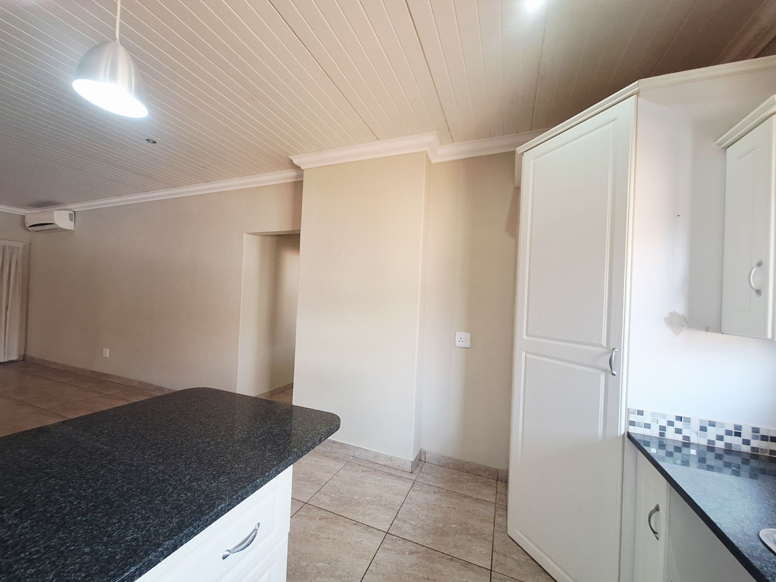 Open-plan lounge and dining area with air conditioning, and tiled floors