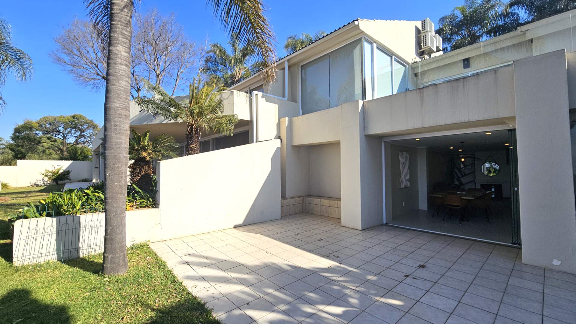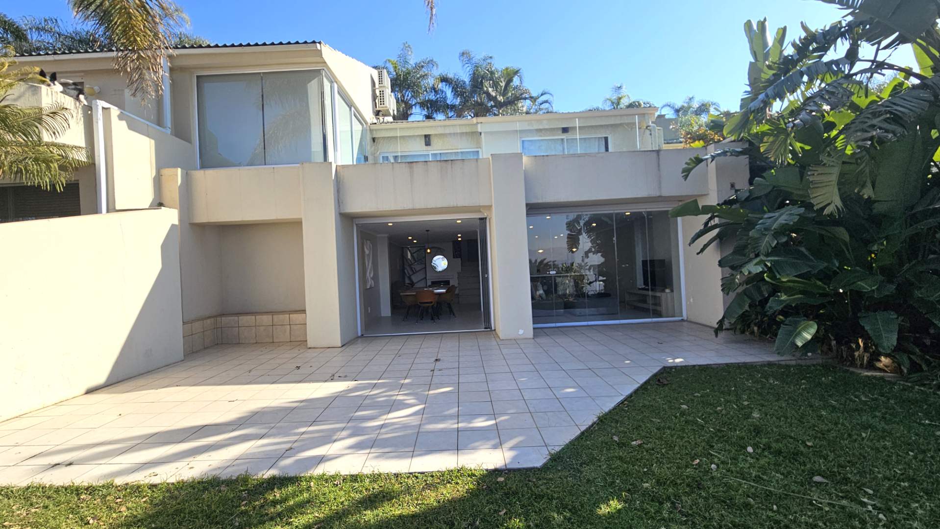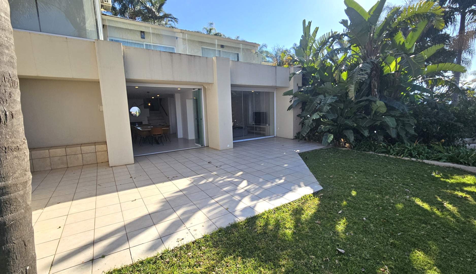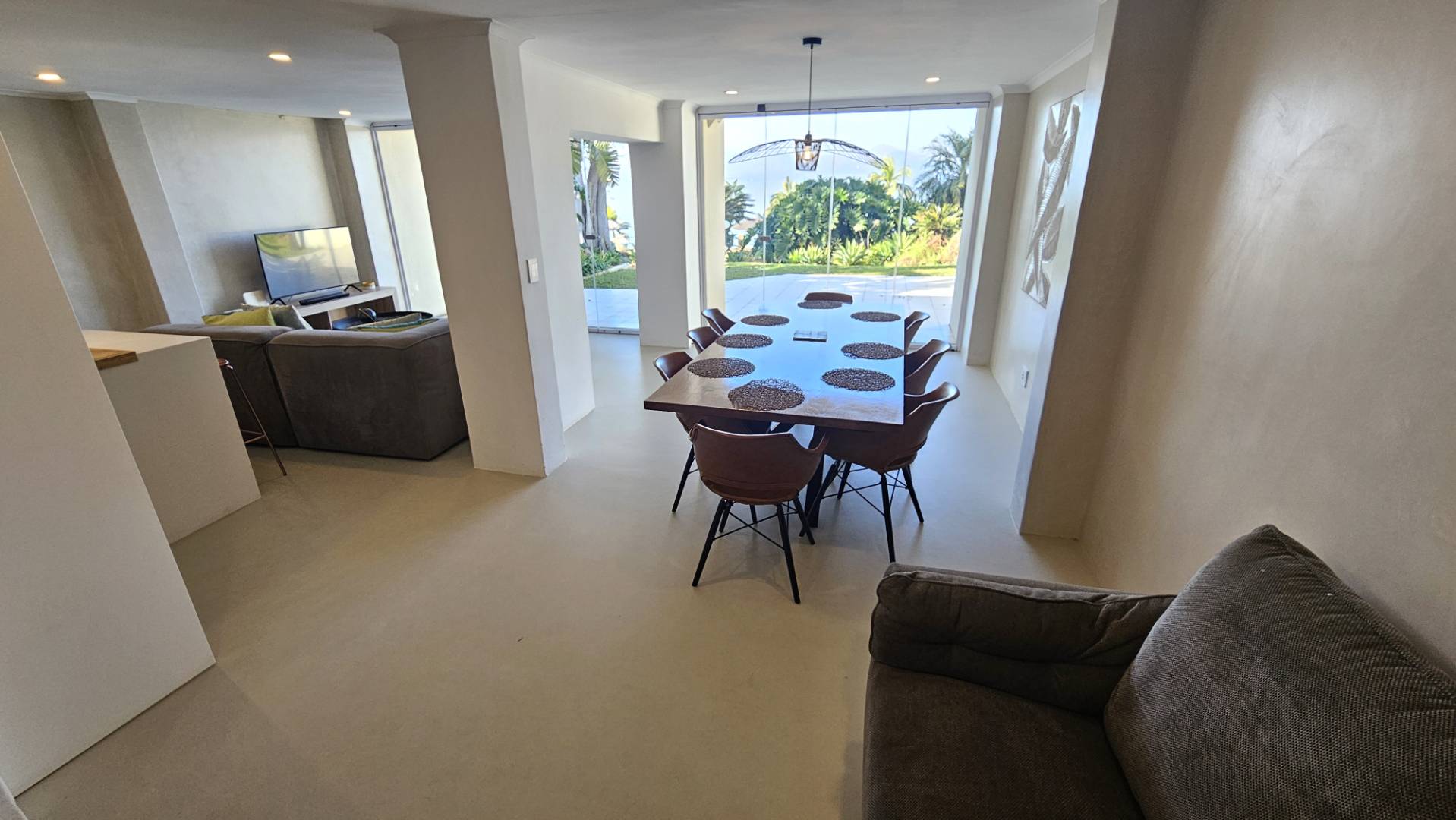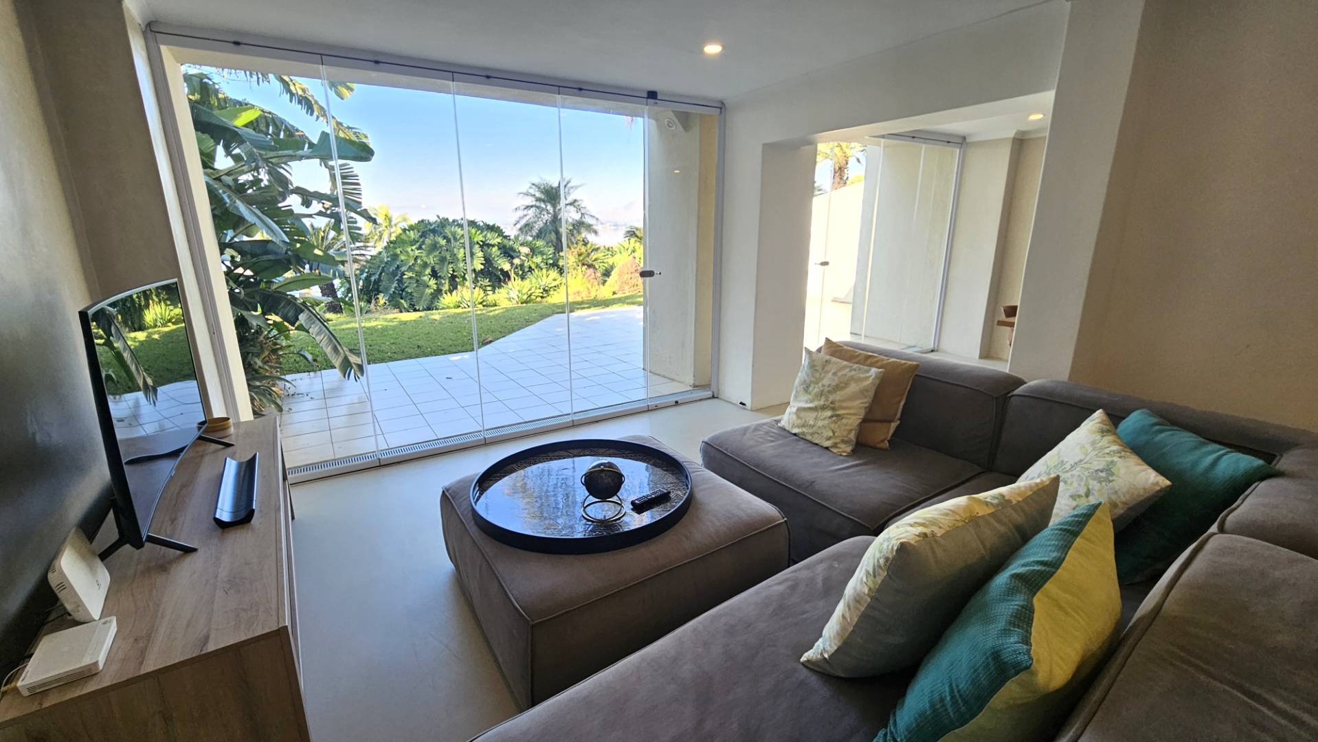 around, the lounge and dining area that have frameless stack doors open onto a patio to