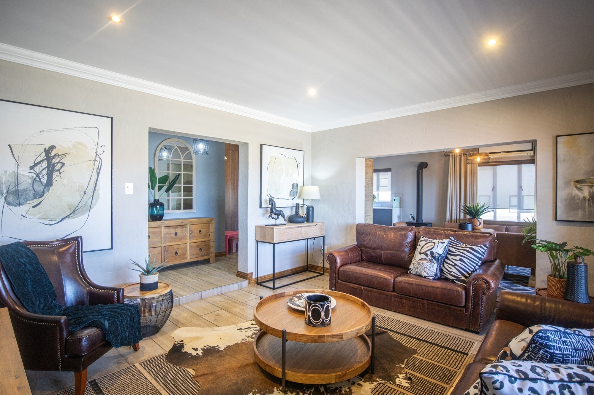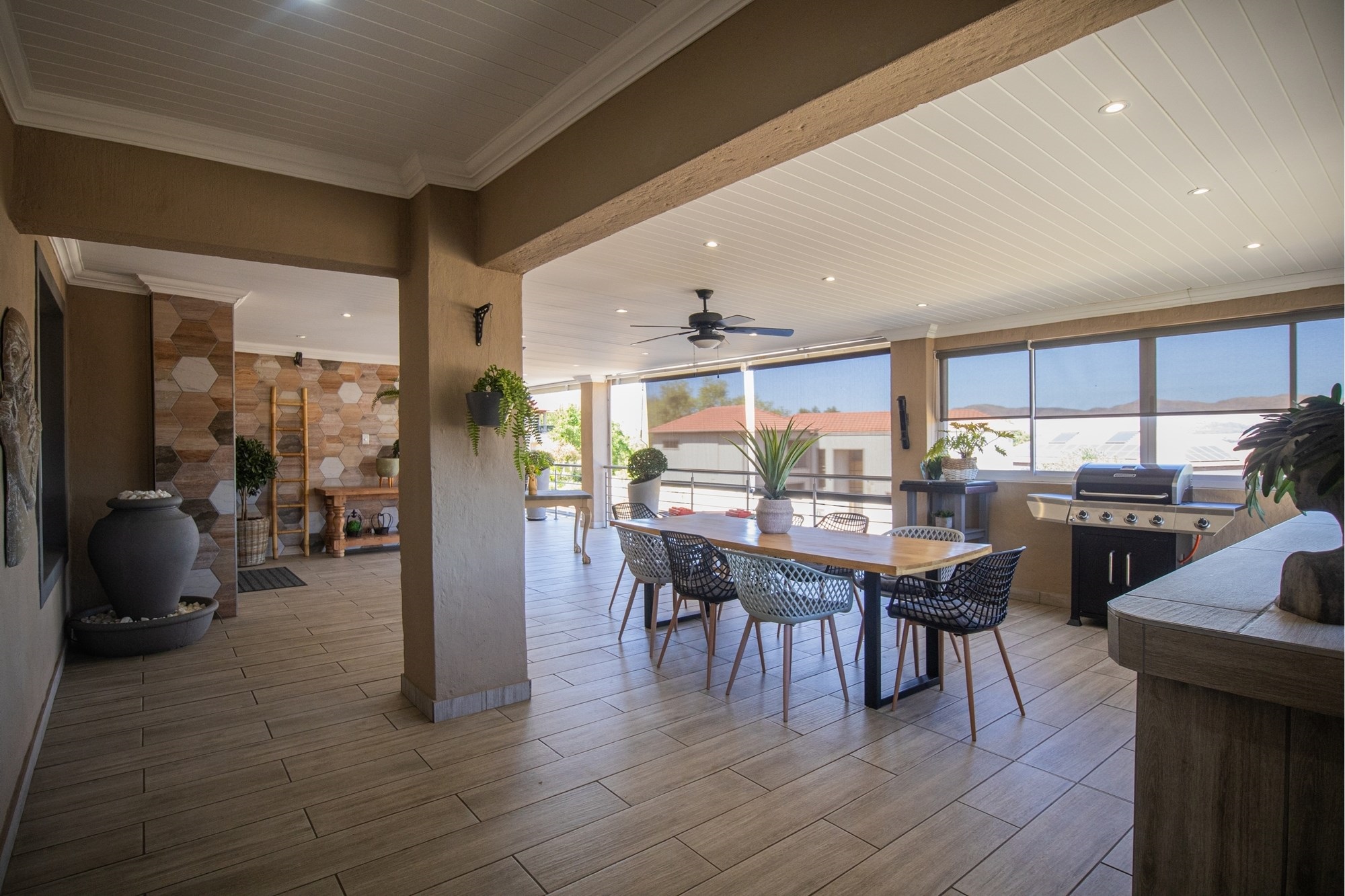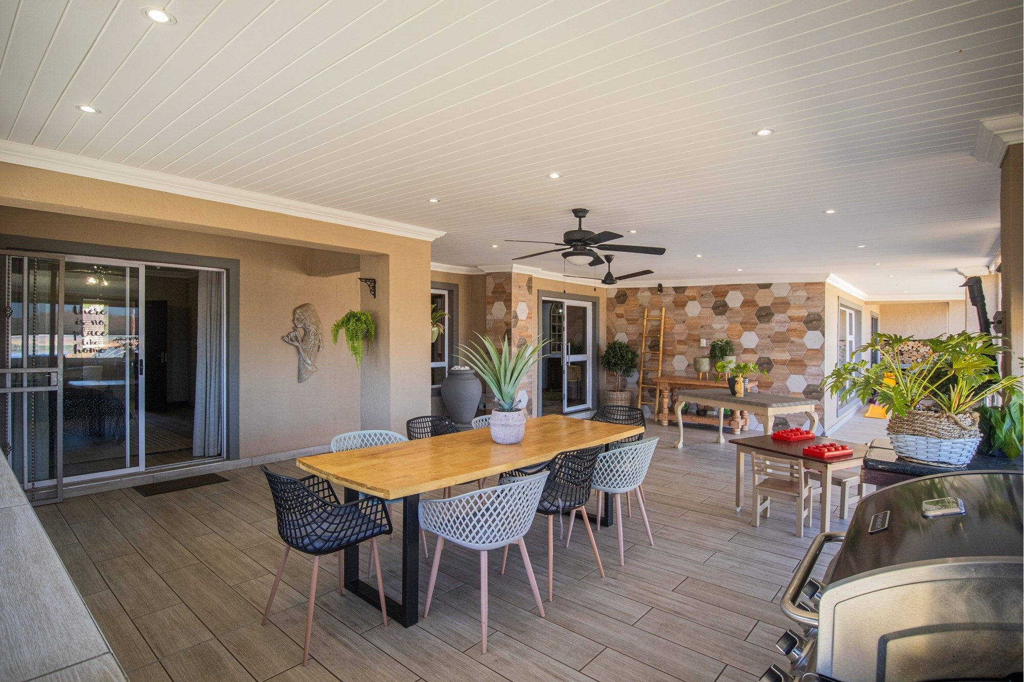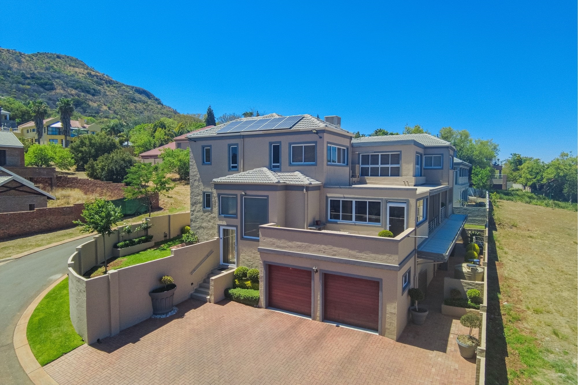 Welcome to this exquisite mansion in Kosmos Ridge, a dream home that exudes elegance and comfort. This picturesque property offers a spacious 4-bedroom layout, including a separate guest suite for added privacy and convenience. The large, welcoming patio is perfect for gatherings, featuring a built-in braai and canvas shade nets, creating a wonderful space for making lasting memories with family and friends.