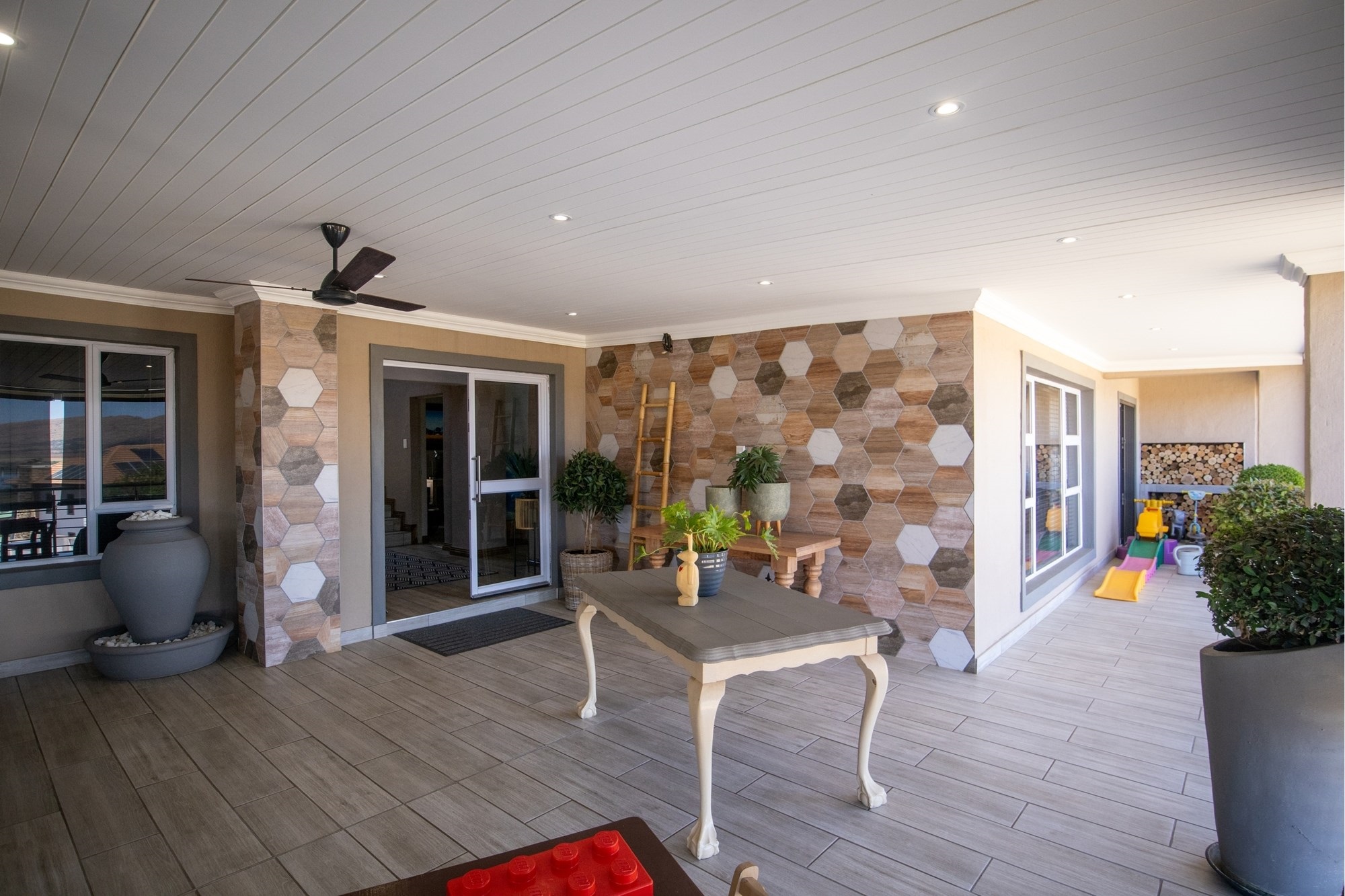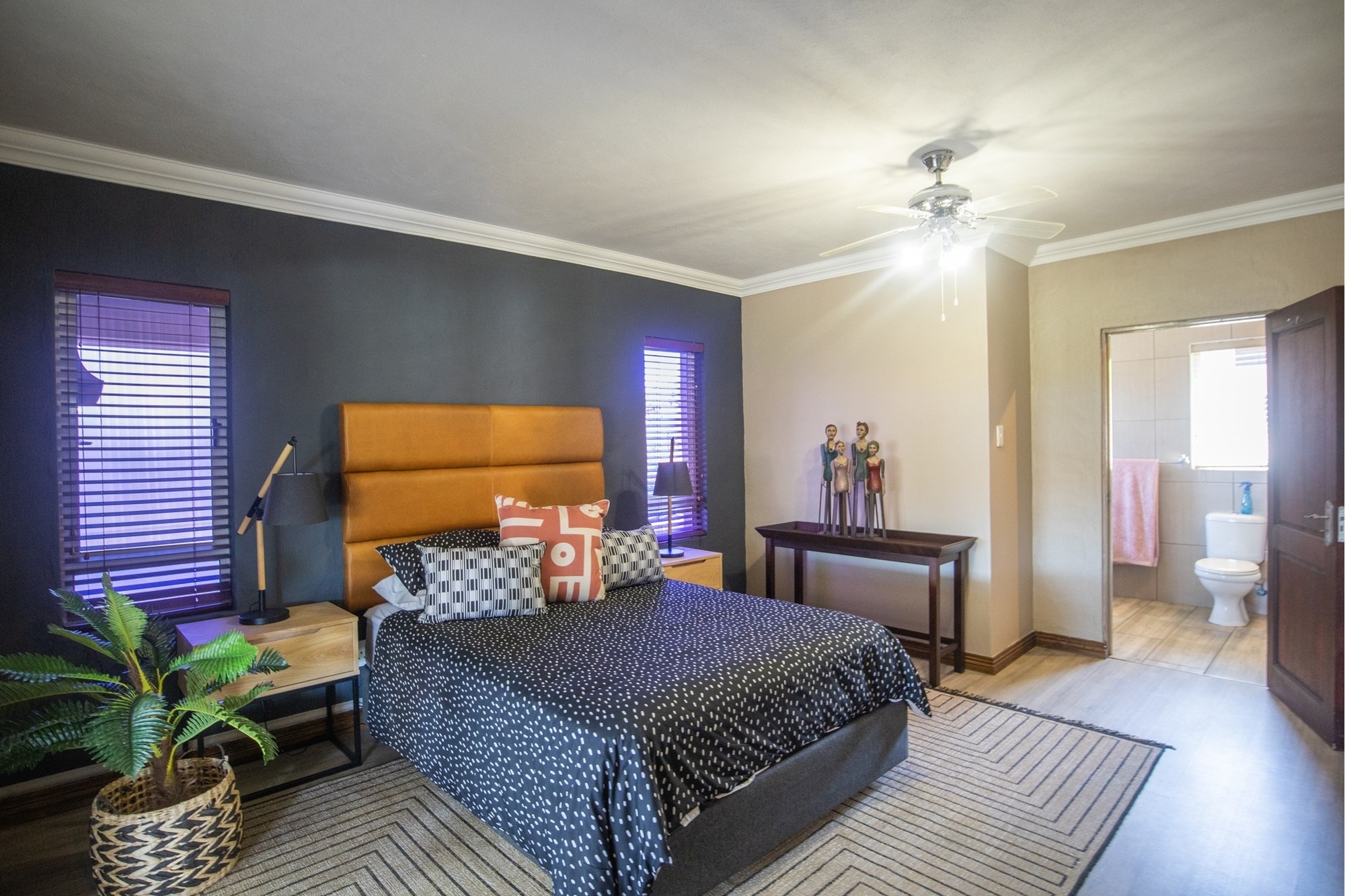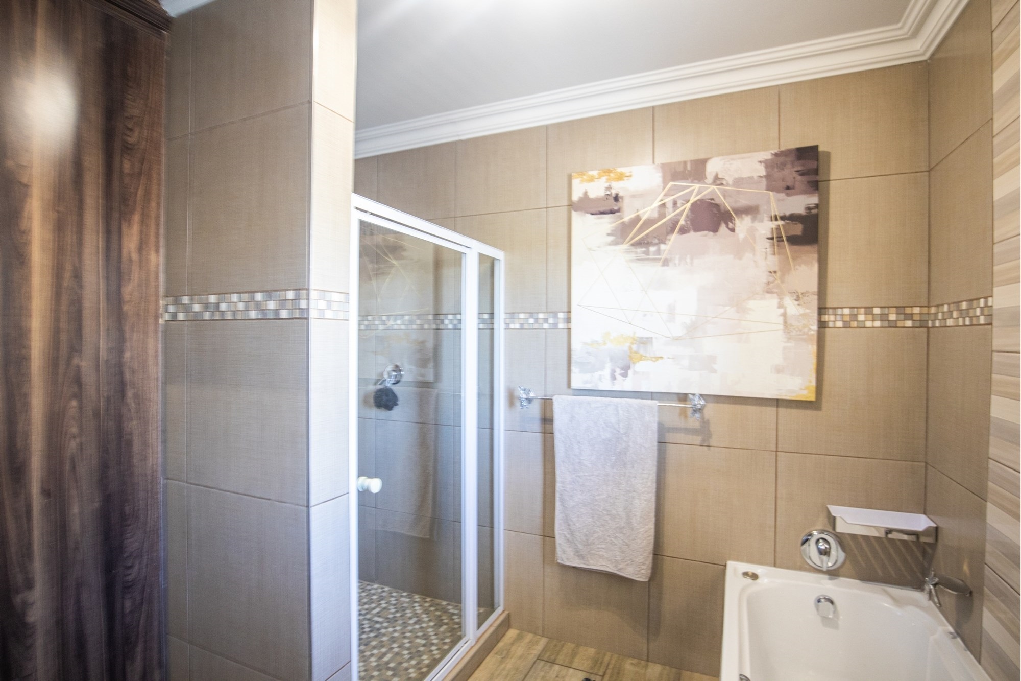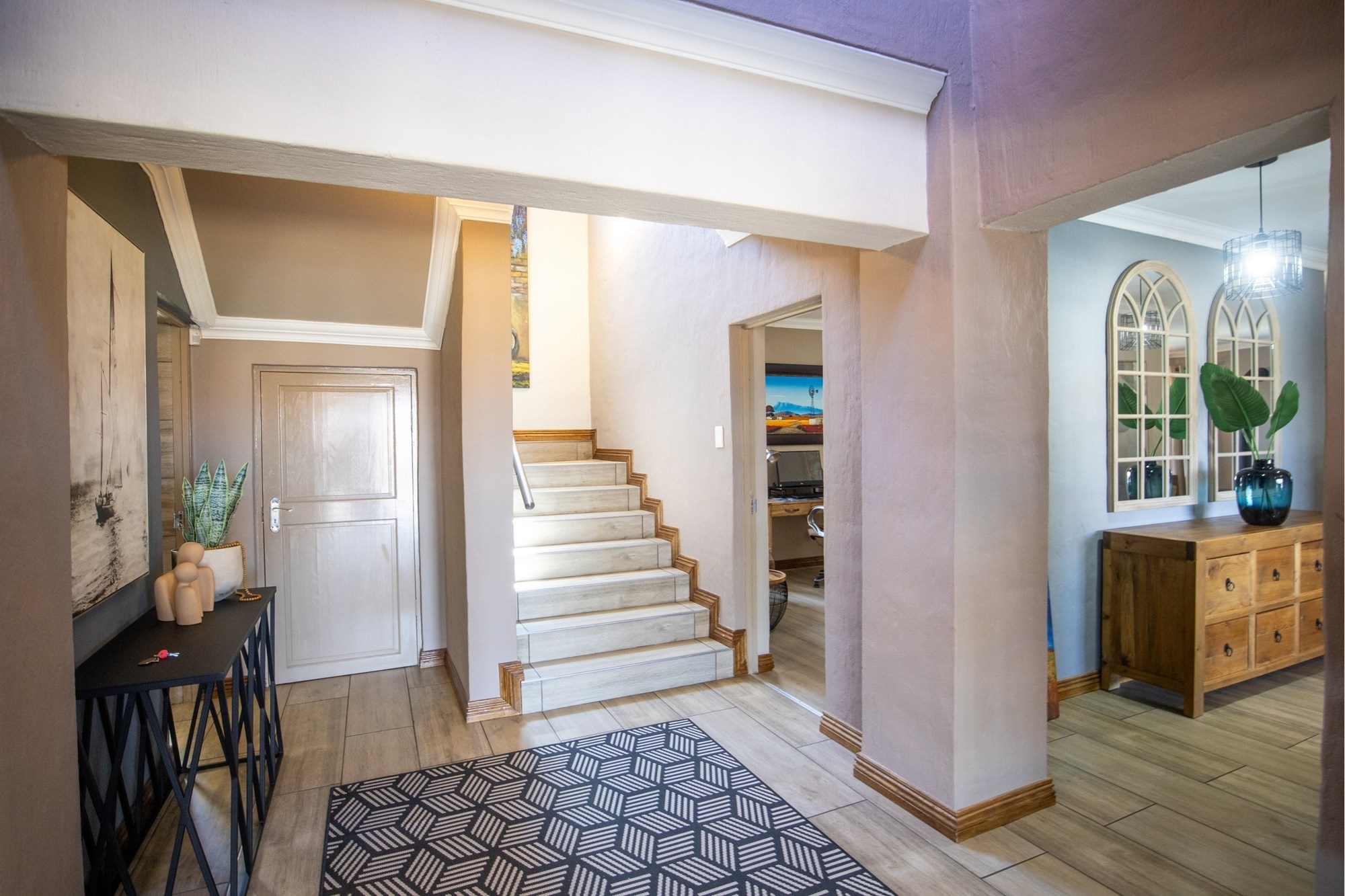 Welcome to this exquisite mansion in Kosmos Ridge, a dream home that exudes elegance and comfort. This picturesque property offers a spacious 4-bedroom layout, including a separate guest suite for added privacy and convenience. The large, welcoming patio is perfect for gatherings, featuring a built-in braai and canvas shade nets, creating a wonderful space for making lasting memories with family and friends.