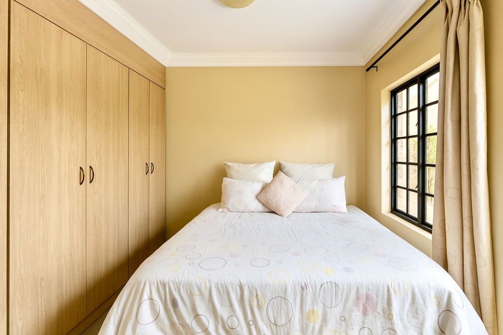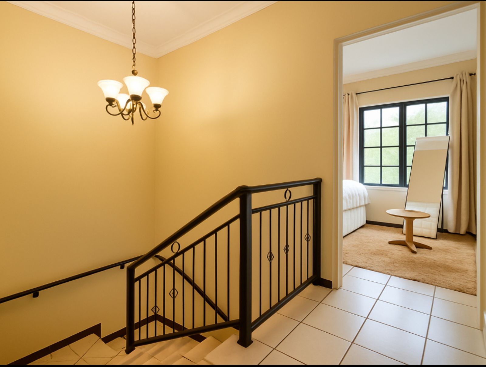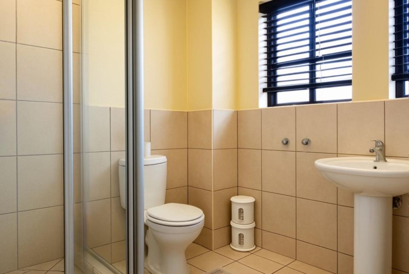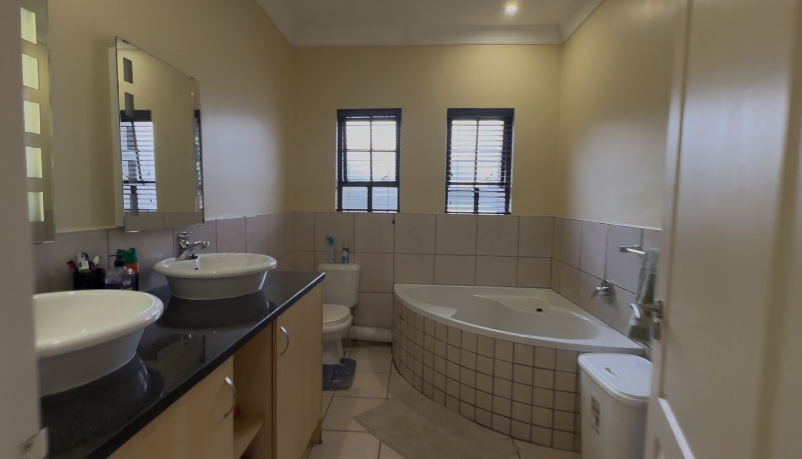Three well-lit, bright bedrooms upstairs with built-in cupboards – main en-suite with full bathroom (shower, double vanity, corner bath & toilet). The family bathroom serves the two guest bedrooms and can almost be viewed as a second en-suite with direct access through doors between the built-in cupboards. For convenience, there’s a guest toilet downstairs, so visitors don’t have to enter your private space.