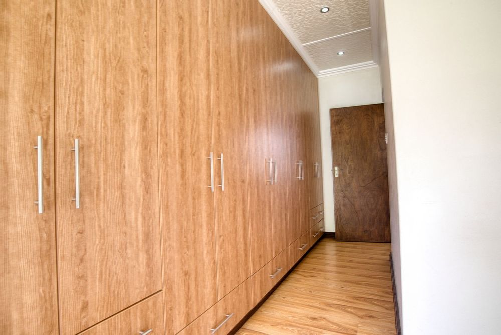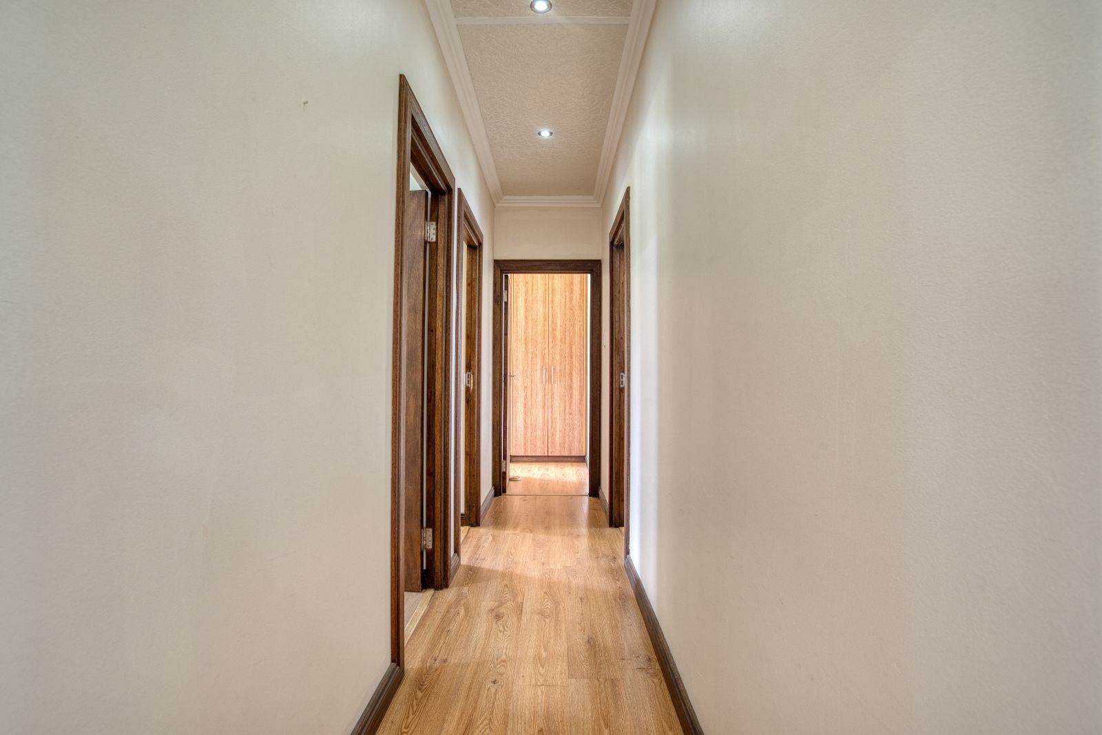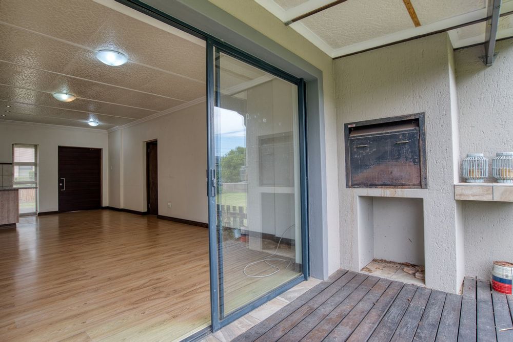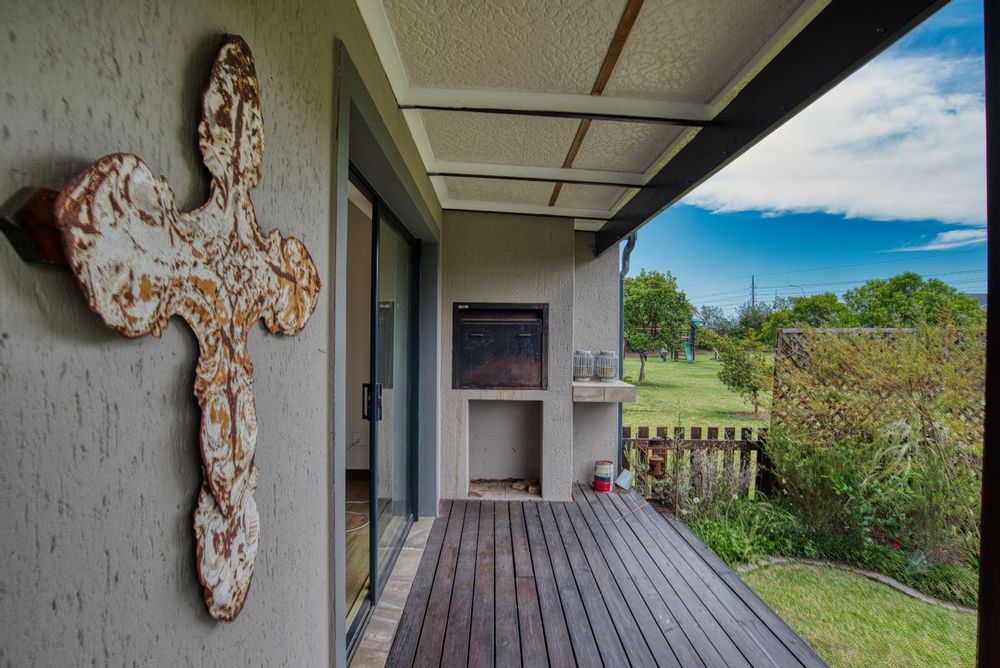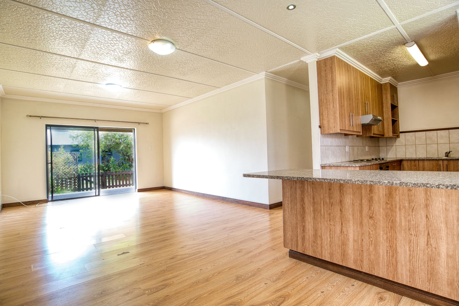 Step into a light-filled open-plan living area, where the modern kitchen is conveniently located to the right, creating a seamless flow ideal for everyday living and entertaining. The living space opens onto an undercover patio with built-in braai, perfectly positioned to overlook a peaceful greenbelt, offering privacy and tranquil views.