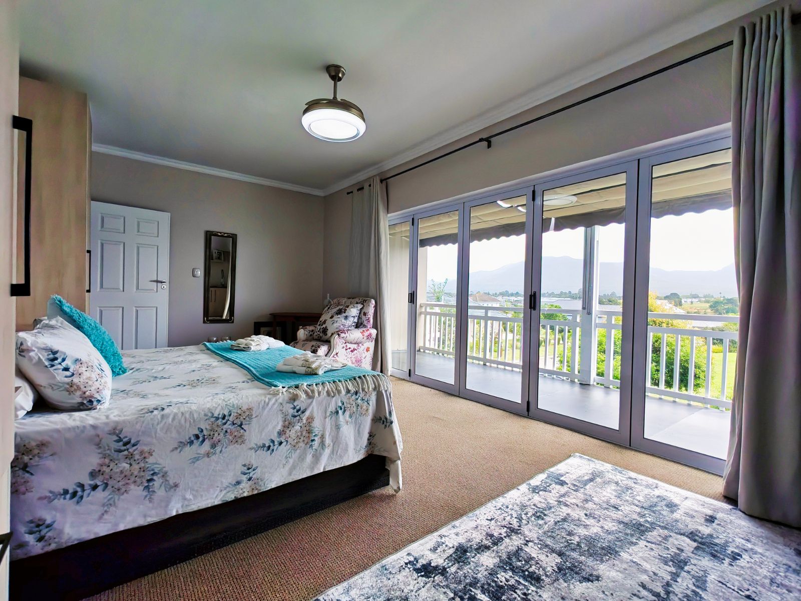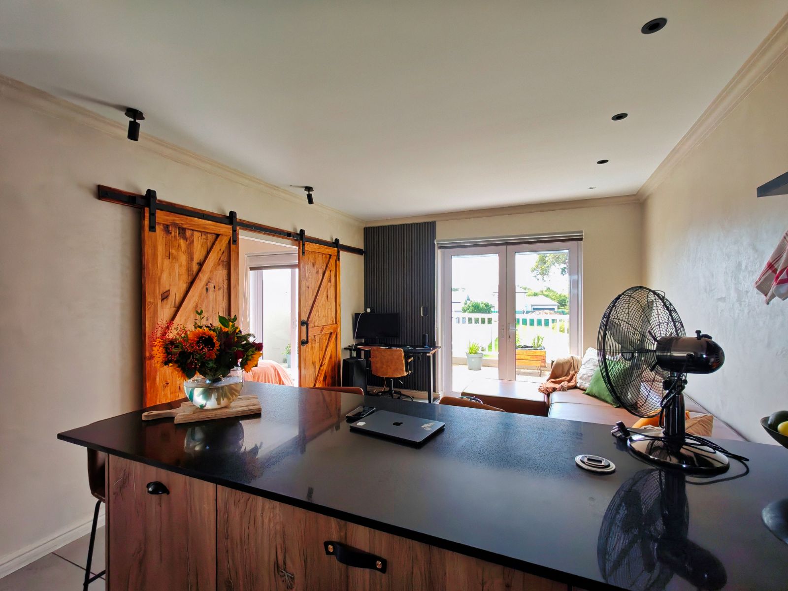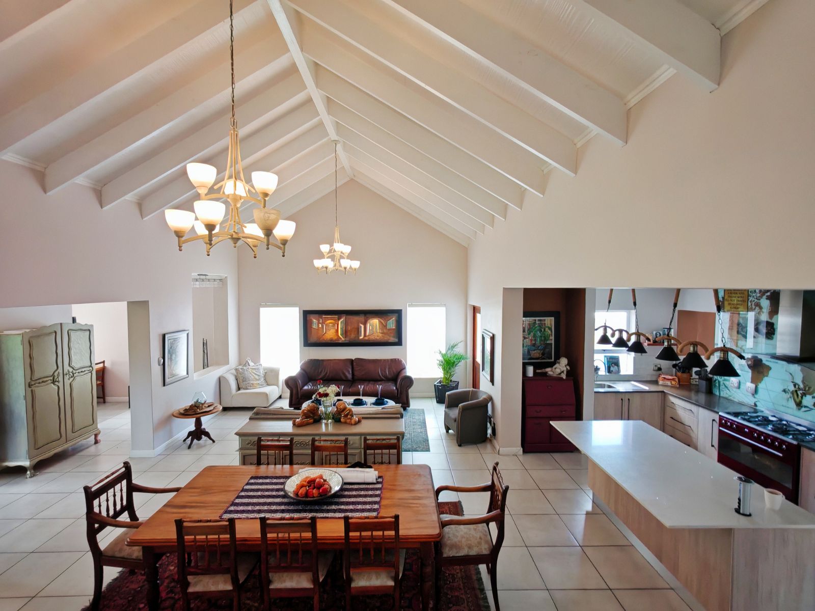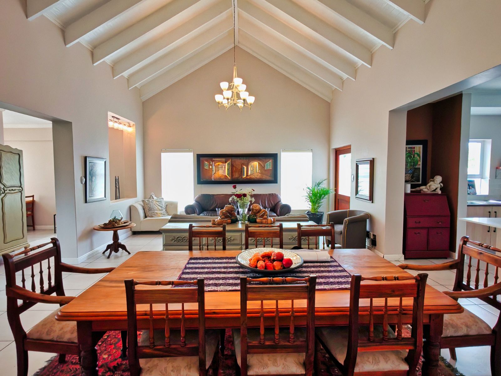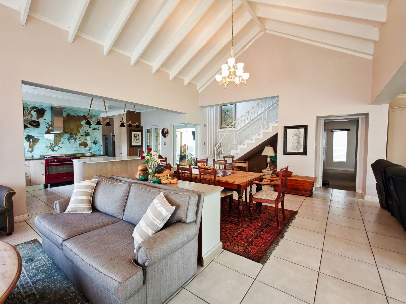The home features four generously sized bedrooms, including a luxurious main suite with an en-suite bathroom. The open-plan living and dining areas flow seamlessly into a stylish kitchen equipped with high-end appliances, ample storage, and a separate scullery. Large sliding doors lead to a covered patio, perfect for outdoor entertaining.
