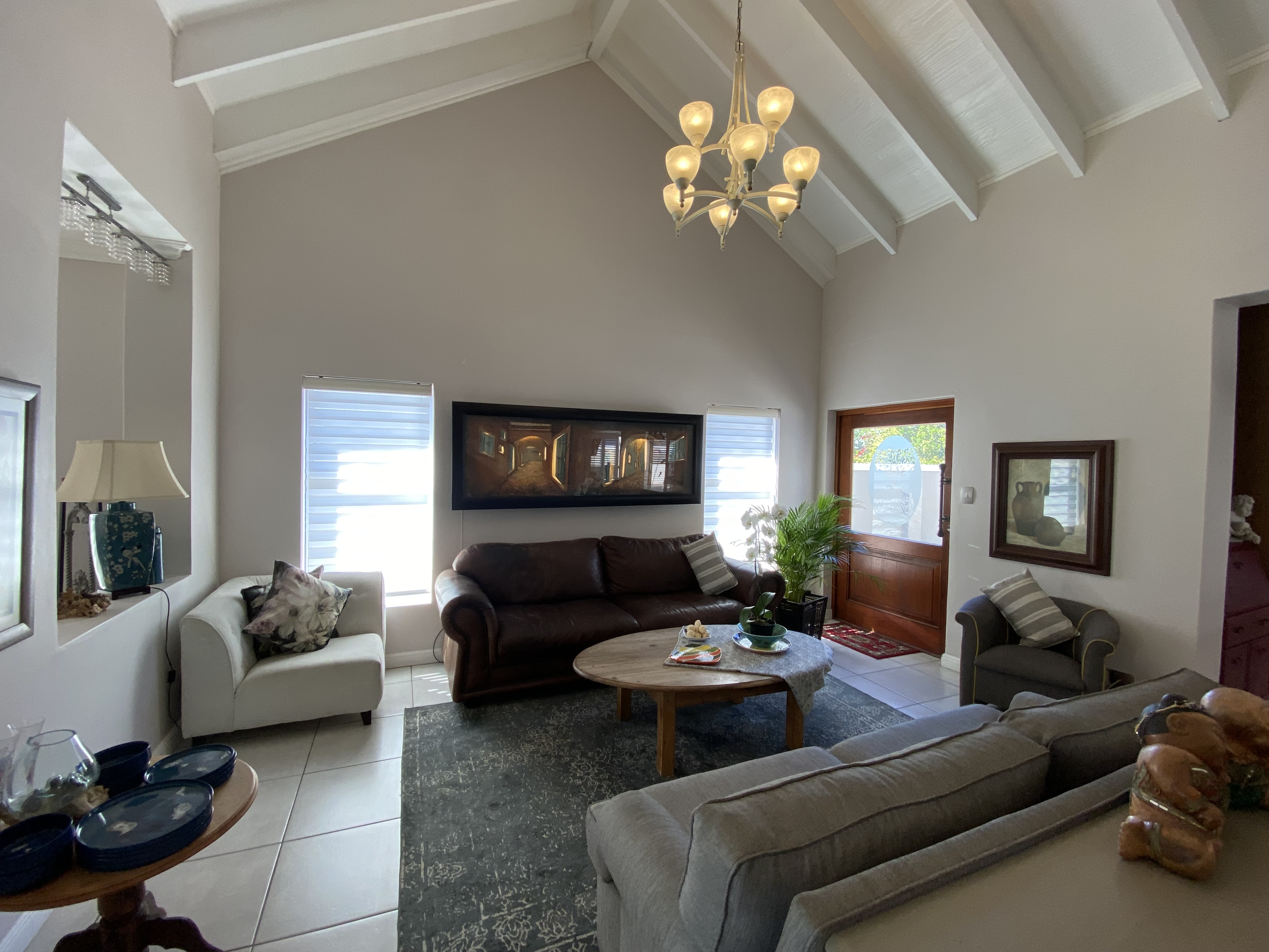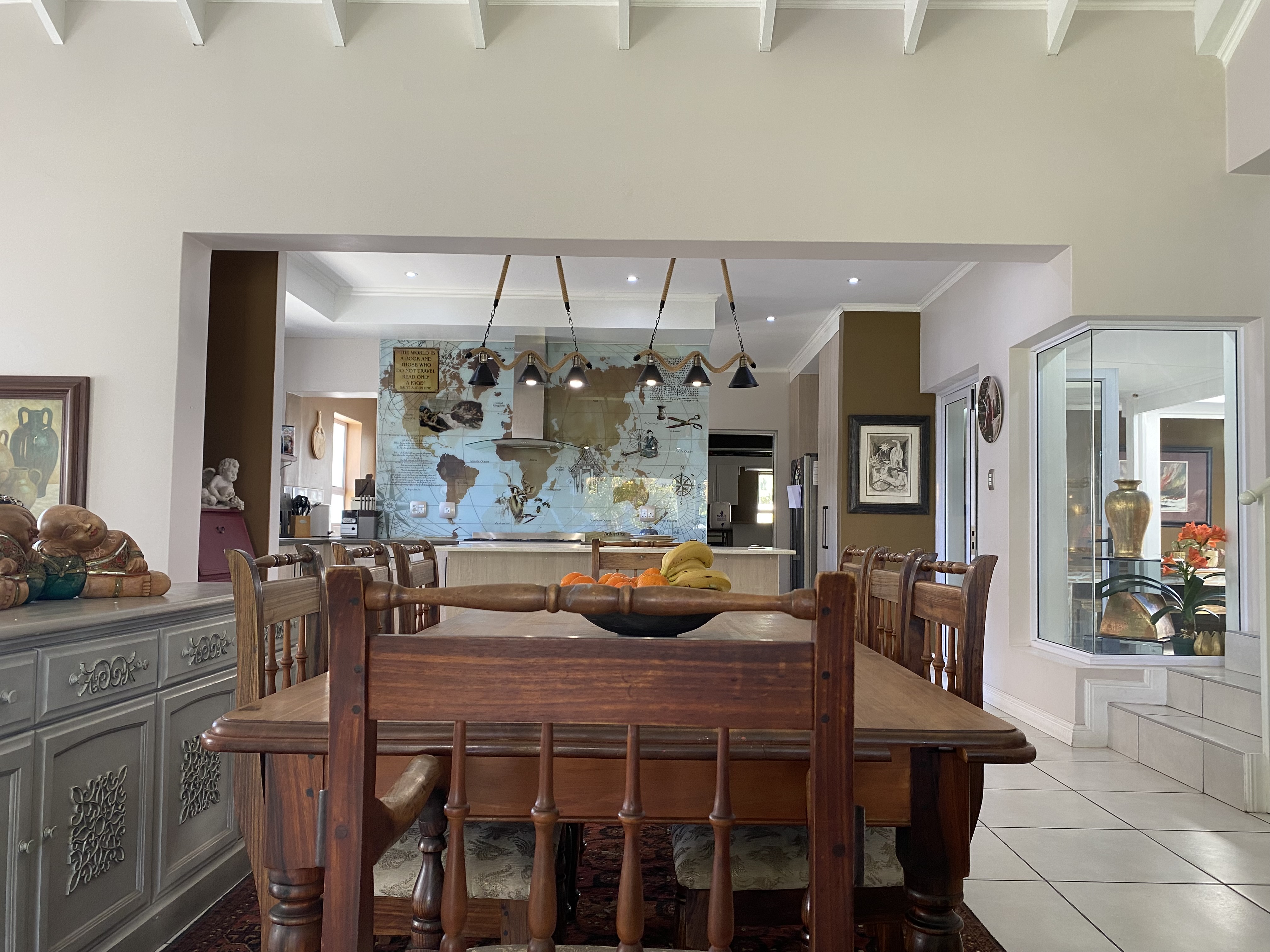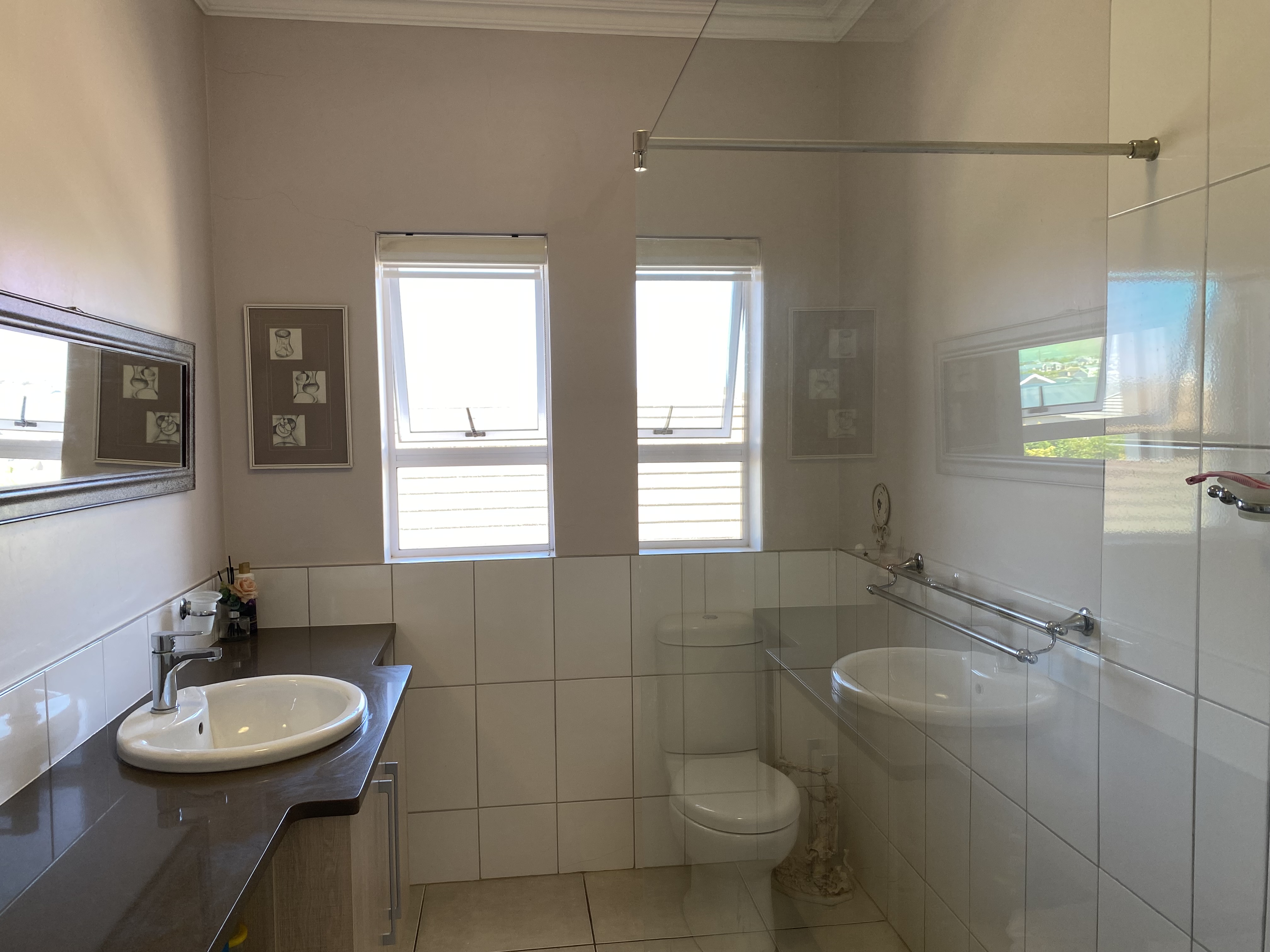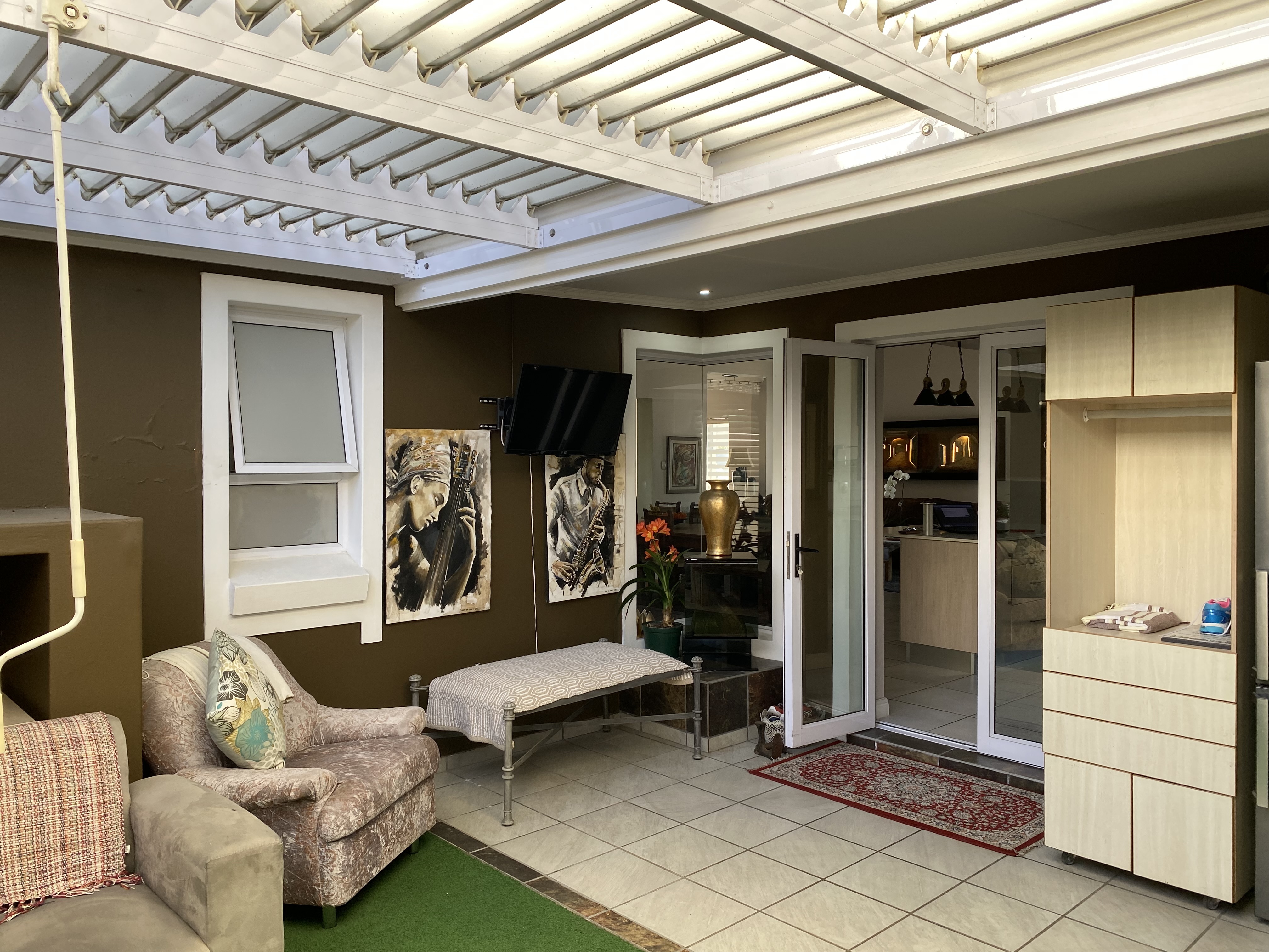 Additional features include double automated garage, ample parking outside for up to four vehicles, with extra space alongside the garage for additional parking, and a separate scullery leading to a covered courtyard. The courtyard is enclosed with security shutters and a louvre awning, providing versatility for both sunny and rainy days. The 5KVA Inverter, two batteries and 12 solar panels will ensure that you wont experience any load shedding.