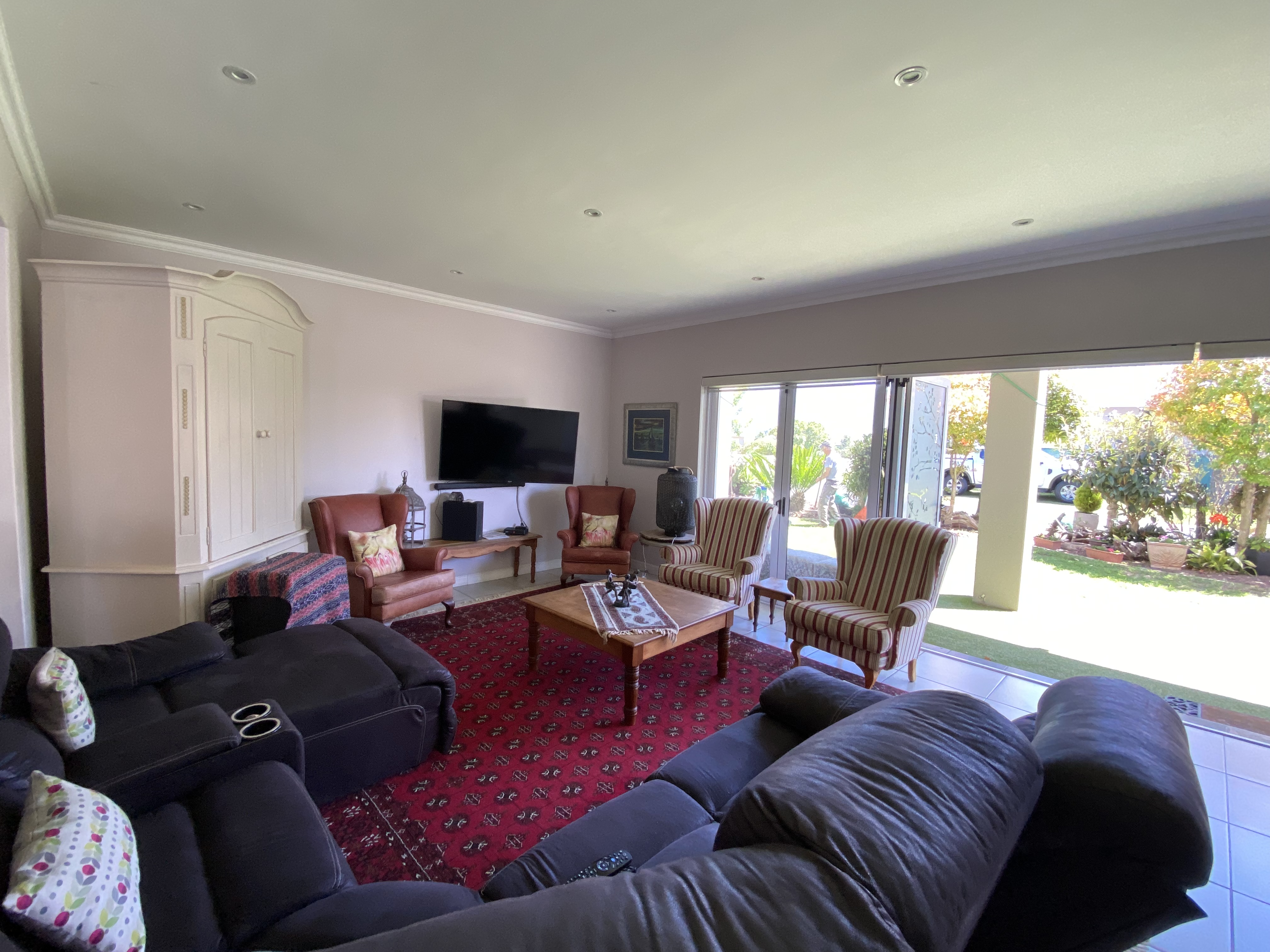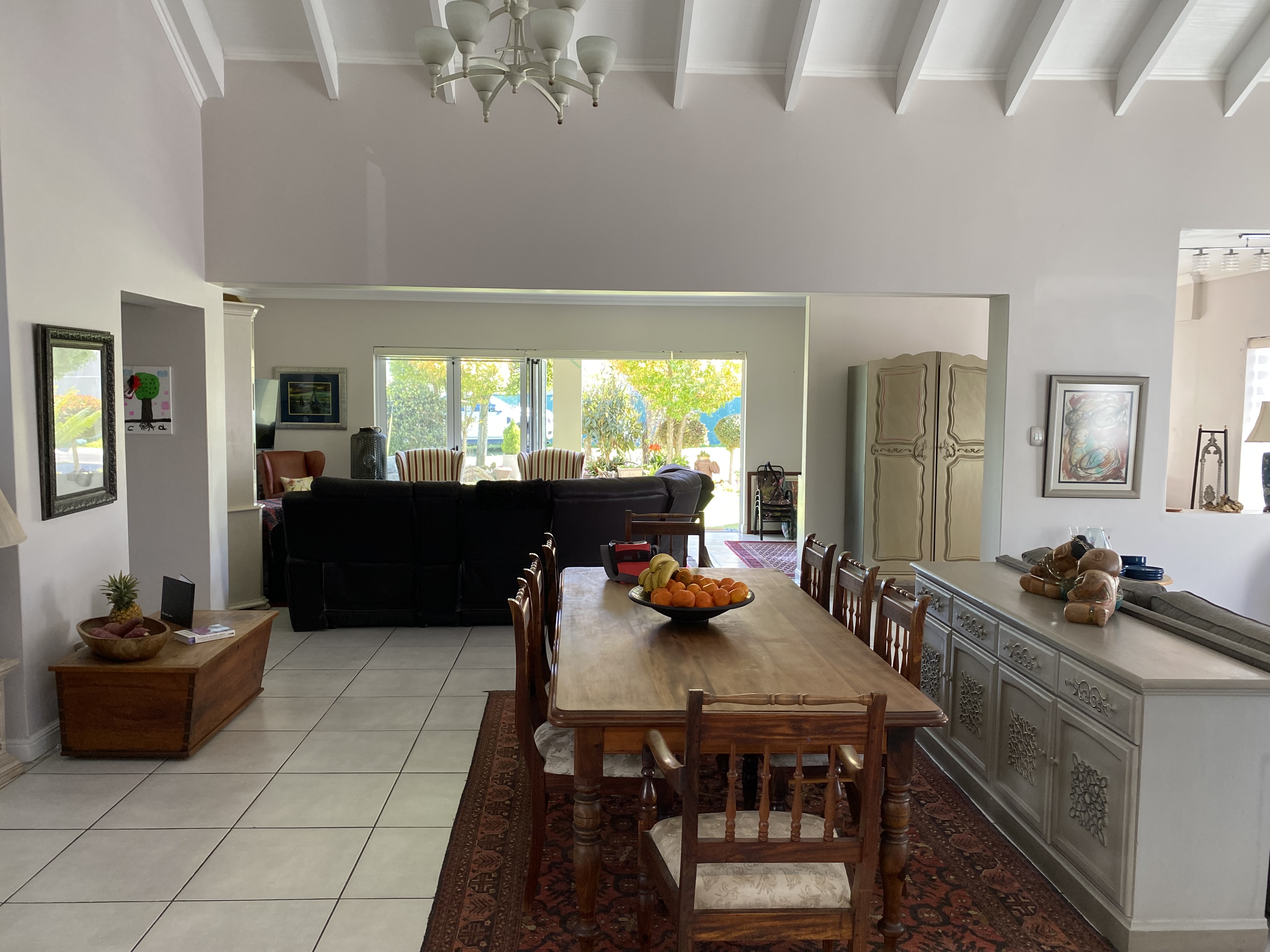 Designed with modern family living in mind, the spacious open-plan layout with the elevated ceilings flows effortlessly from the contemporary kitchen through the dining, sitting, and TV room - complete with a built-in braai and stacking doors that open to a beautifully well established garden and from here, you can soak in the serene views of the majestic Outeniqua Mountains.