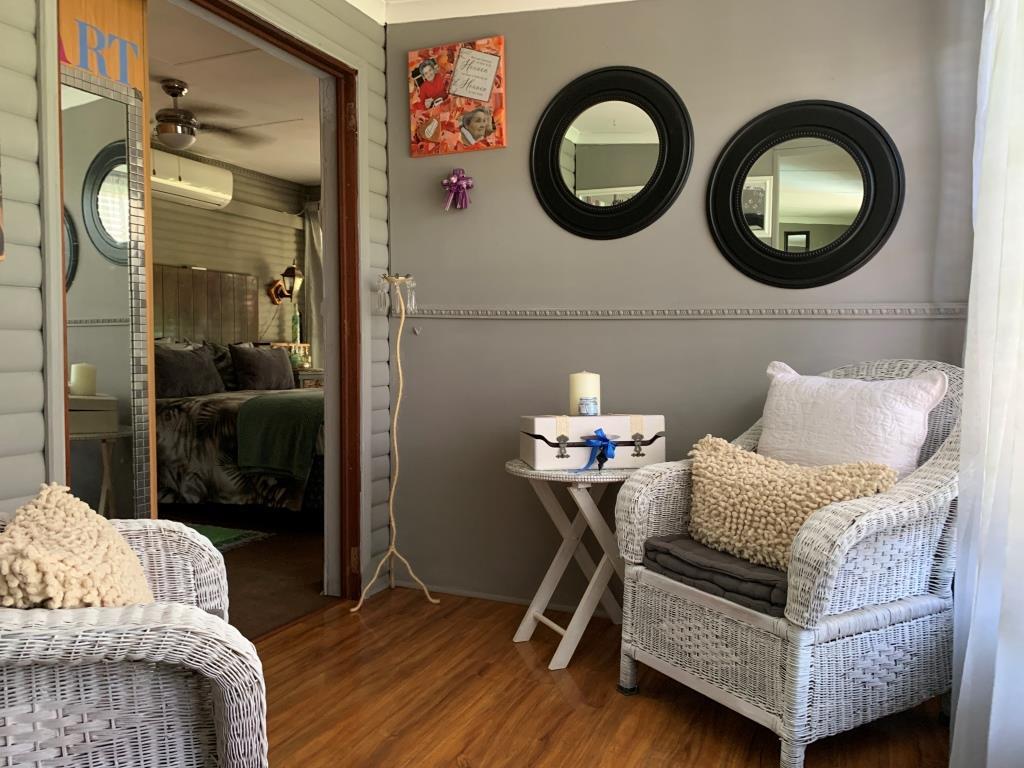 Lounge & Bar Area: A short walkway with a gangplank leads to a separate lounge with a built-in bar and a small deck overlooking the lush lawn and parkland where wildlife roams freely.