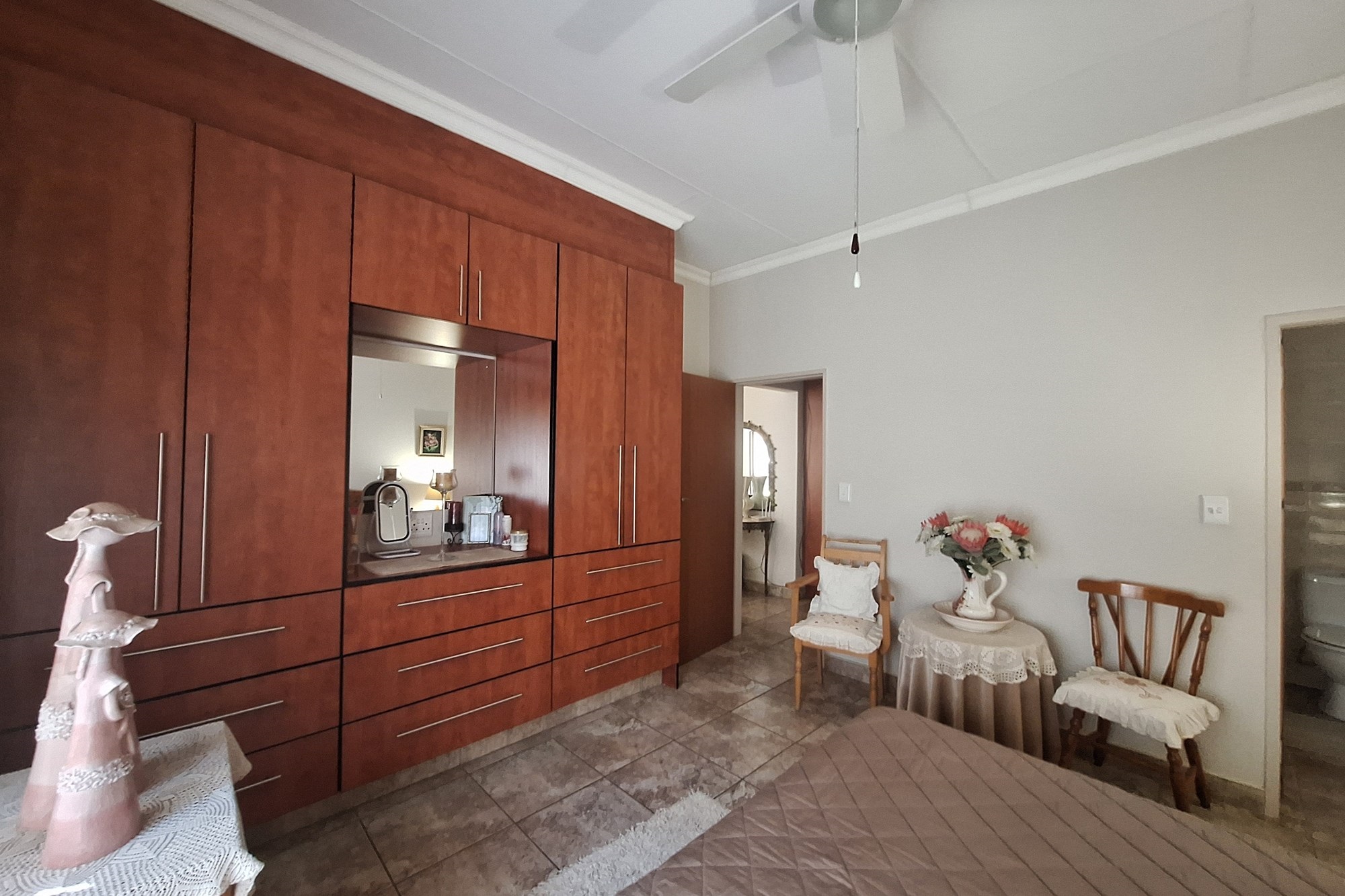 The home includes three bedrooms and three bathrooms, two of which are en-suite. The main bedroom is spacious with ample cupboards. pajama lounge and a full bathroom. The open-plan living and kitchen area creates a welcoming flow, while the modern kitchen features granite countertops, a pantry, and a separate scullery. The guest suite also has its own bathroom, and the third bedroom is perfect as a single room, study, or hobby space.