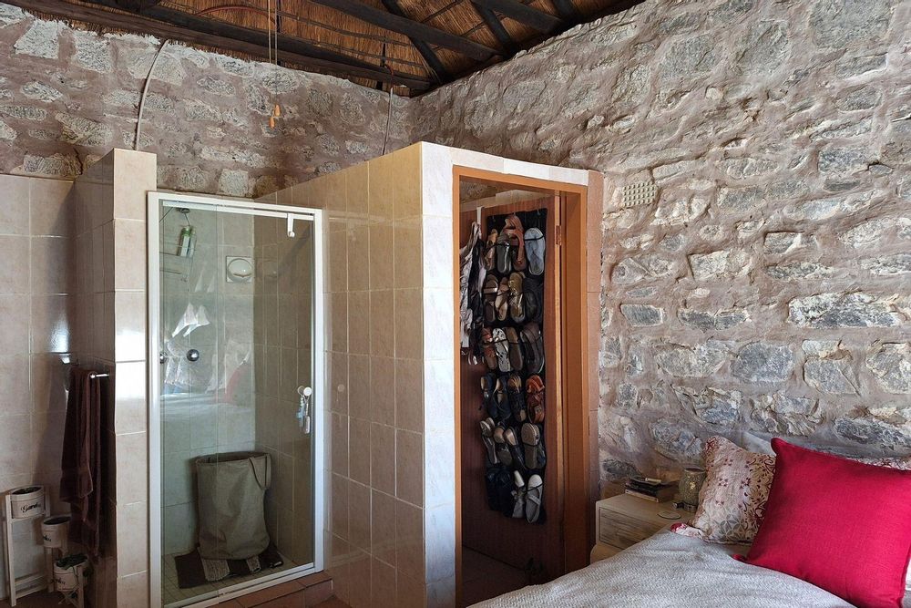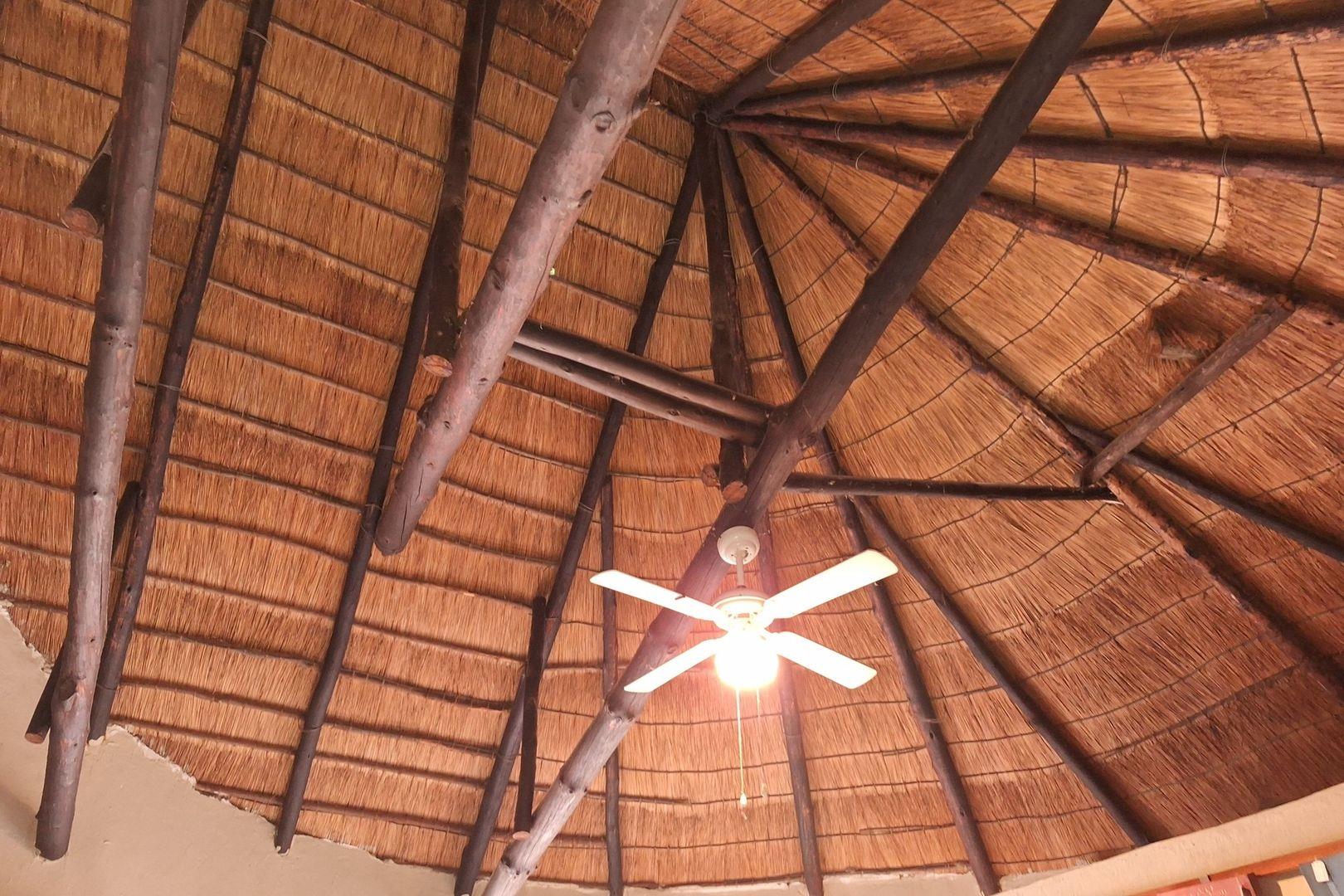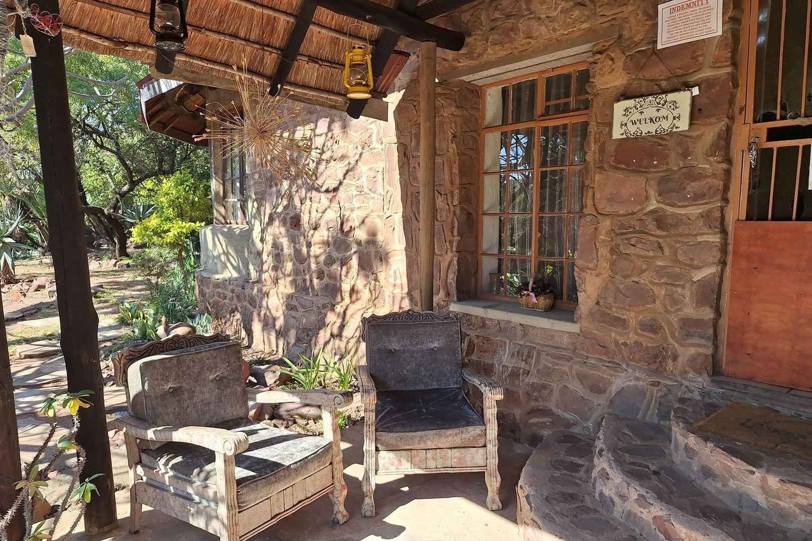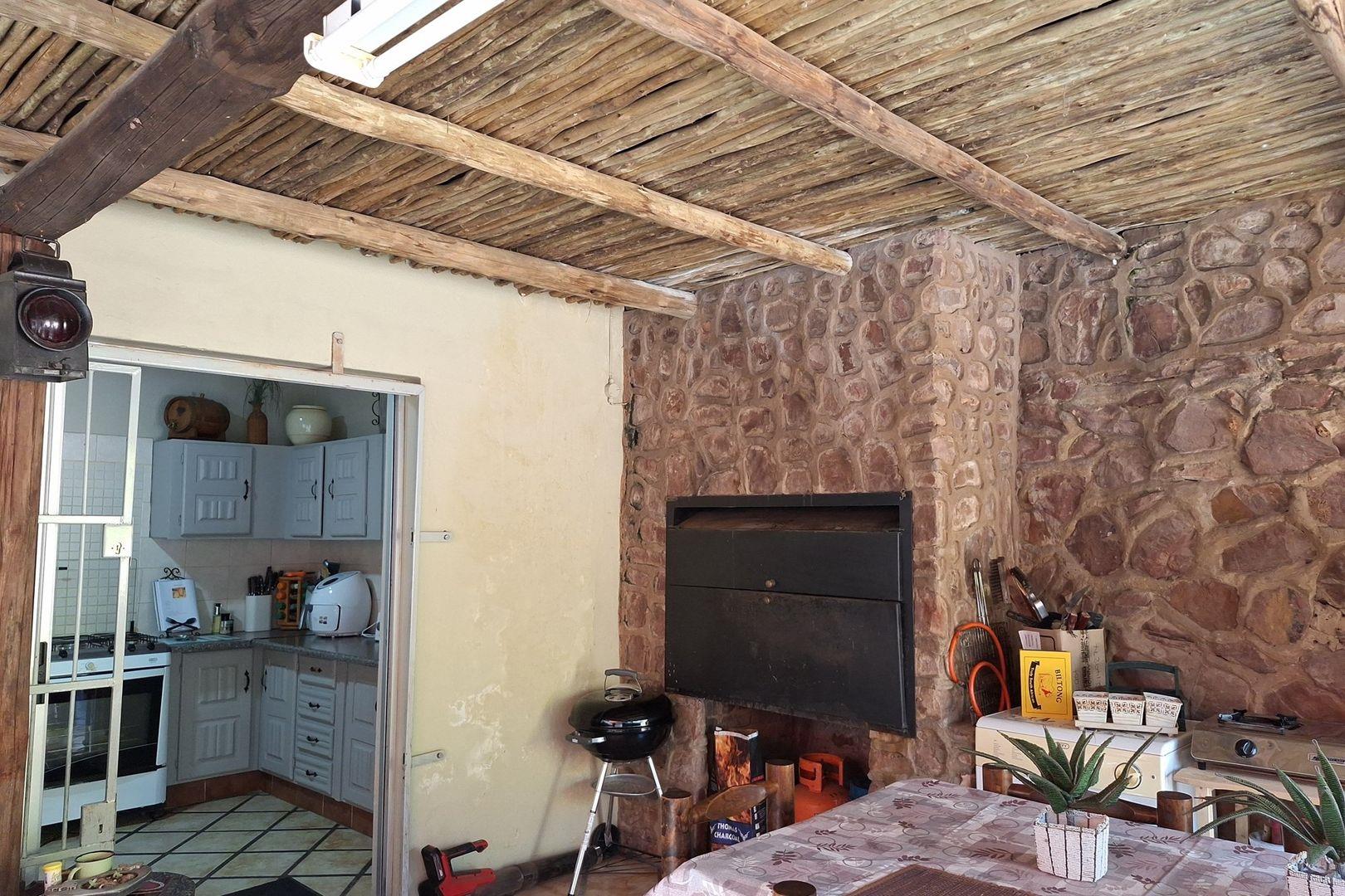 Covered patio and braai room with natural stone walls and timber beams