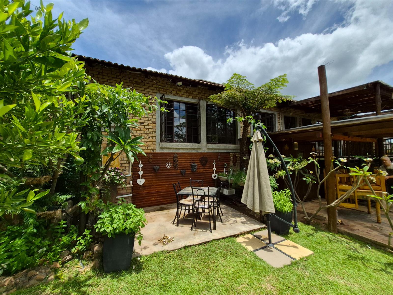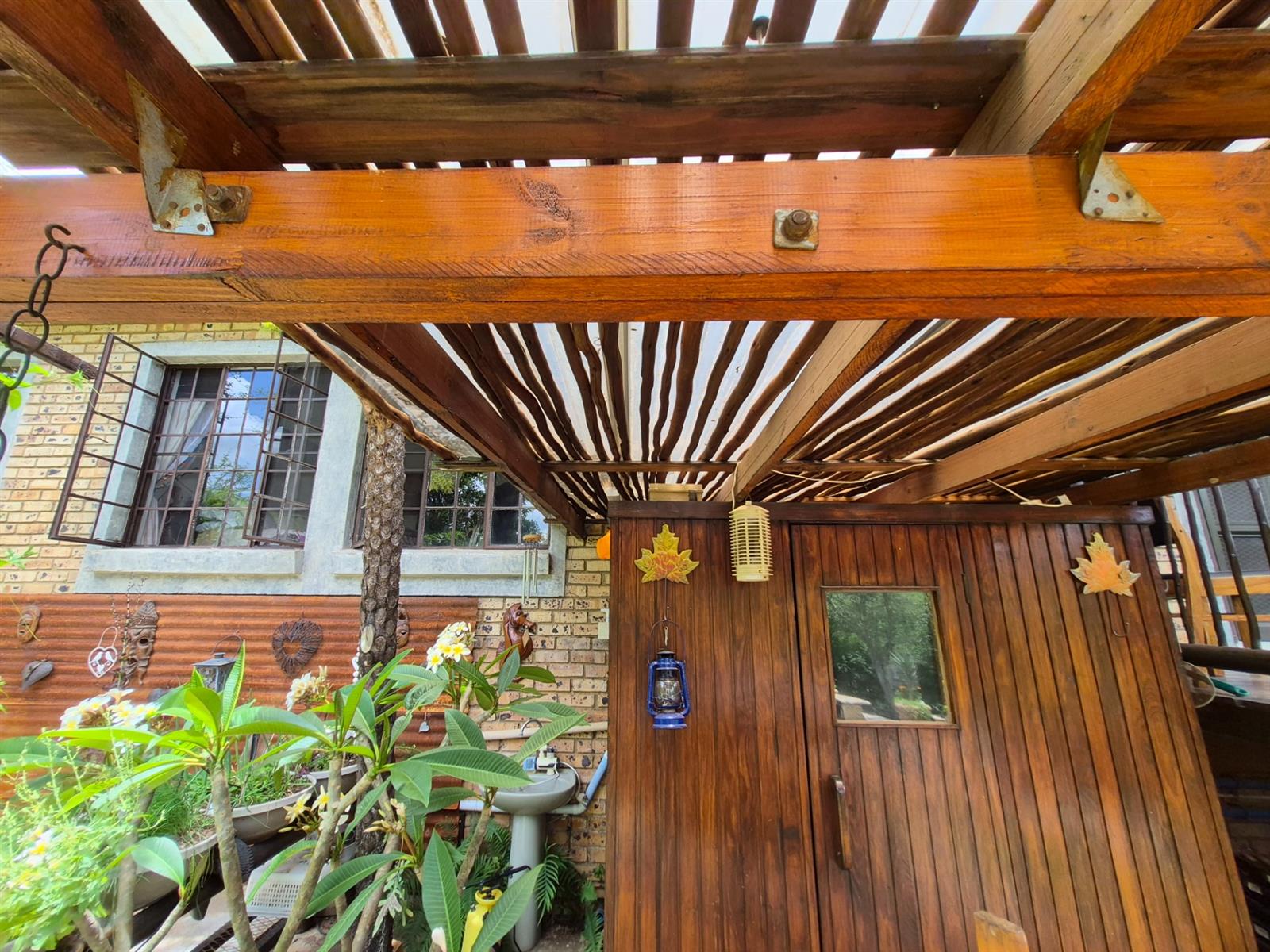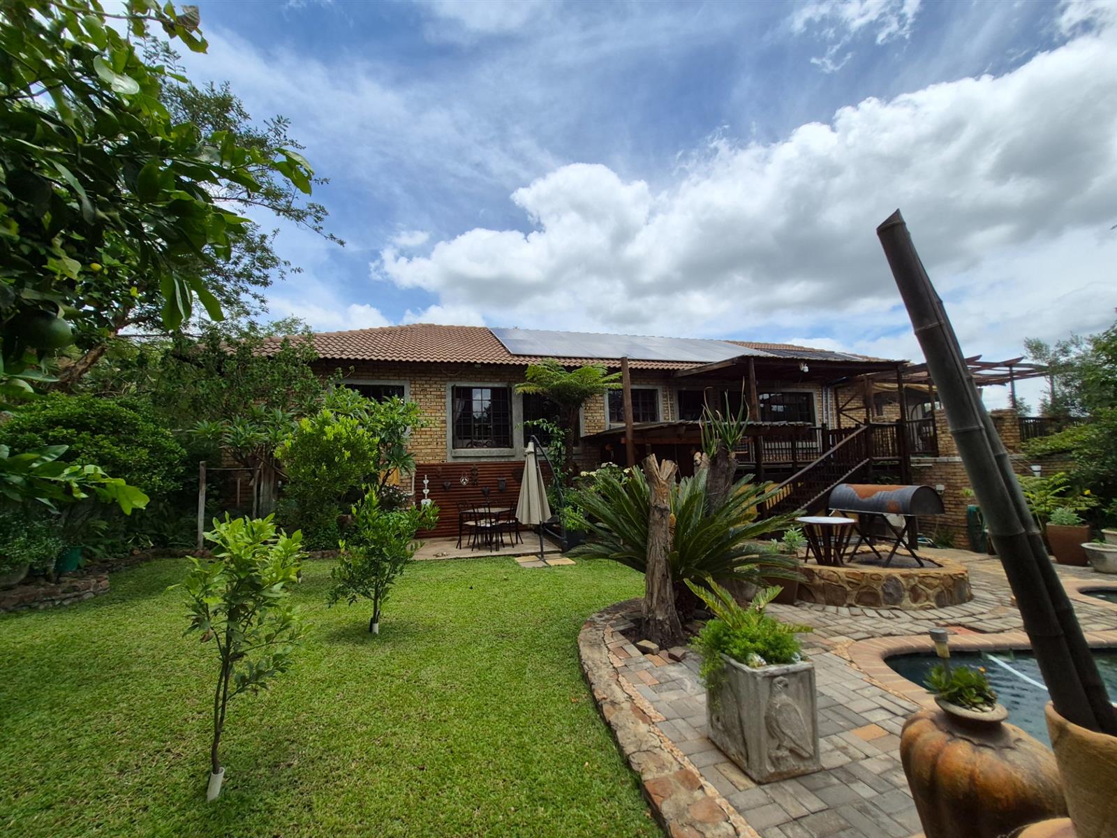 Outside, the lifestyle truly comes into its own. The established garden is both beautiful and productive, supported by a borehole and automated sprinkler system. A vegetable garden, fig and lemon trees, and a grapevine allow you to enjoy fresh produce straight from your own garden. The heated swimming pool, sauna, and multiple outdoor relaxation areas create a setting that feels more like a retreat than a residence.