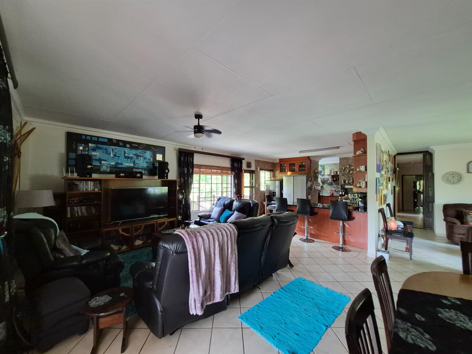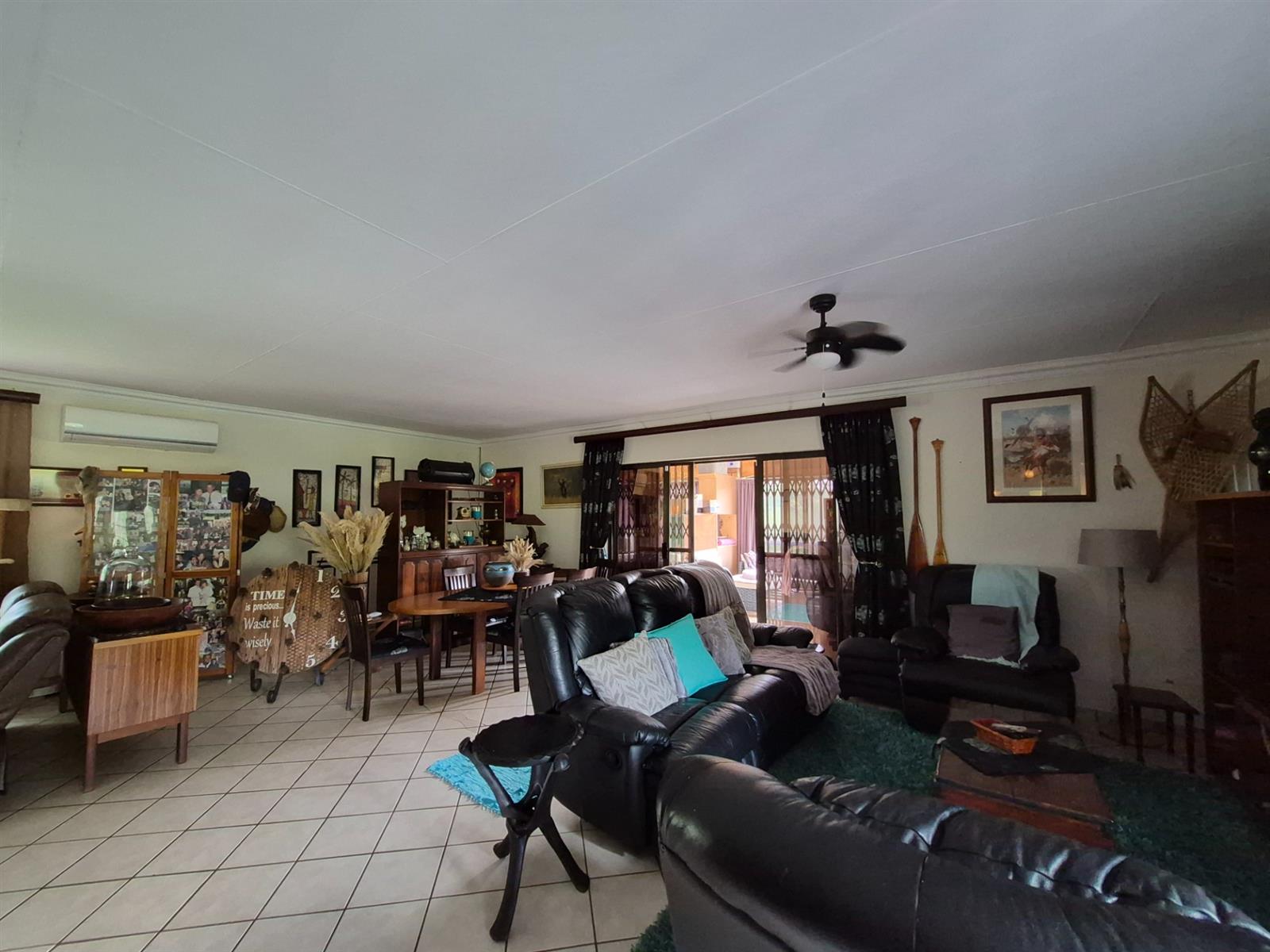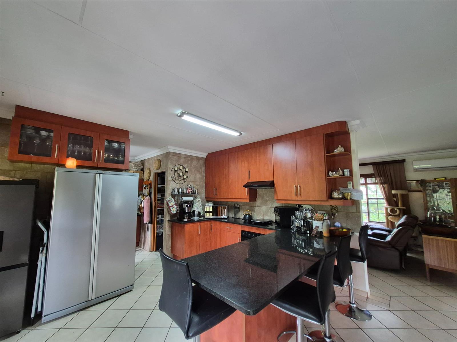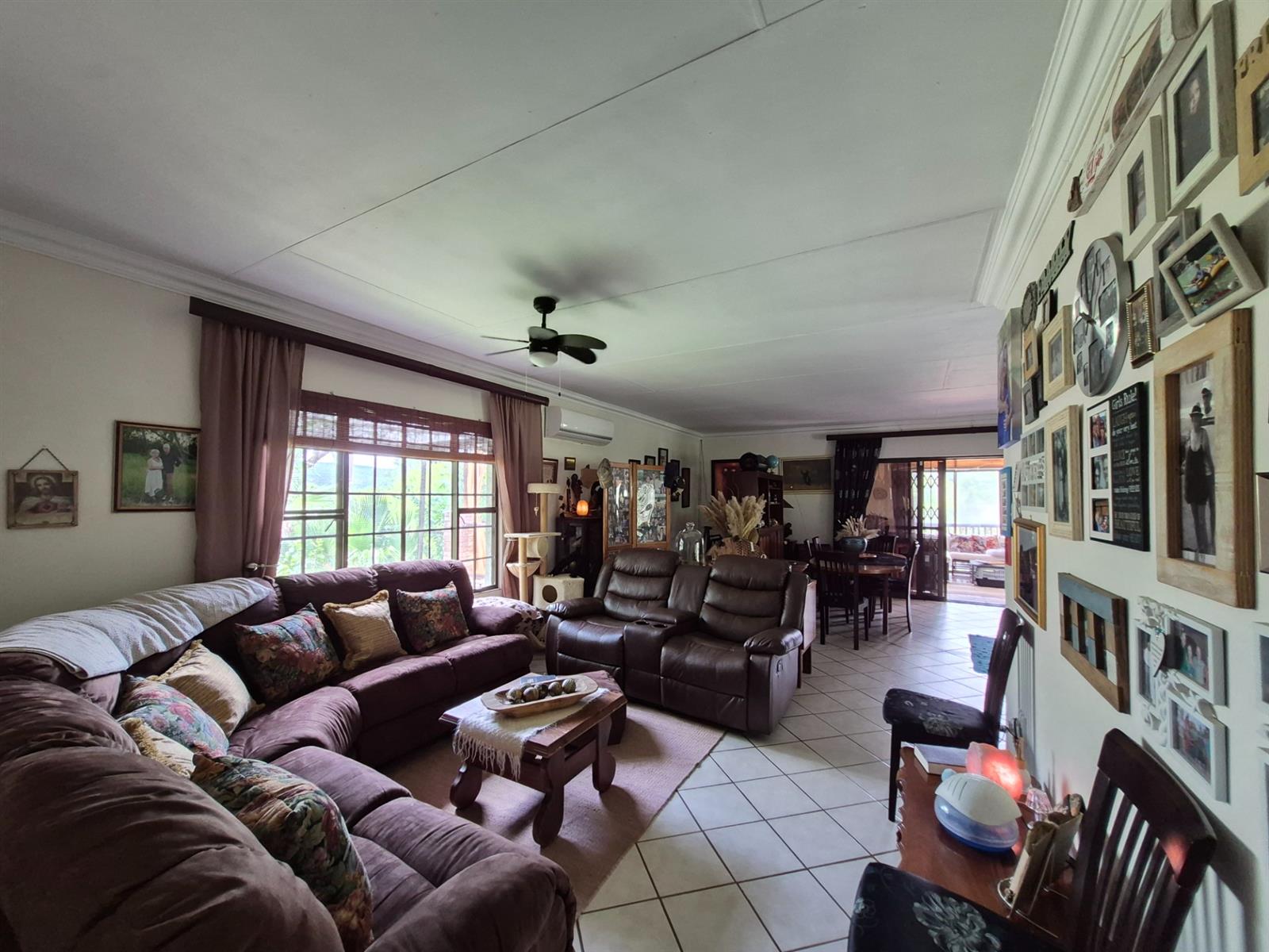 The living and dining areas are spacious and versatile, perfectly suited to both relaxed family living and effortless entertaining. From here, aluminium sliding doors open onto a covered entertainment stoep and balconies on either side, giving you a choice of settings – from lively braais to quiet moments overlooking the garden and pool.