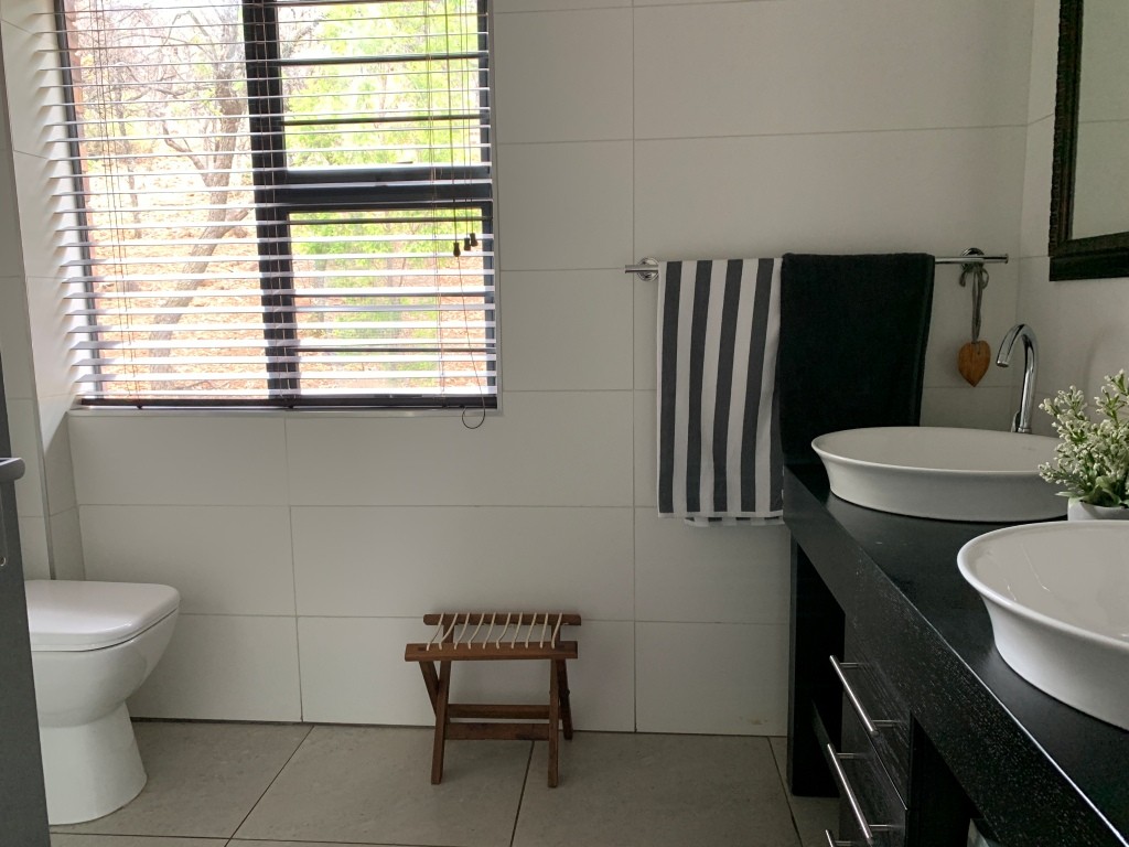 Up another floating staircase lies the private upper level. Here, the main suite offers a tranquil retreat with a walk-in dressing area and a luxurious en-suite bathroom featuring double basins, a shower, and toilet. A second guest bedroom on this level includes its own bathroom and both rooms open through glass sliding doors onto private balconies, offering stunning elevated views of the bushveld.