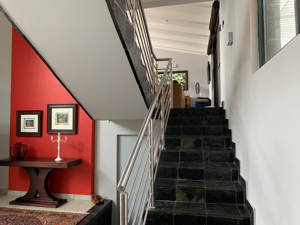 As you enter, the grand entrance hall immediately impresses with its striking floating black slate staircase and sleek aluminium railings. Thoughtful lighting accentuates the impressive ceiling height, creating a sense of openness and elegance from the first step inside.