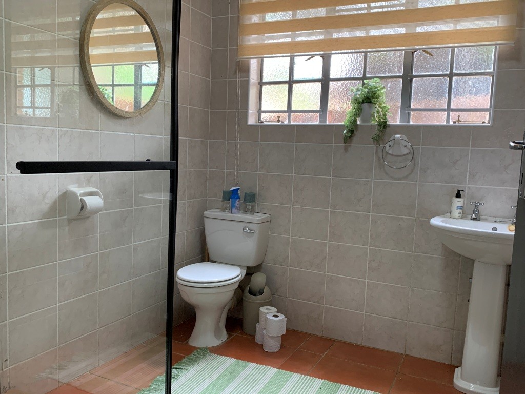 The kitchen is well equipped with gas hobs and a separate scullery, with direct access to the deck for easy entertaining. This upper level is thoughtfully designed to be wheelchair-friendly and offers two spacious bedrooms. The main bedroom features ample built-in cupboards and a full en-suite bathroom with bath, shower, basin, and toilet. A second bedroom and a separate guest bathroom complete this level.