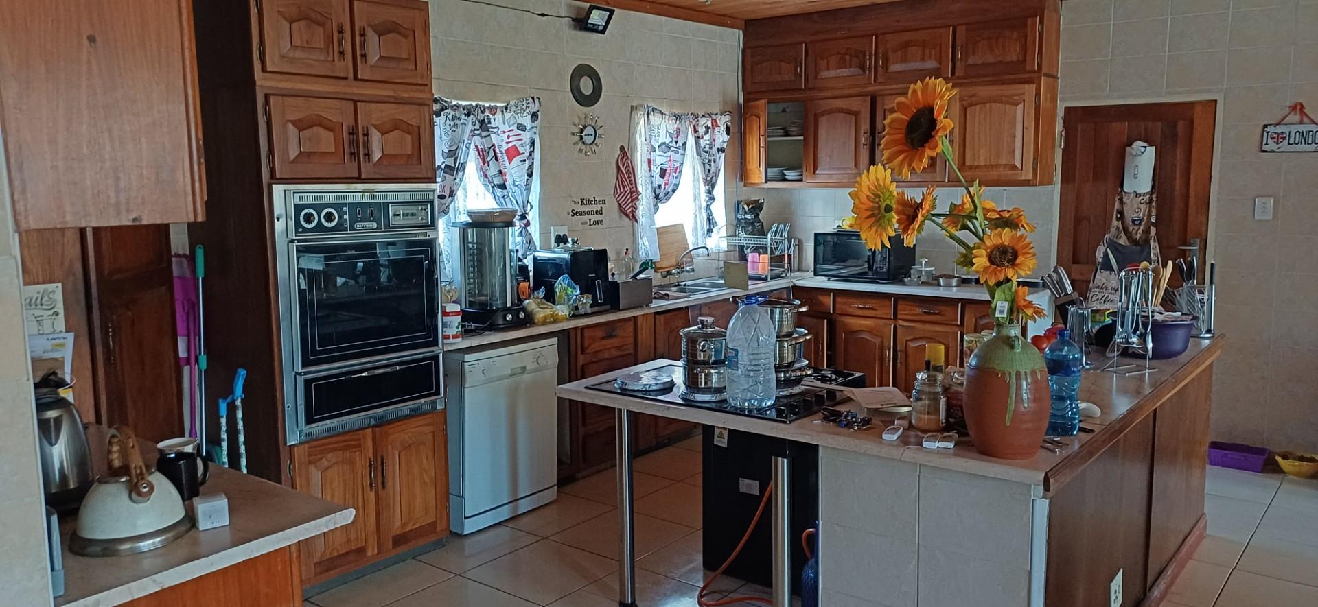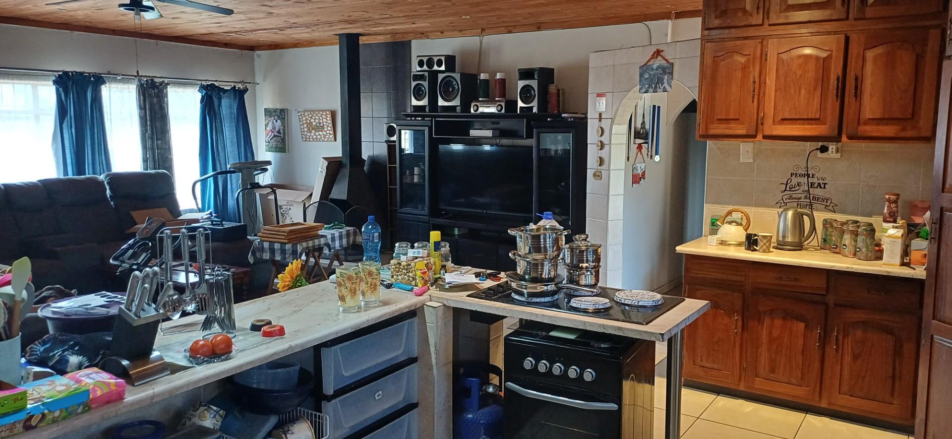 The main residence features three spacious bedrooms with built-in cupboards, a modernised bathroom with bath, shower, and separate toilet, and an open-plan living and dining area anchored by a built-in fireplace—ideal for comfortable family living or attracting quality tenants. The kitchen flows seamlessly into the living spaces, enhancing functionality and appeal.