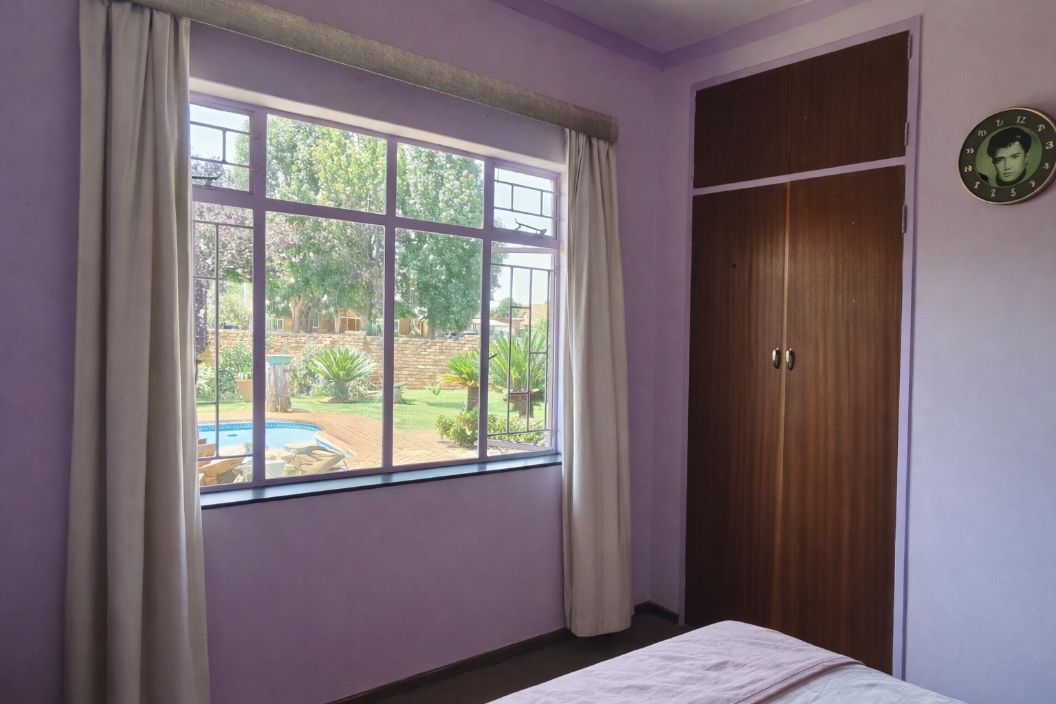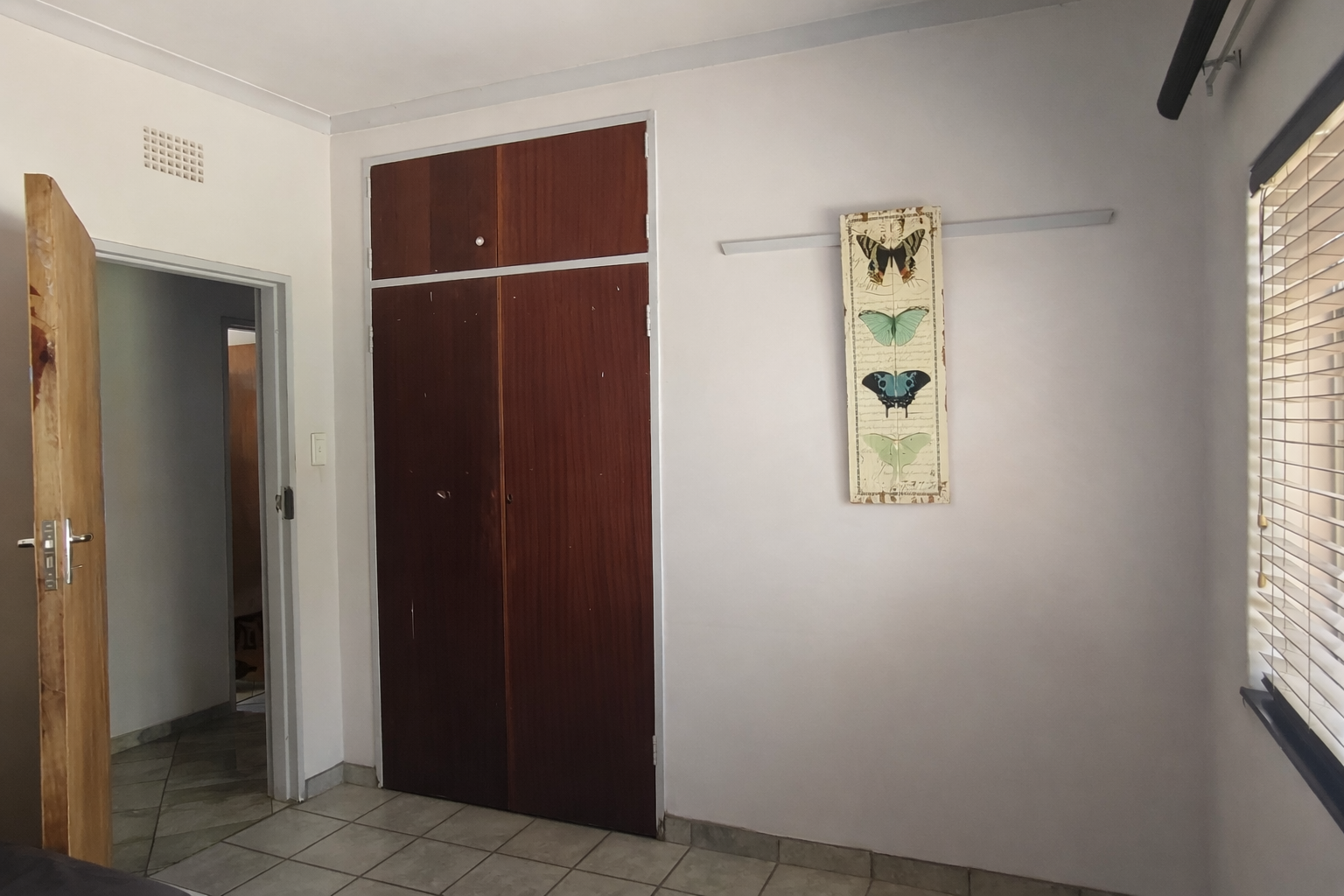 From the lapa, you have direct access to a swimming pool and a neatly maintained garden, creating a relaxed outdoor lifestyle. The kitchen is practical and functional, fitted with steel cupboards.