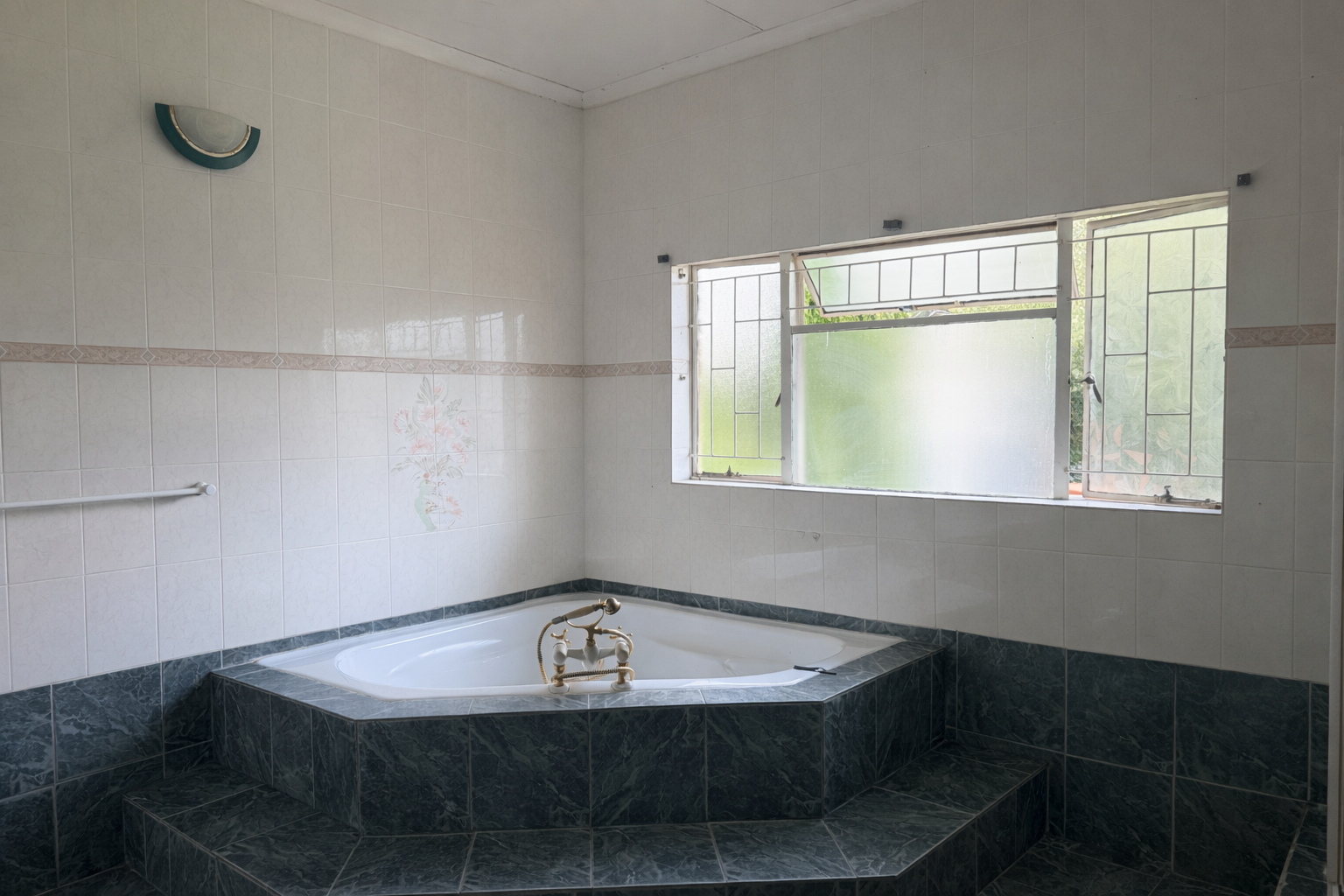 The yard is fully walled, providing privacy and security, and includes a swimming pool ideal for cooling off during the summer months.