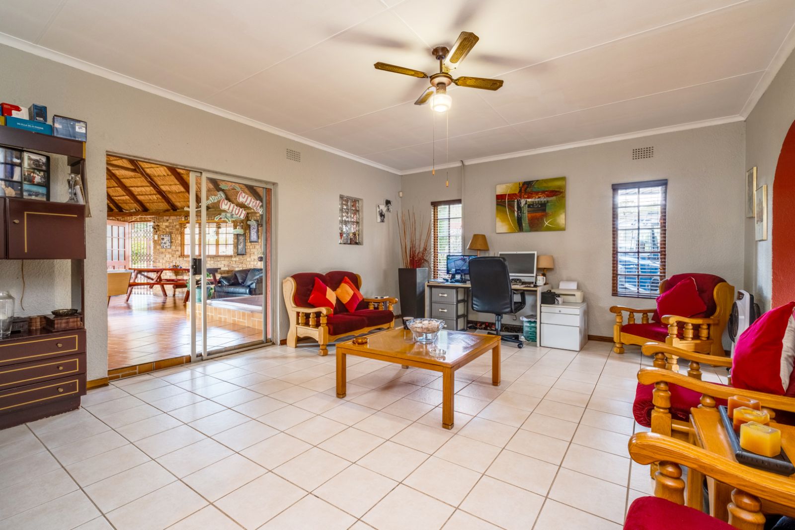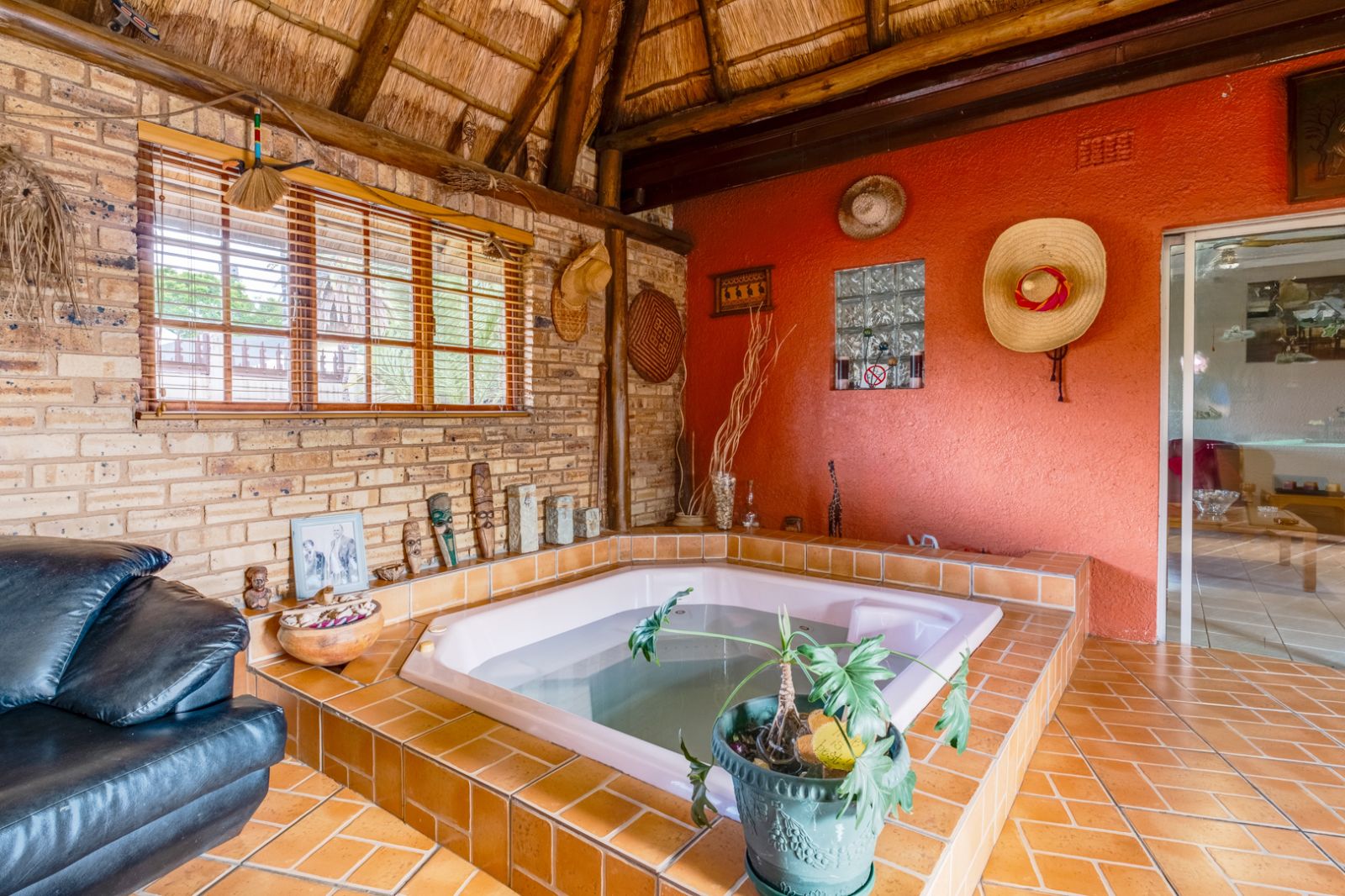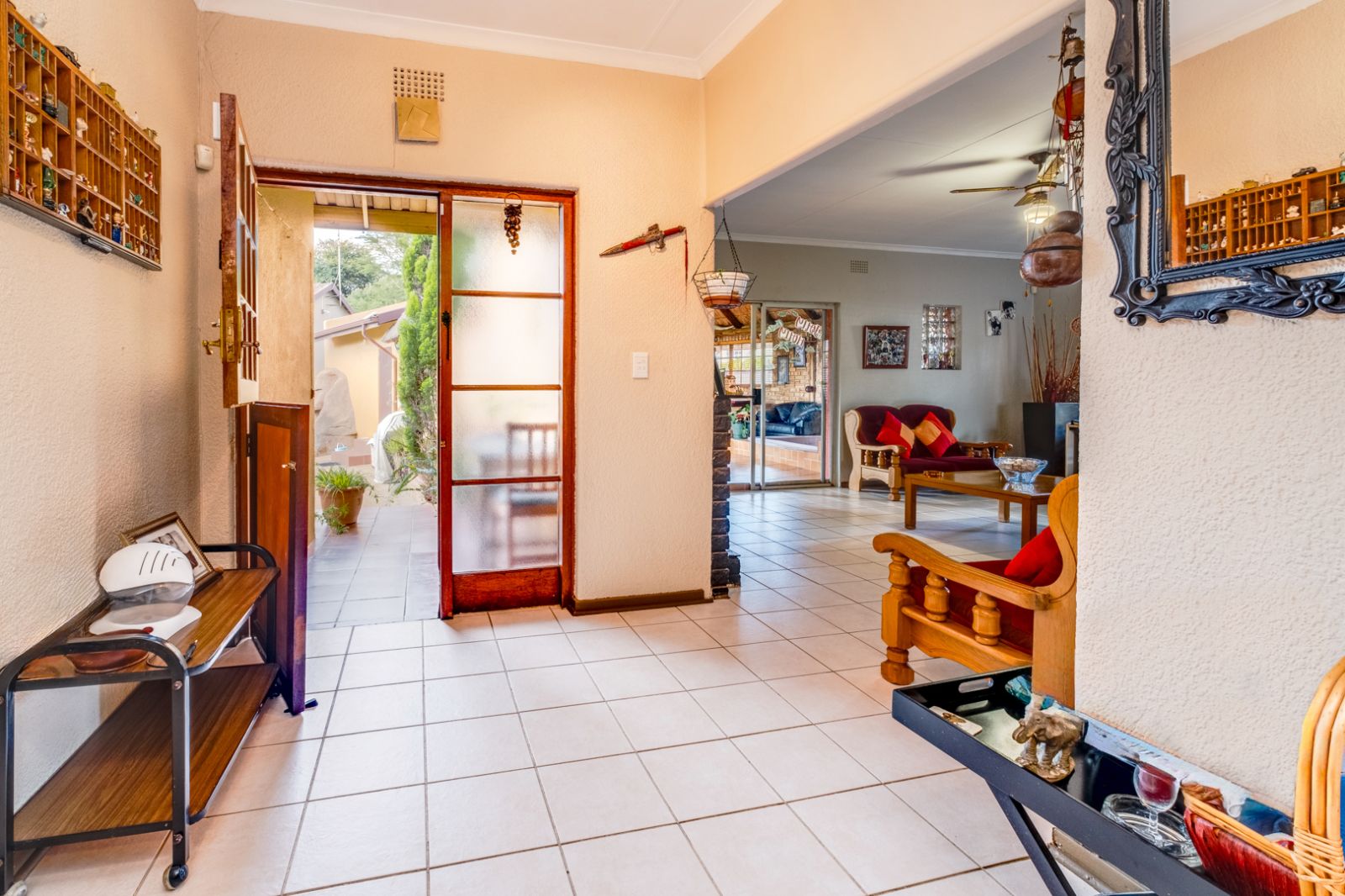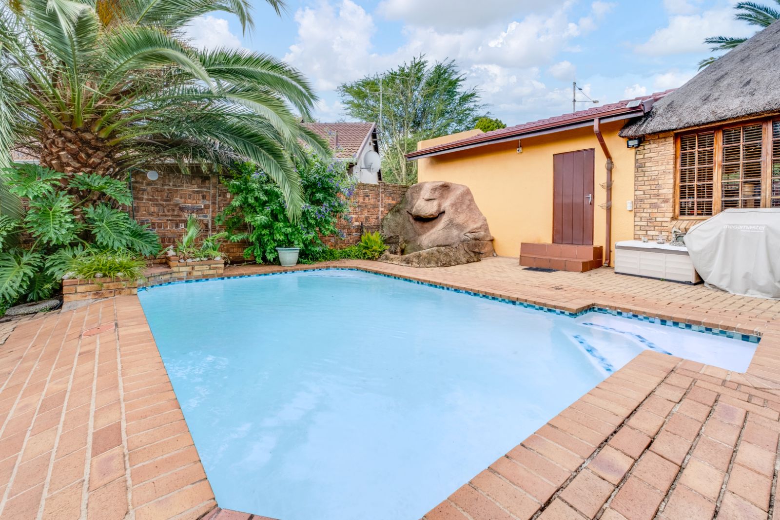 Step inside through a charming split barn-style wooden front door with cottage-pane glass detailing, leading to an elegant tiled entrance hall. The main house boasts multiple living spaces, including a formal lounge, a cozy TV lounge, and a dining room—all finished with timeless tiled floors. The main lounge opens to an enclosed patio where a built-in braai and jacuzzi set the stage for entertaining or relaxing evenings.
