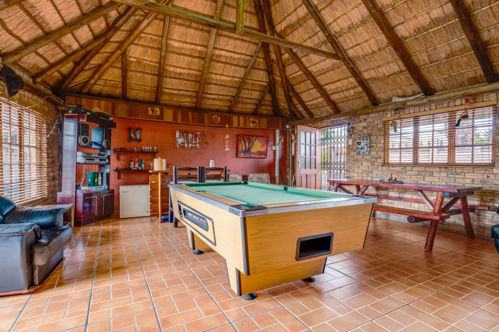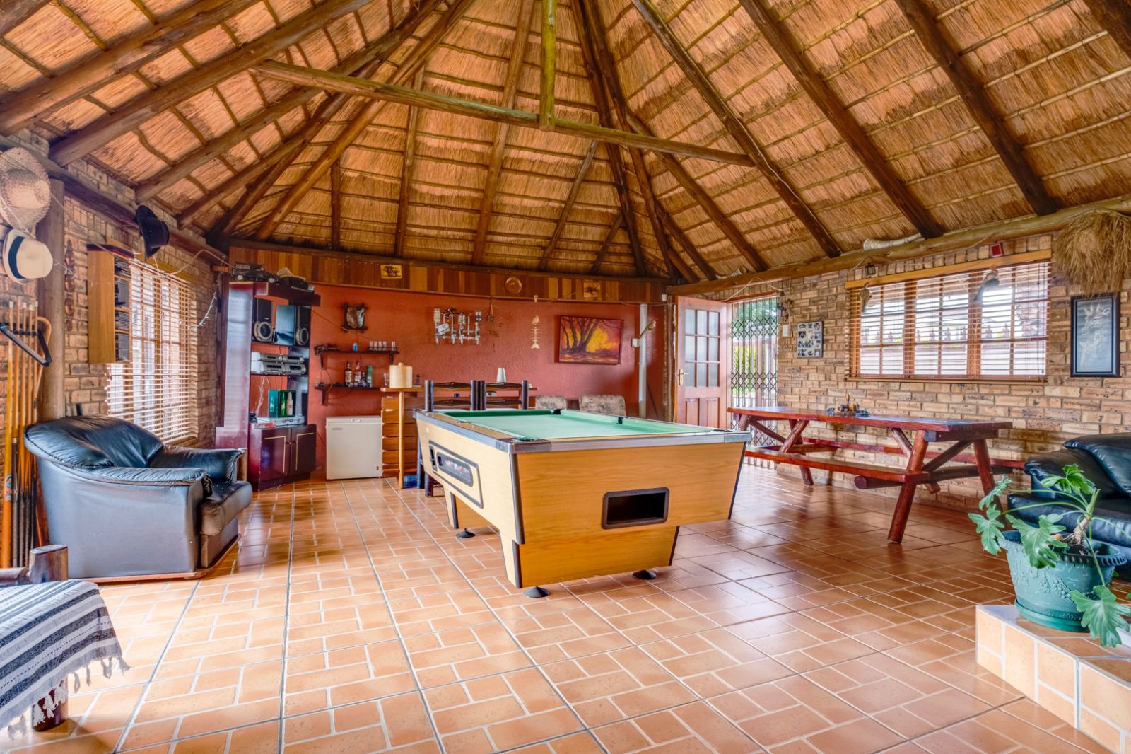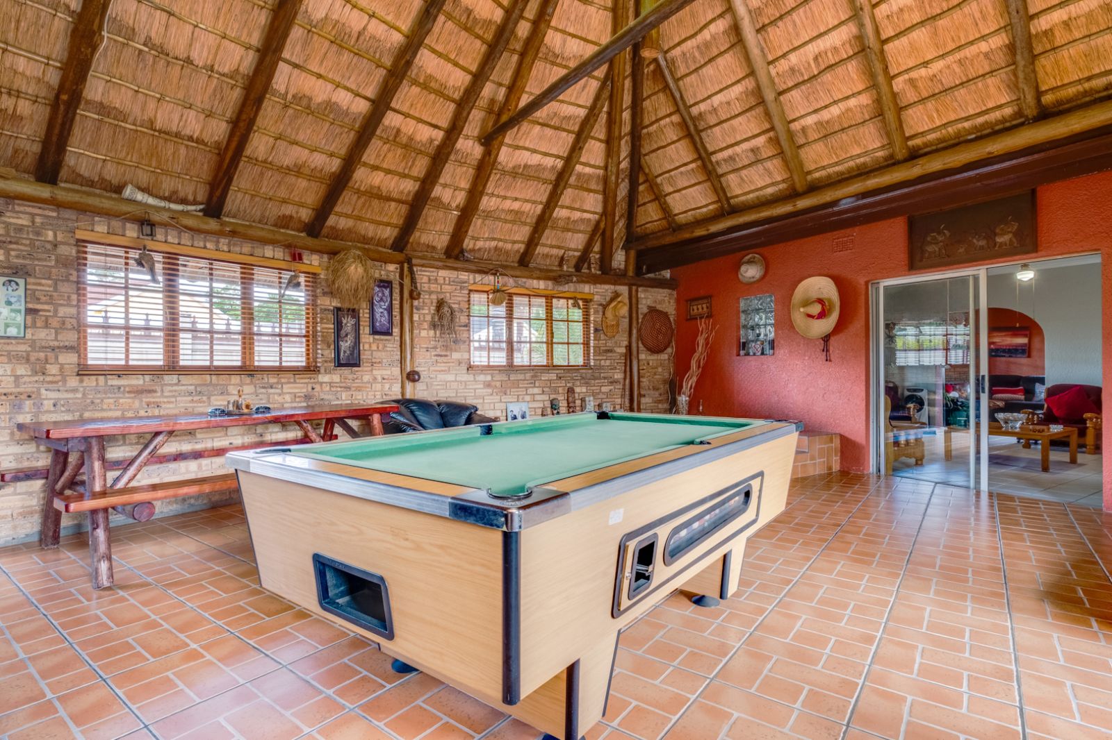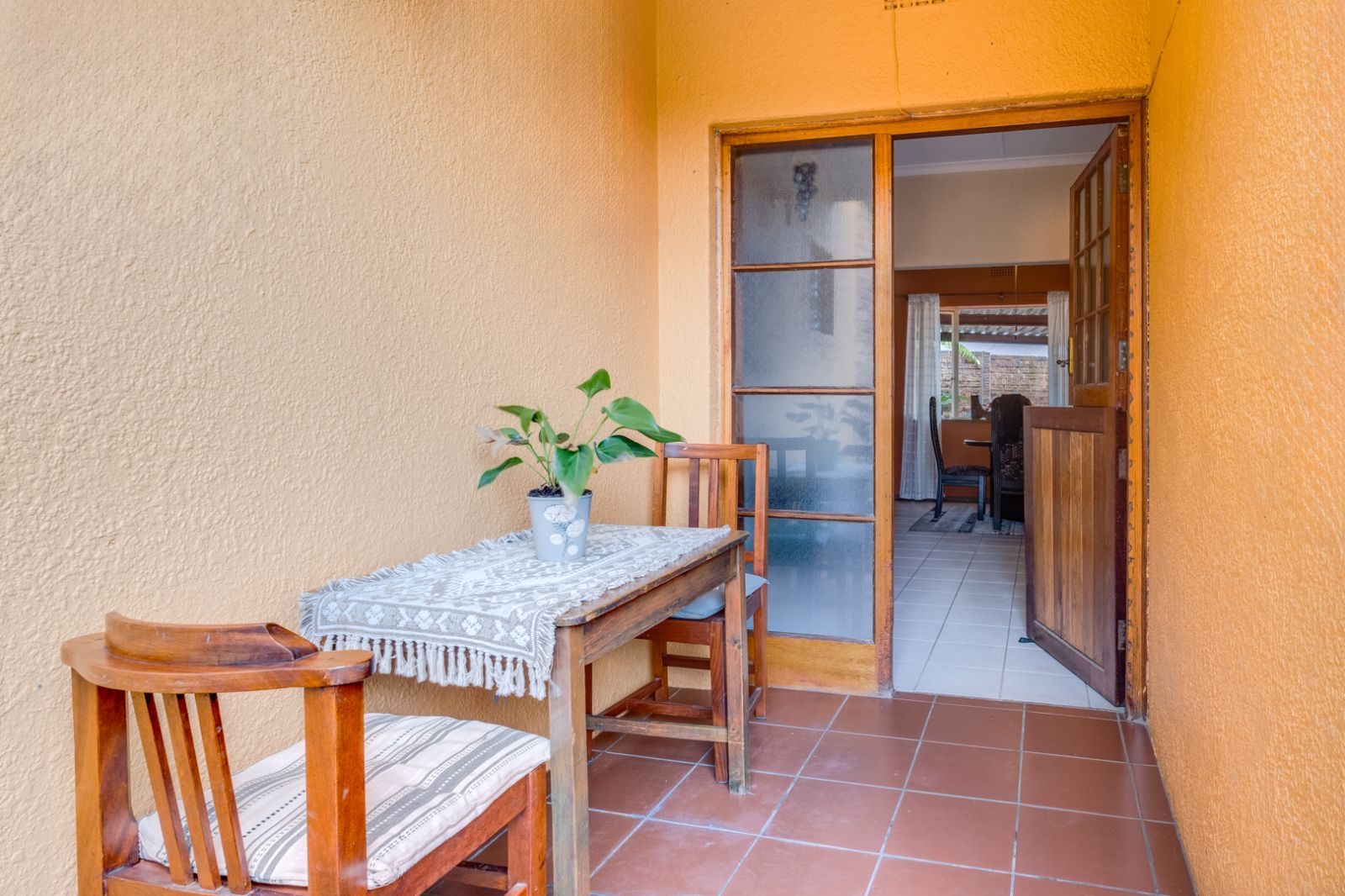 Step inside through a charming split barn-style wooden front door with cottage-pane glass detailing, leading to an elegant tiled entrance hall. The main house boasts multiple living spaces, including a formal lounge, a cozy TV lounge, and a dining room—all finished with timeless tiled floors. The main lounge opens to an enclosed patio where a built-in braai and jacuzzi set the stage for entertaining or relaxing evenings.