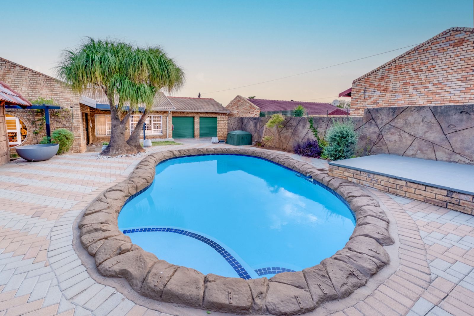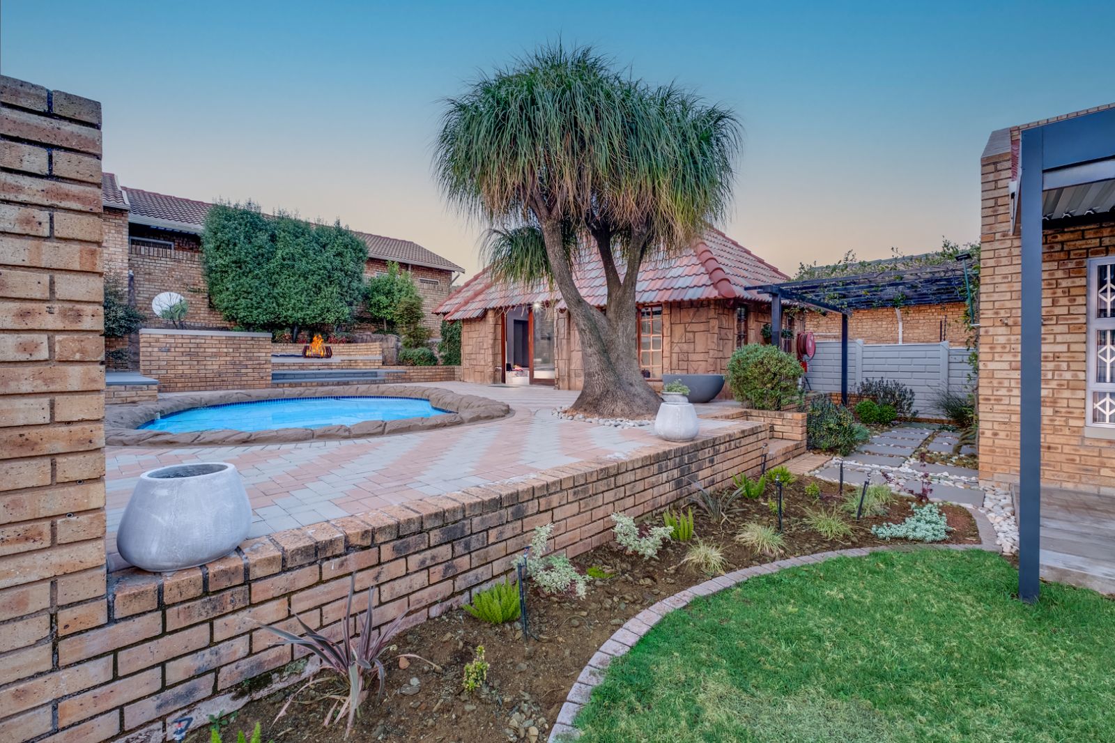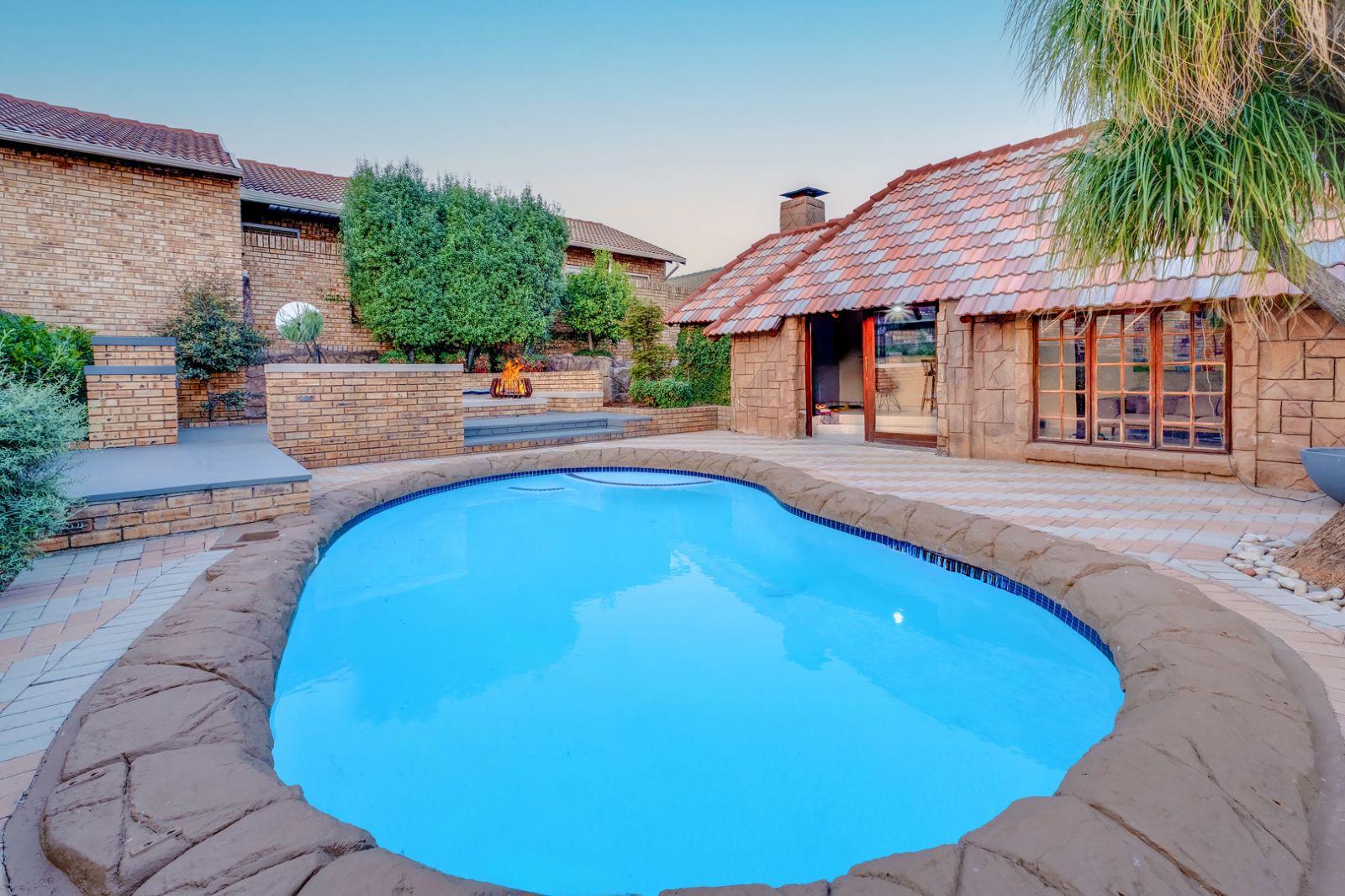 Glass doors open onto a covered patio overlooking a sparkling swimming pool, setting the stage for unforgettable gatherings. An enclosed entertainment area, featuring its own toilet and basin, offers year-round enjoyment, while a boma creates the perfect outdoor space for evenings under the stars.