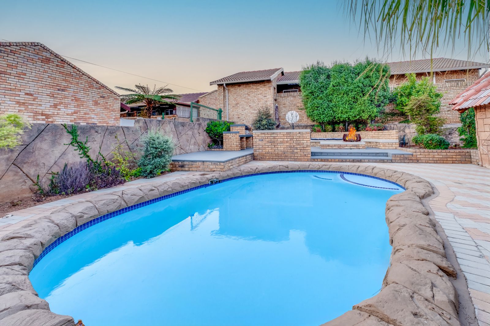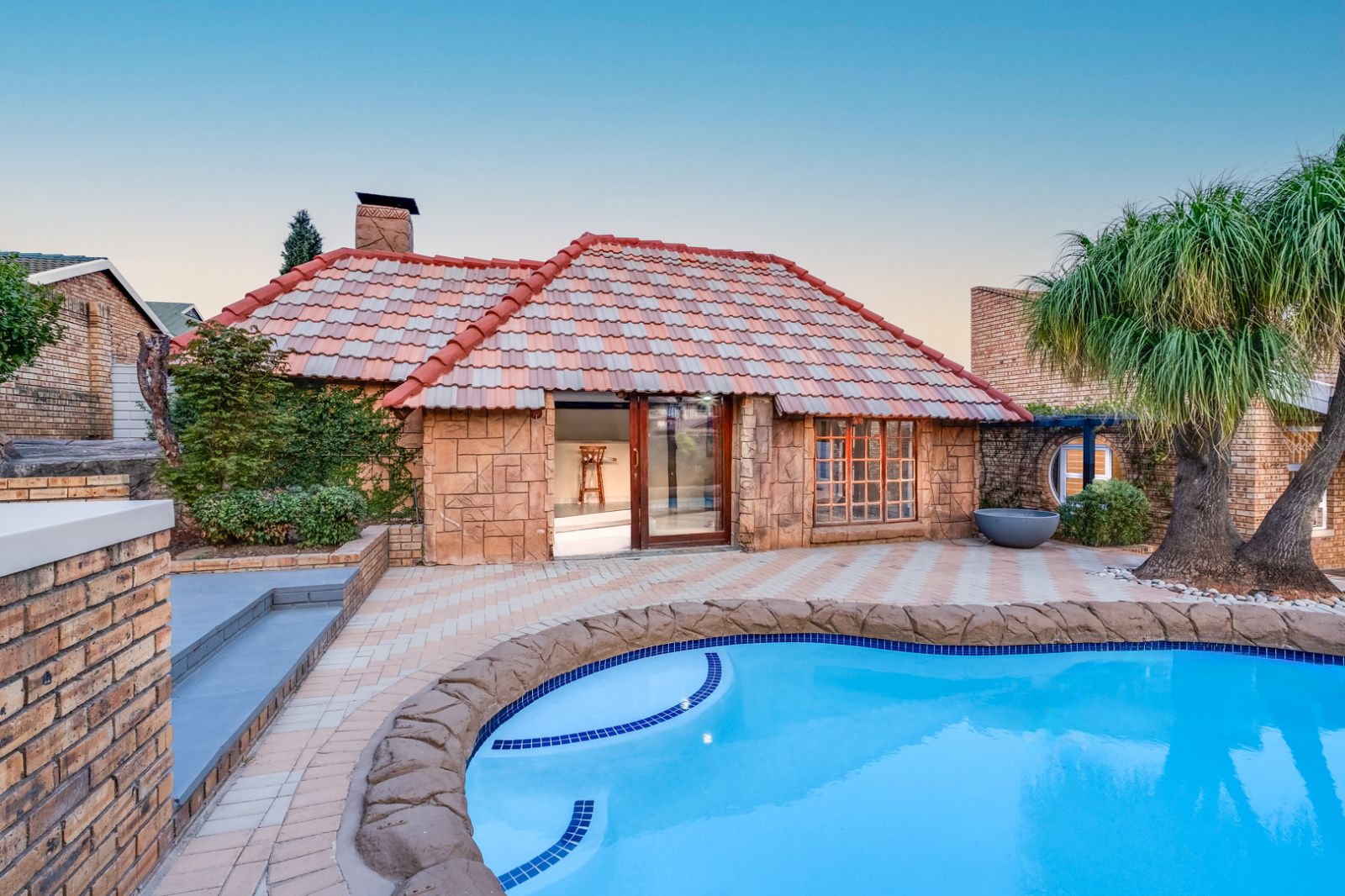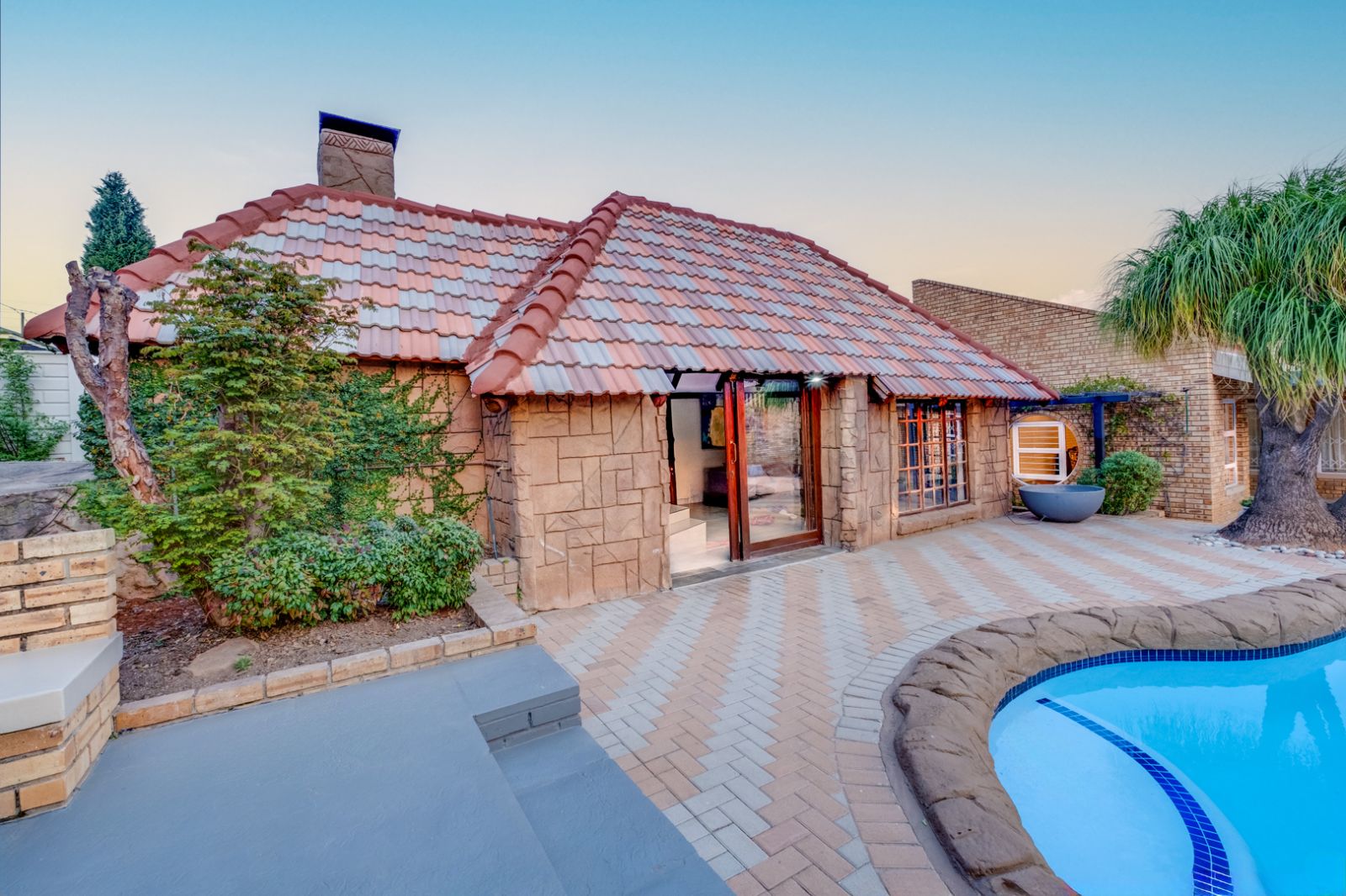 Glass doors open onto a covered patio overlooking a sparkling swimming pool, setting the stage for unforgettable gatherings. An enclosed entertainment area, featuring its own toilet and basin, offers year-round enjoyment, while a boma creates the perfect outdoor space for evenings under the stars.