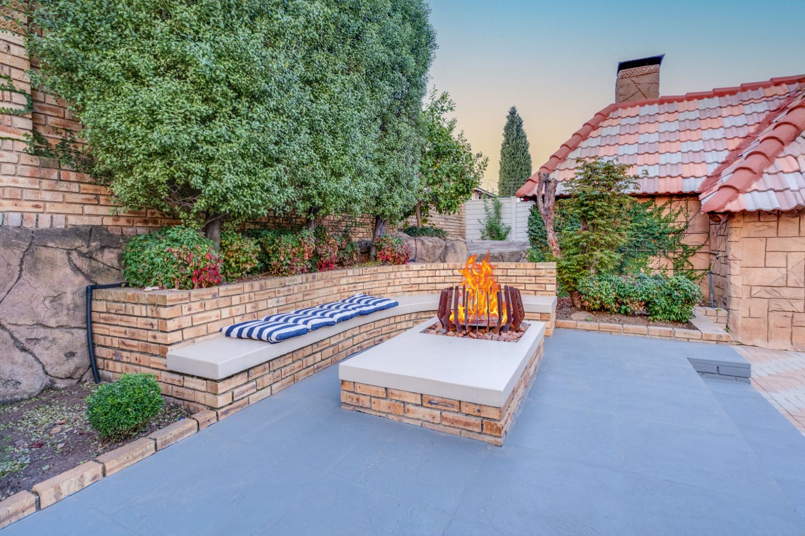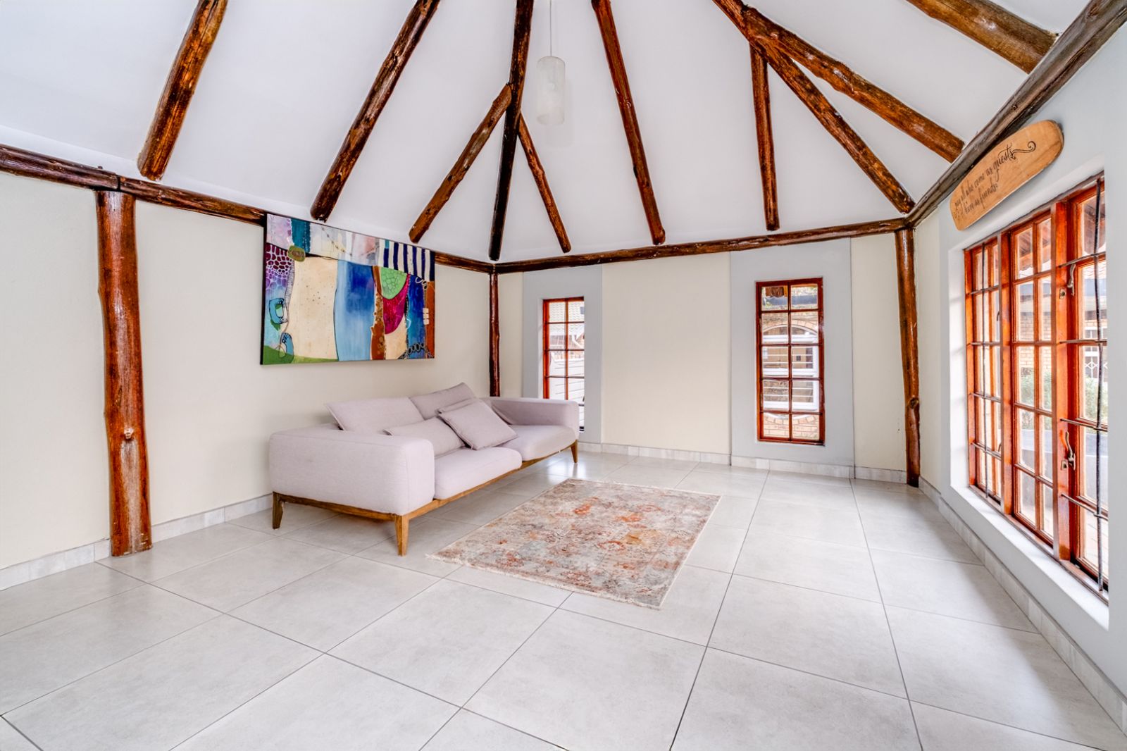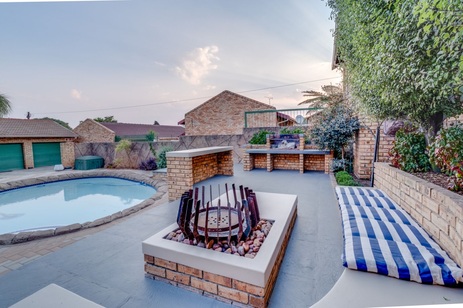 Glass doors open onto a covered patio overlooking a sparkling swimming pool, setting the stage for unforgettable gatherings. An enclosed entertainment area, featuring its own toilet and basin, offers year-round enjoyment, while a boma creates the perfect outdoor space for evenings under the stars.