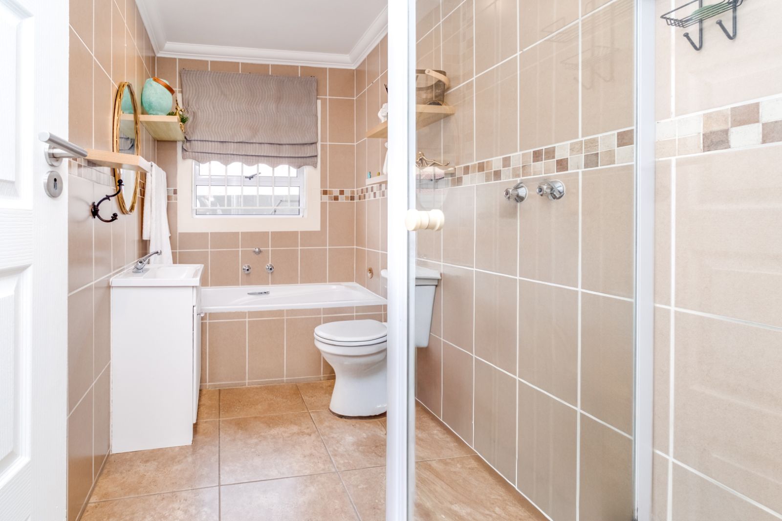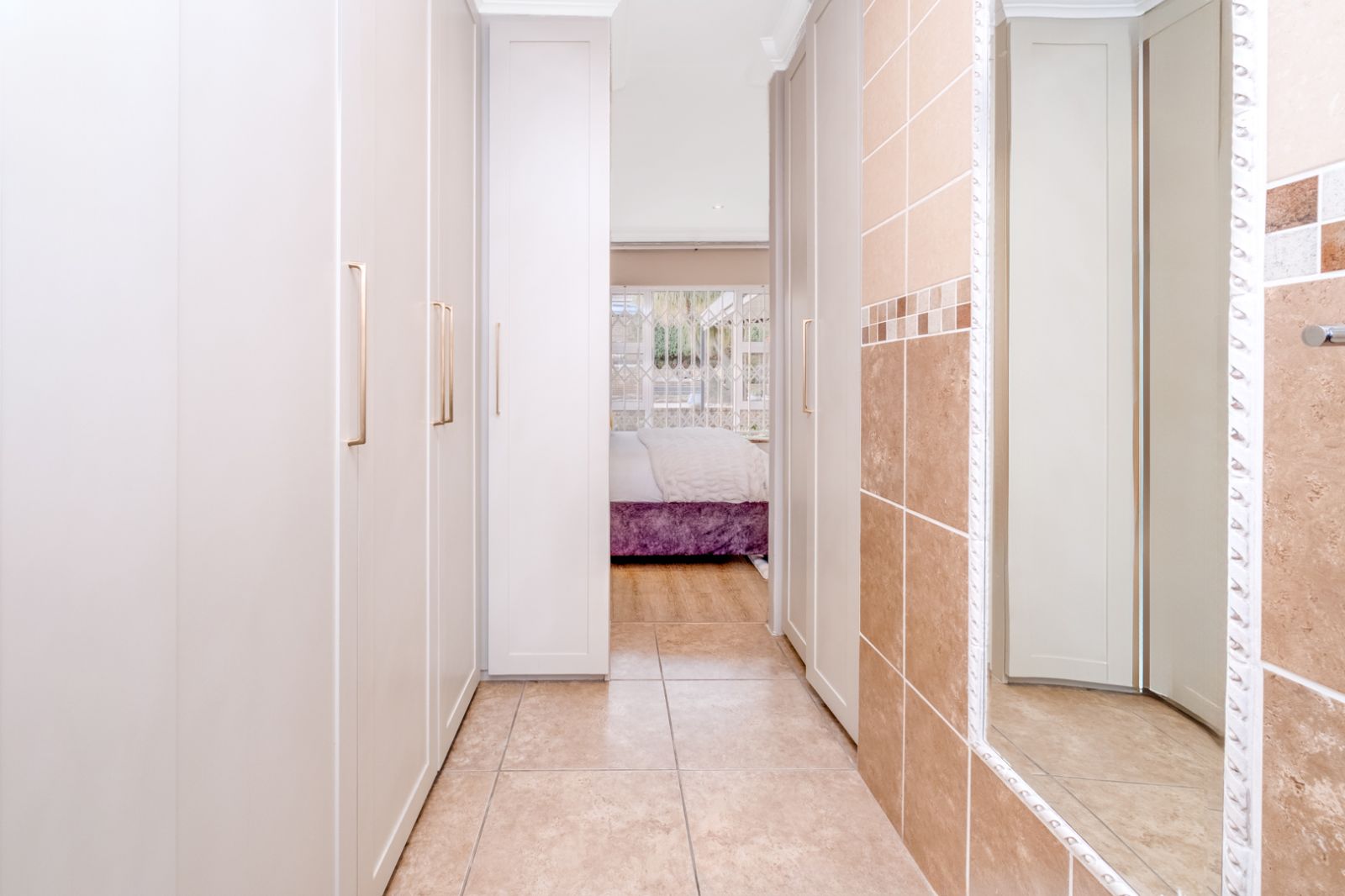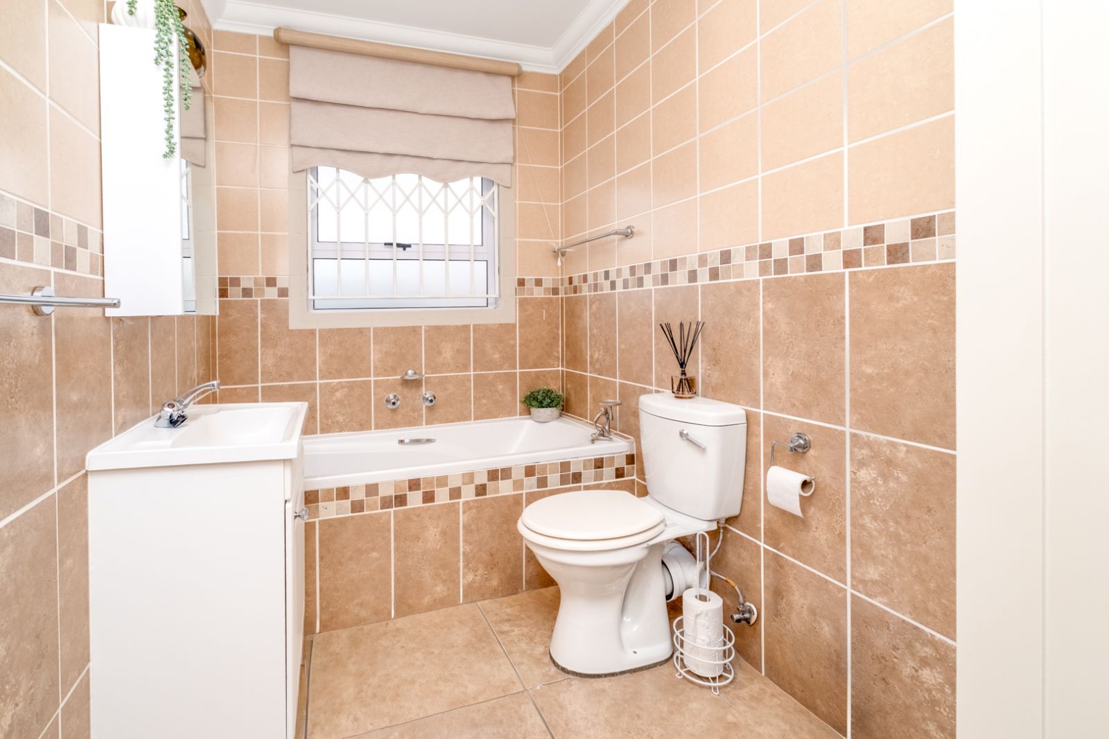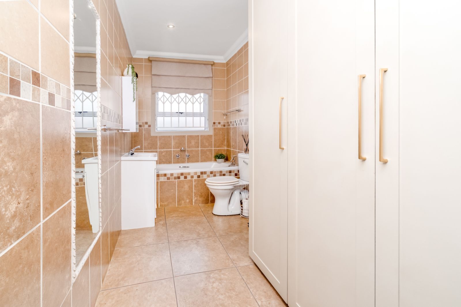 The home features three beautifully appointed bedrooms, each with built-in cupboards and warm laminate wood flooring. The main bedroom boasts a luxurious walk-in closet leading to a serene en-suite bathroom with a bath, basin, and toilet. A second, equally elegant bathroom offers a modern shower, basin, and toilet to serve the additional bedrooms.