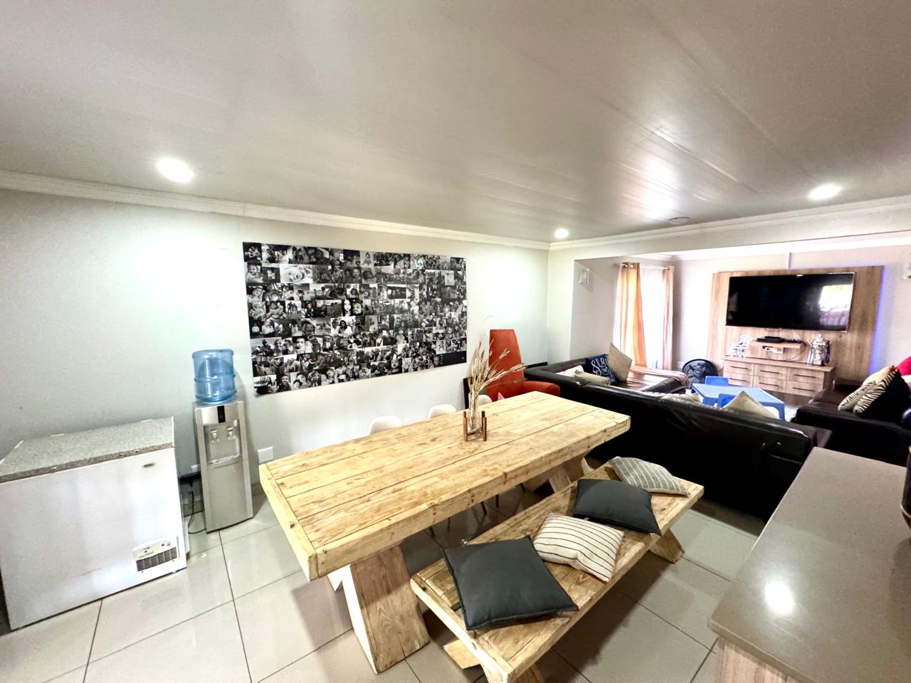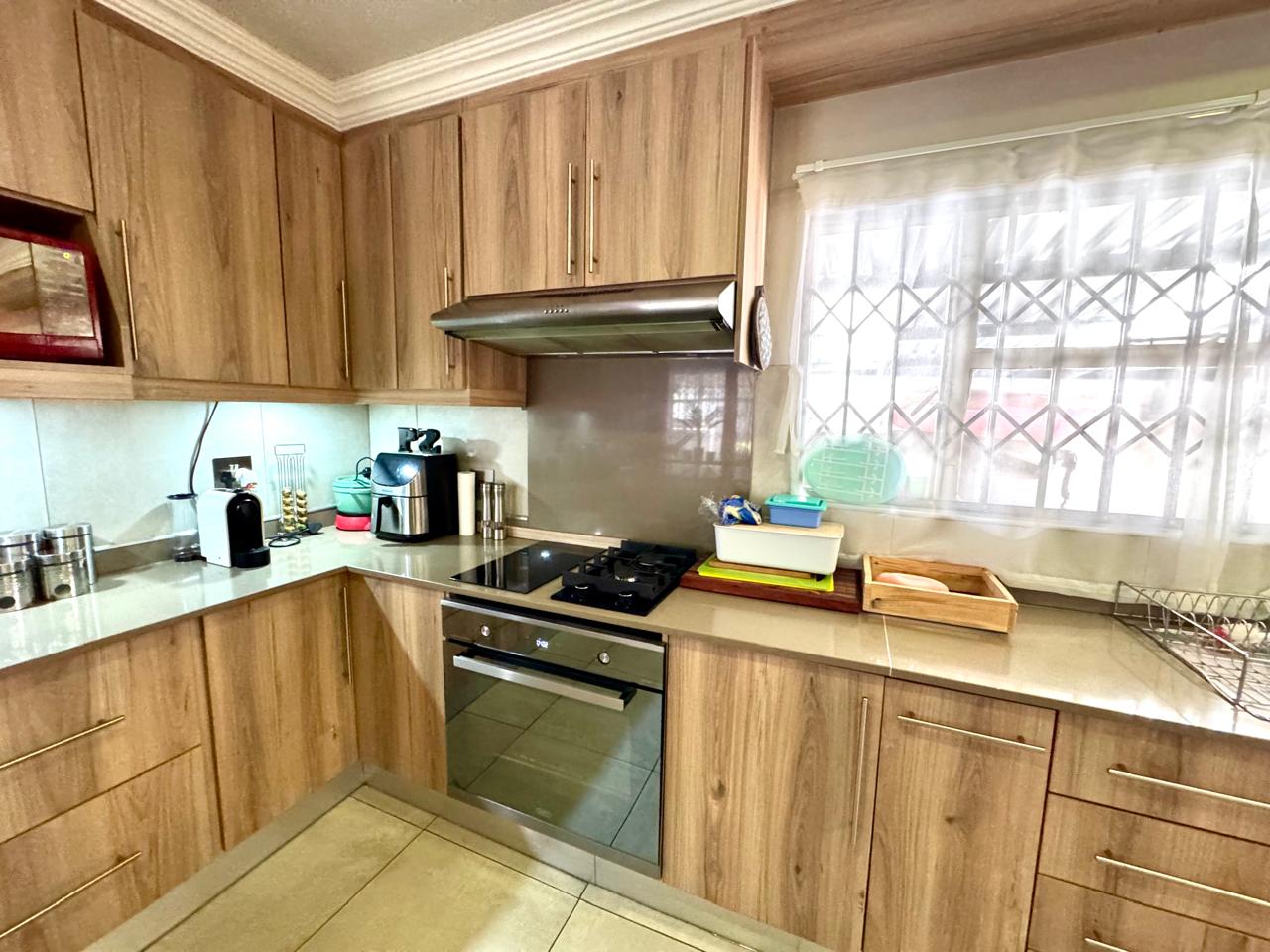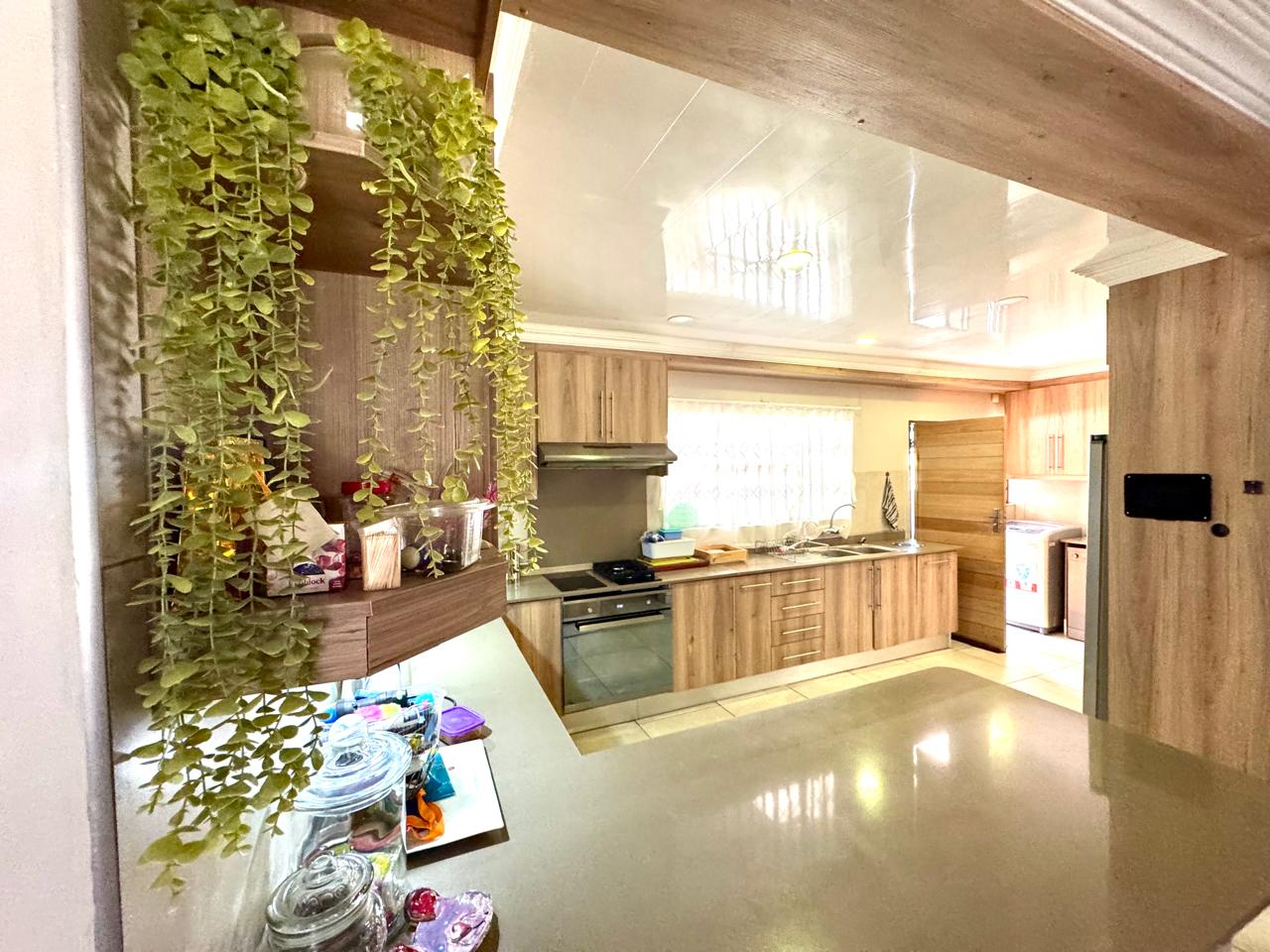 As you enter through the front door, you're welcomed into a neat entrance hall that leads into the first of two living areas. The second living area is open-plan, offering a spacious layout that flows effortlessly into the modern kitchen. The kitchen is fitted with melamine cupboards topped with solid granite counters, and includes a built-in undercounter oven, two gas hobs, two electric stove plates, and an extractor fan. A separate scullery area provides built-in cupboards and plumbing for a dishwasher and washing machine, adding both convenience and functionality.
