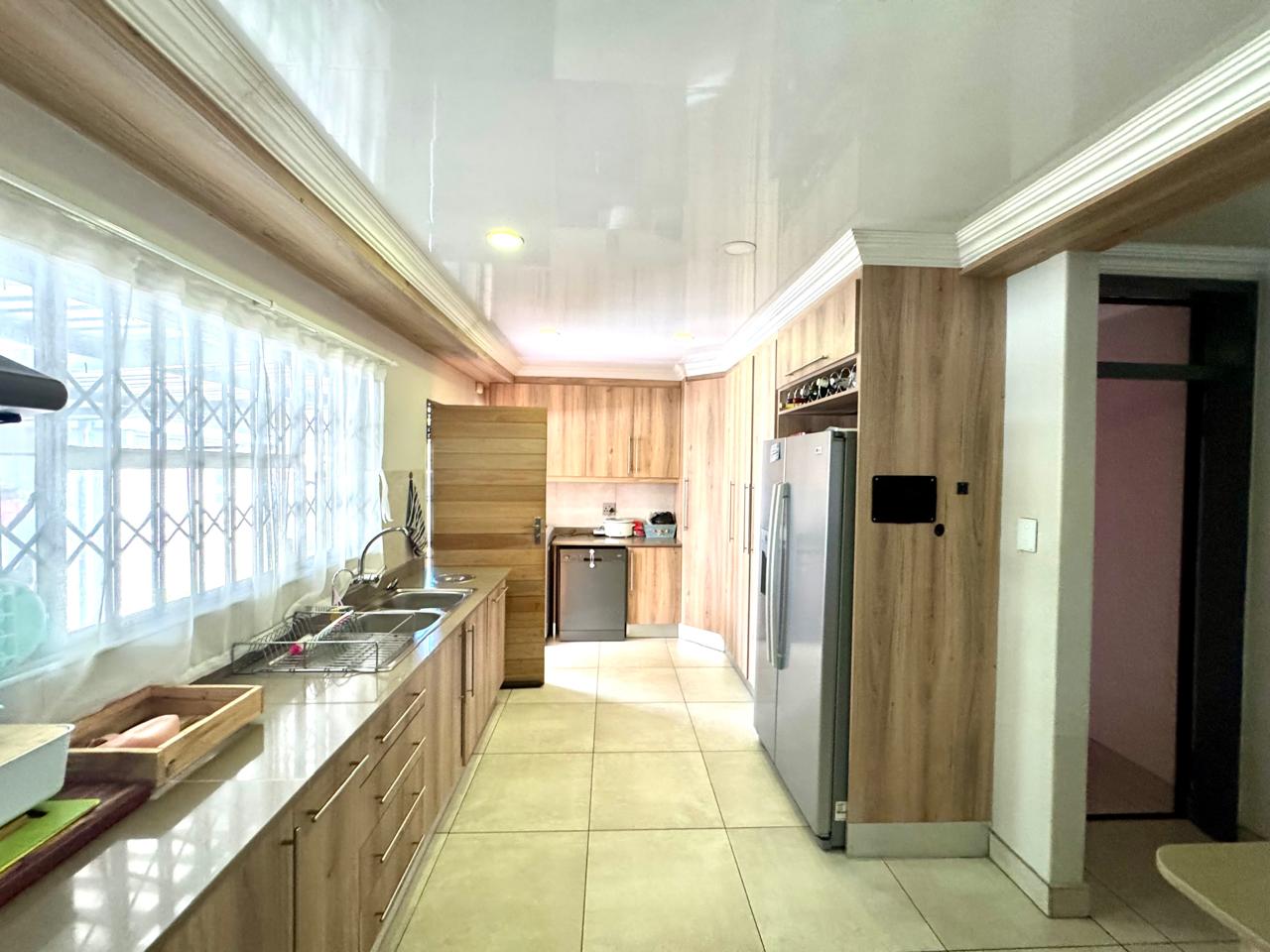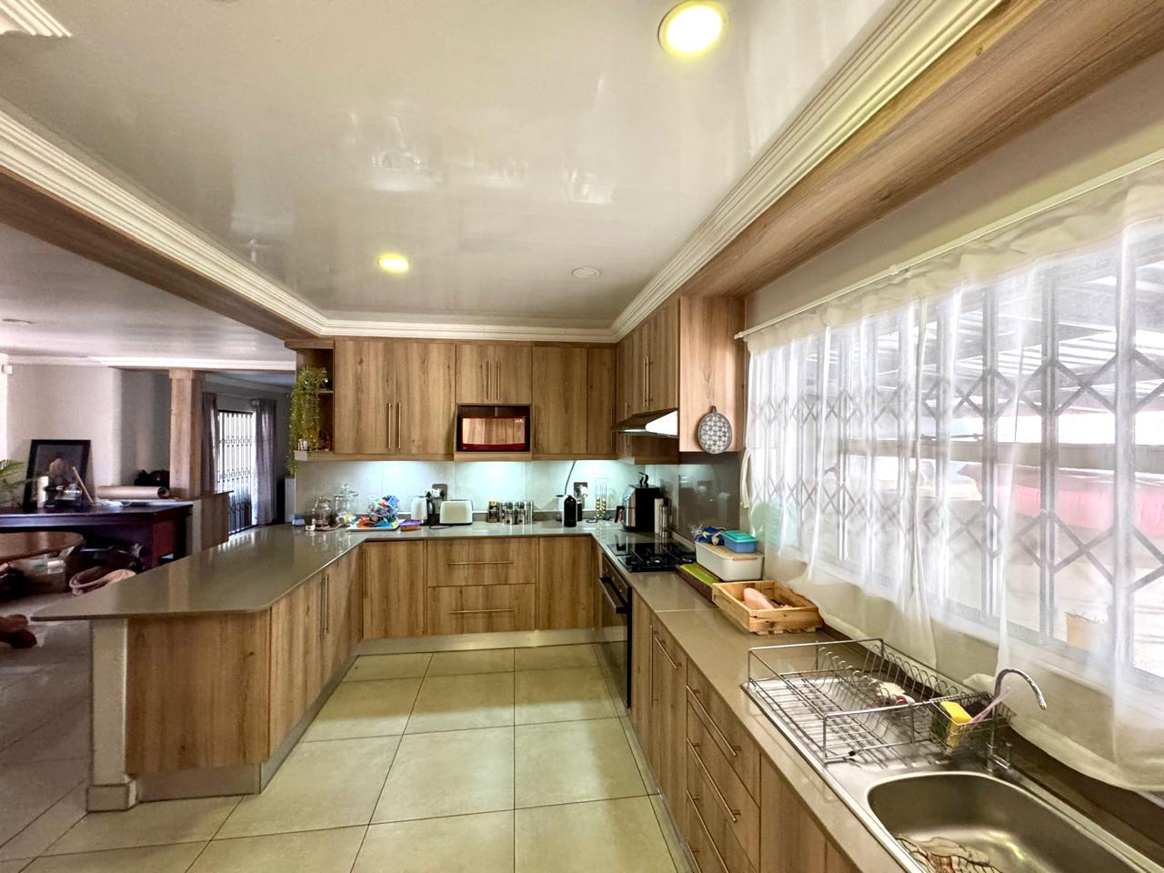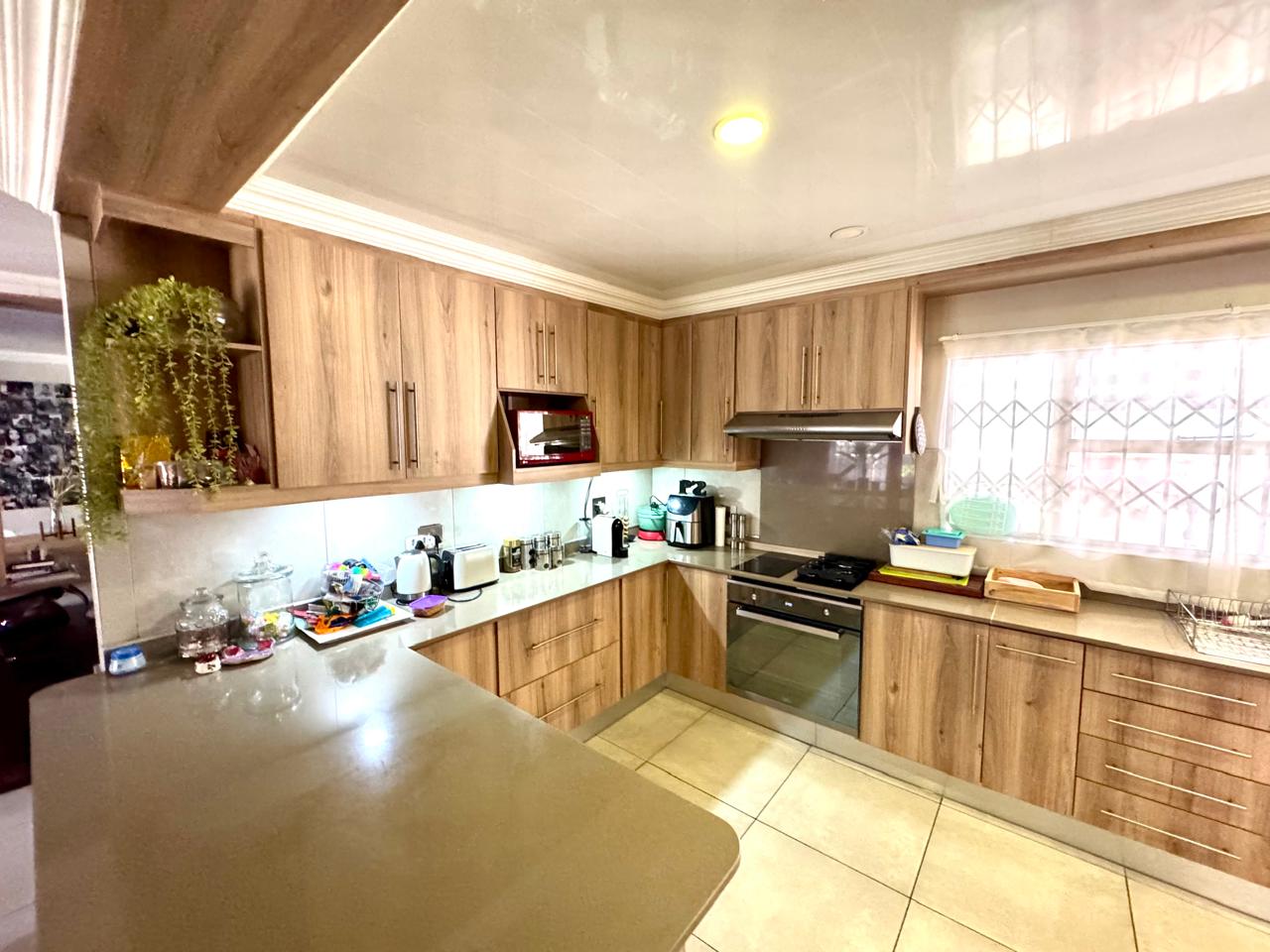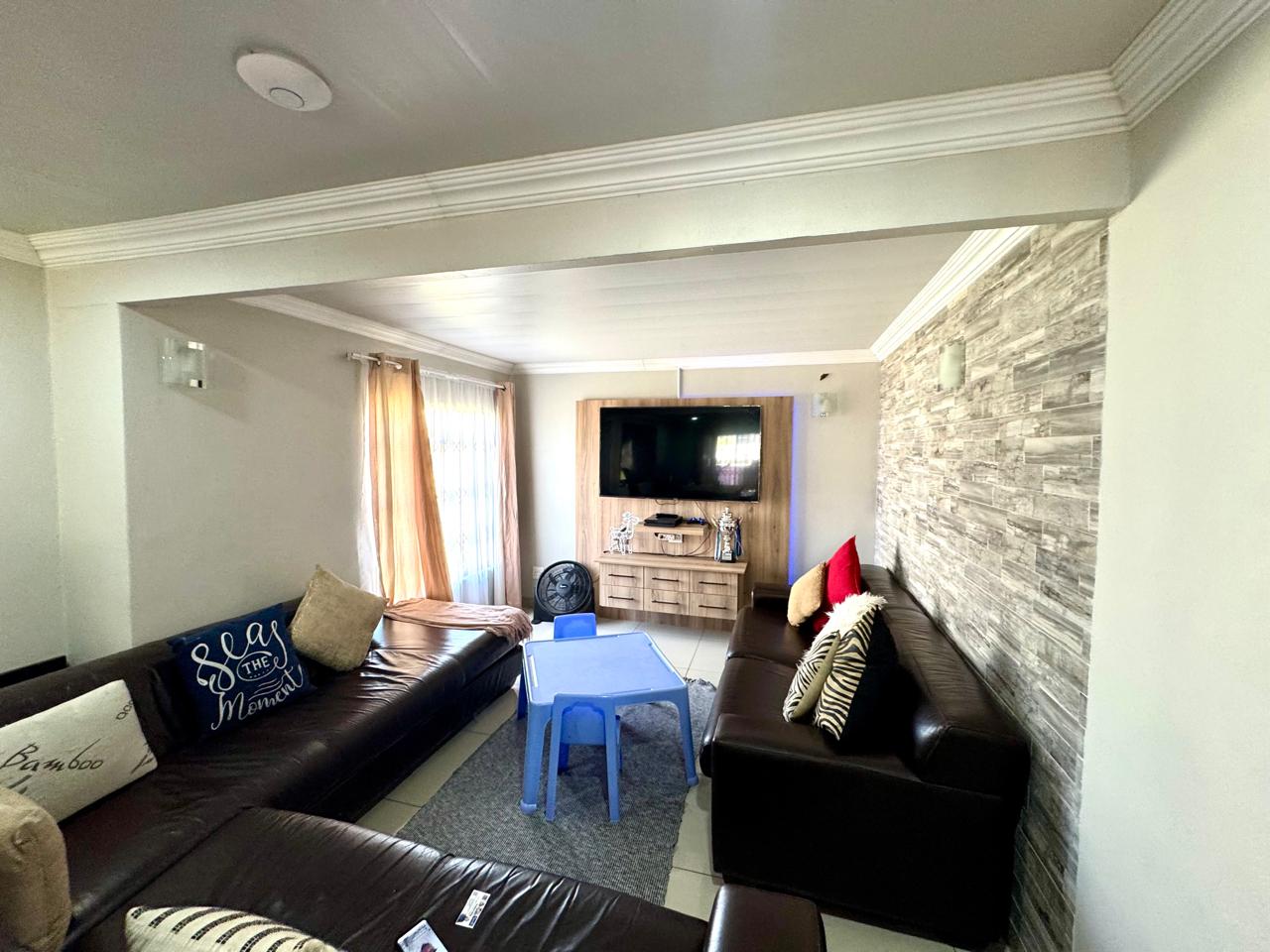 As you enter through the front door, you're welcomed into a neat entrance hall that leads into the first of two living areas. The second living area is open-plan, offering a spacious layout that flows effortlessly into the modern kitchen. The kitchen is fitted with melamine cupboards topped with solid granite counters, and includes a built-in undercounter oven, two gas hobs, two electric stove plates, and an extractor fan. A separate scullery area provides built-in cupboards and plumbing for a dishwasher and washing machine, adding both convenience and functionality.