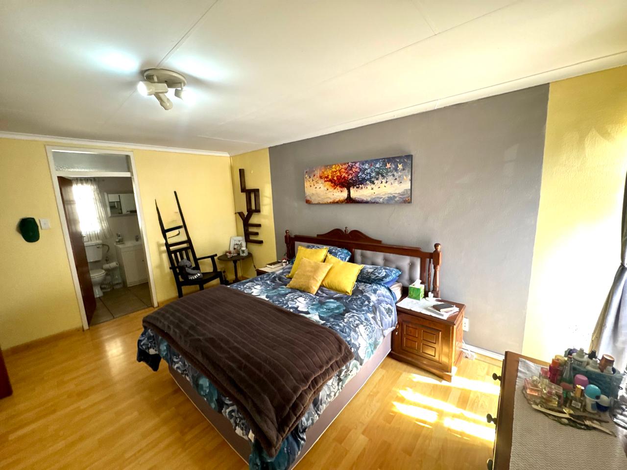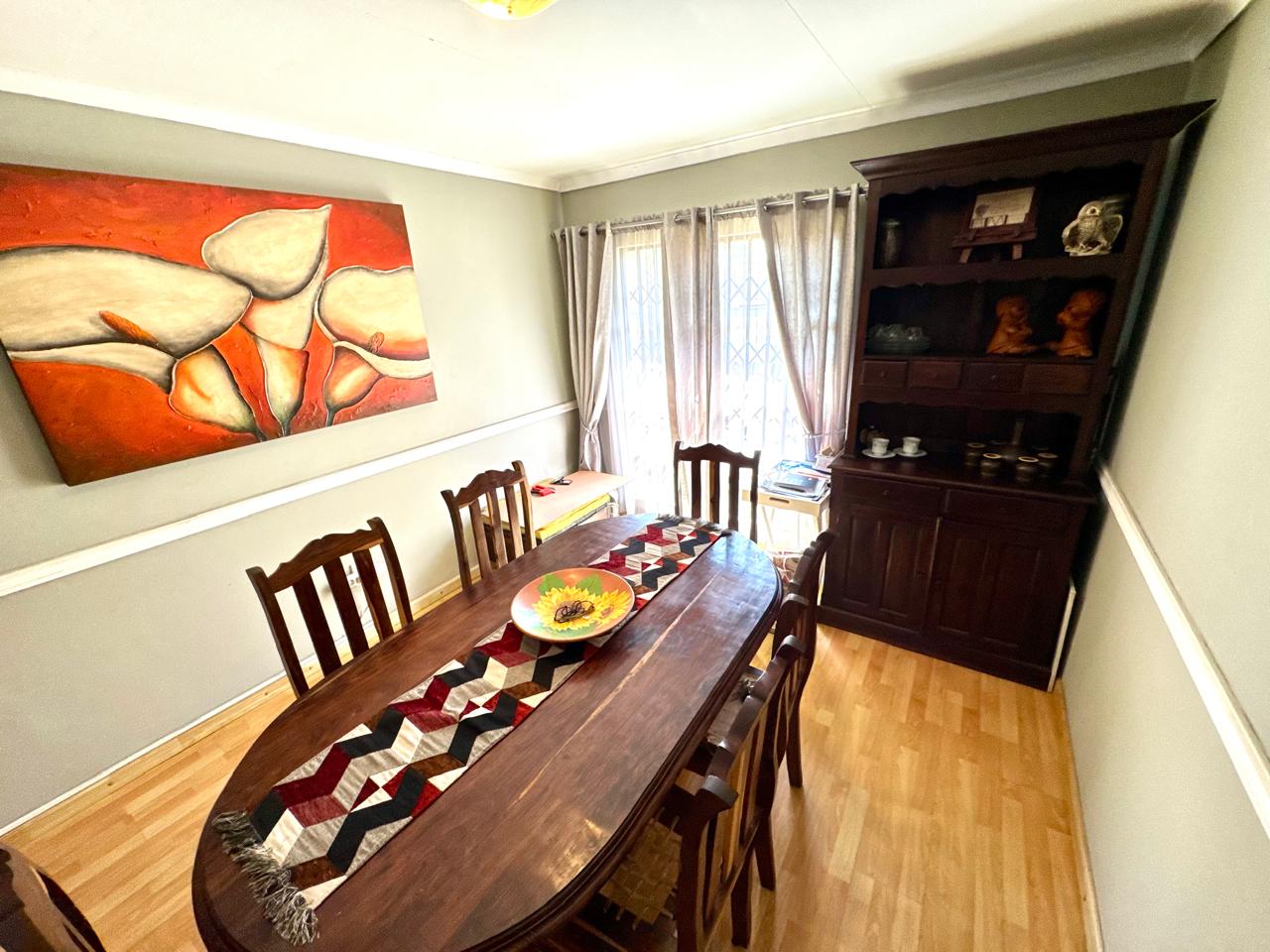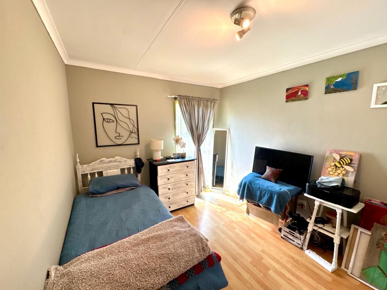 The home offers four well-sized bedrooms, each with built-in cupboards. Three of the bedrooms are fitted with laminated flooring, while the fourth features tiled flooring. One of the bedrooms boasts a sliding door that opens directly onto a patio area with a covered carport, offering privacy and easy outdoor access.