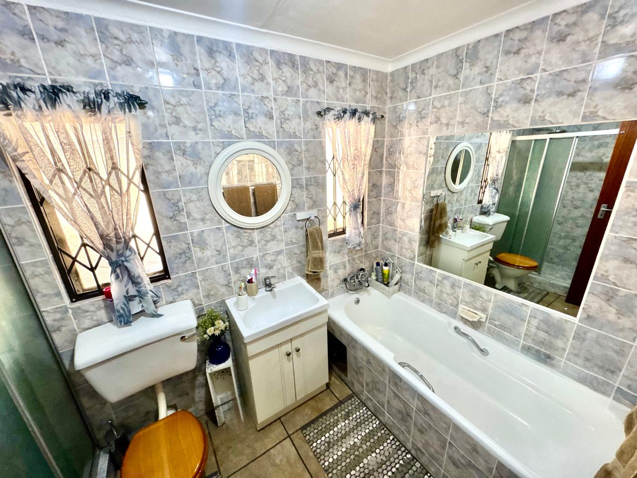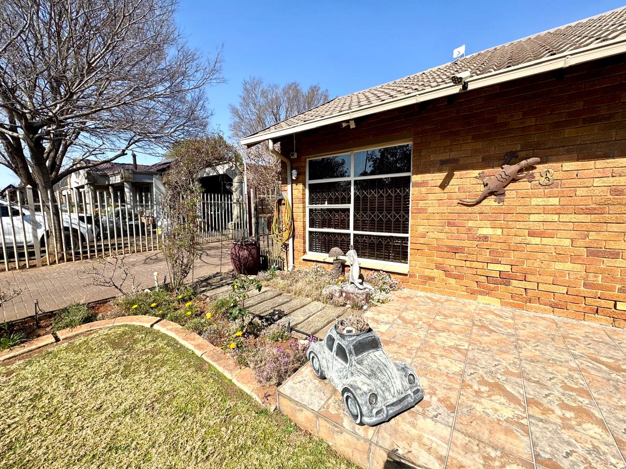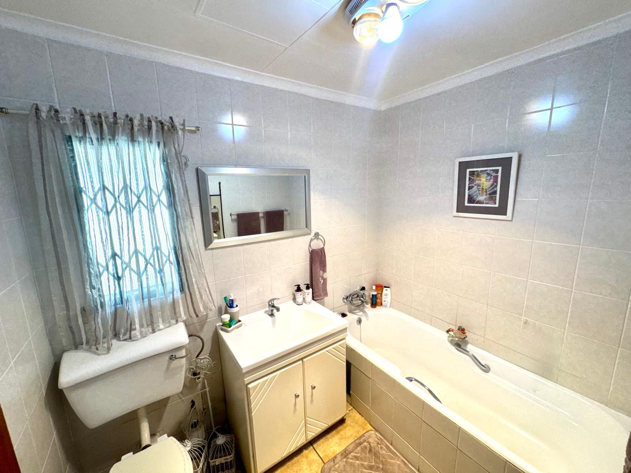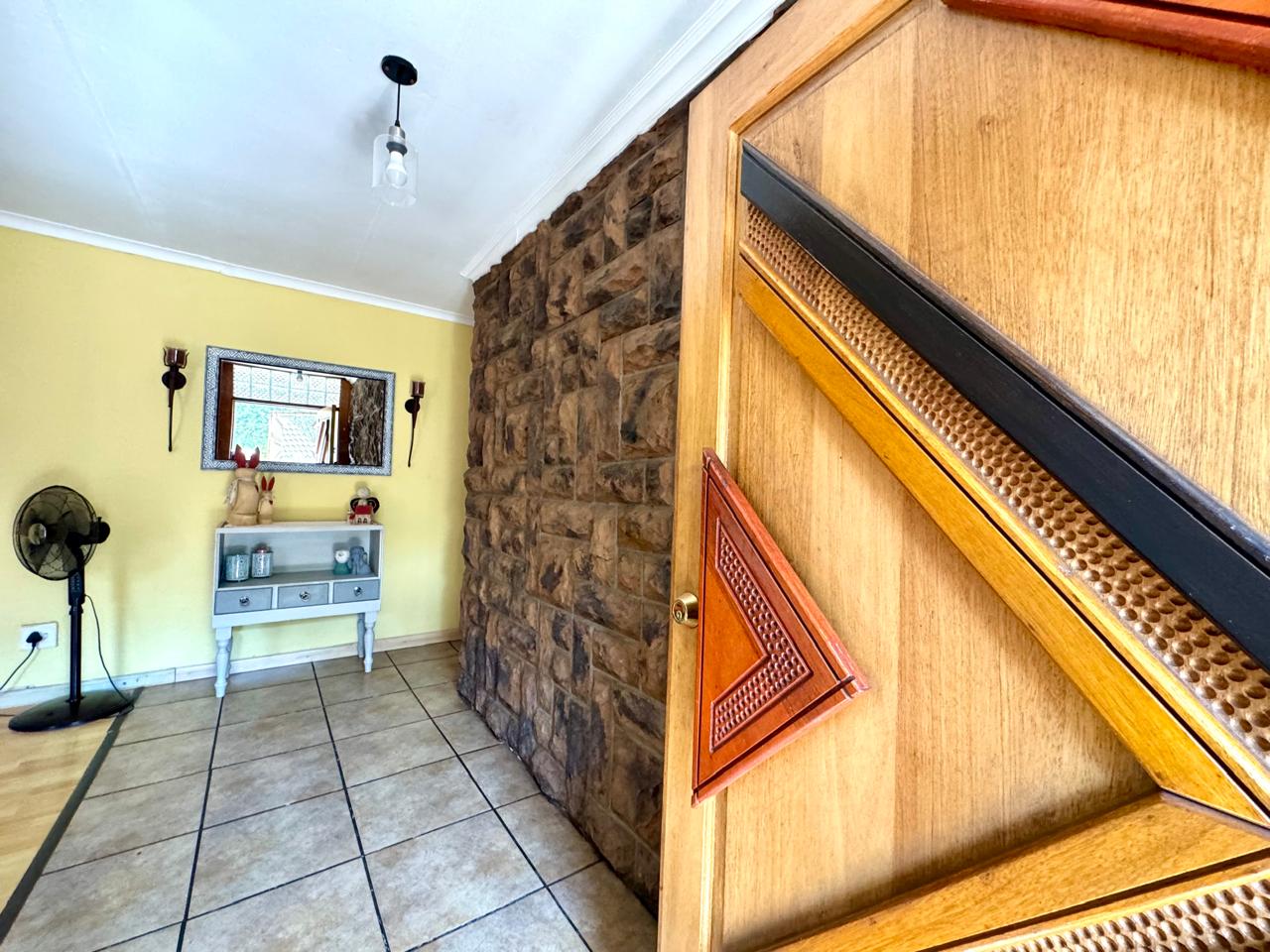 The home offers four well-sized bedrooms, each with built-in cupboards. Three of the bedrooms are fitted with laminated flooring, while the fourth features tiled flooring. One of the bedrooms boasts a sliding door that opens directly onto a patio area with a covered carport, offering privacy and easy outdoor access.
