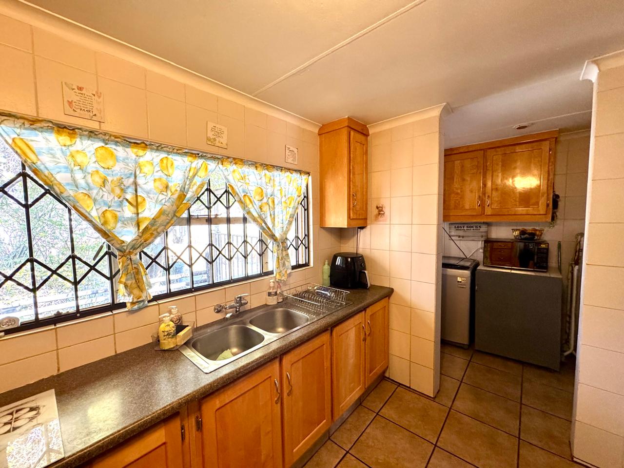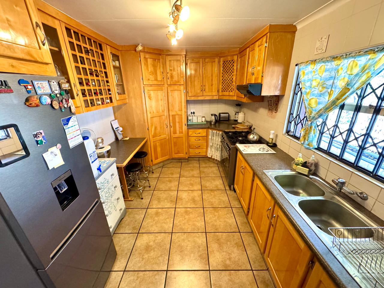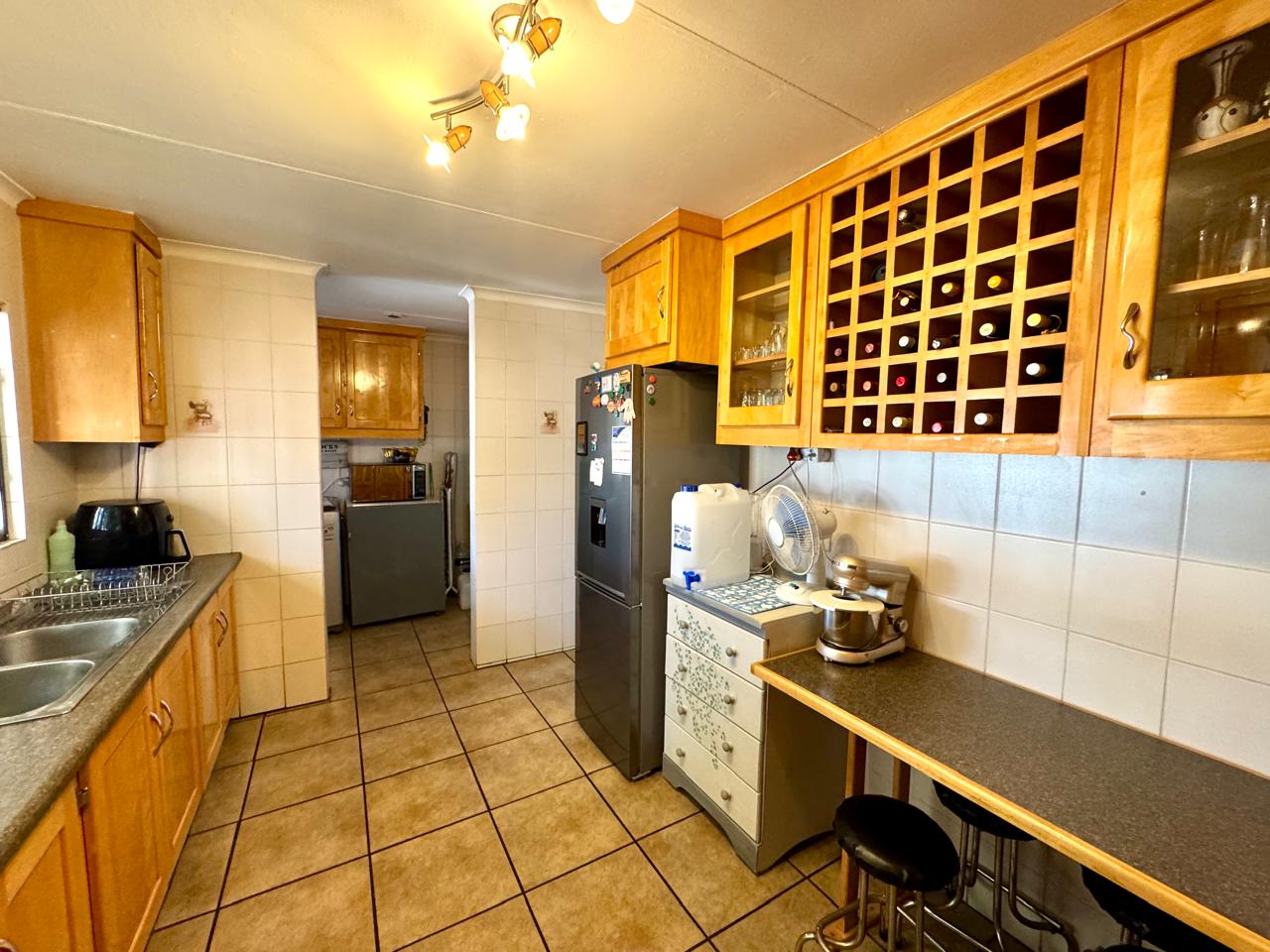 The kitchen is both practical and stylish, fitted with solid jacaranda wood cupboards, melamine countertops, and a convenient breakfast nook. A five-burner gas hob and gas oven combination provide efficiency for home cooking, while built-in wine racks add a touch of elegance. A separate scullery includes all the necessary connection points for appliances.
