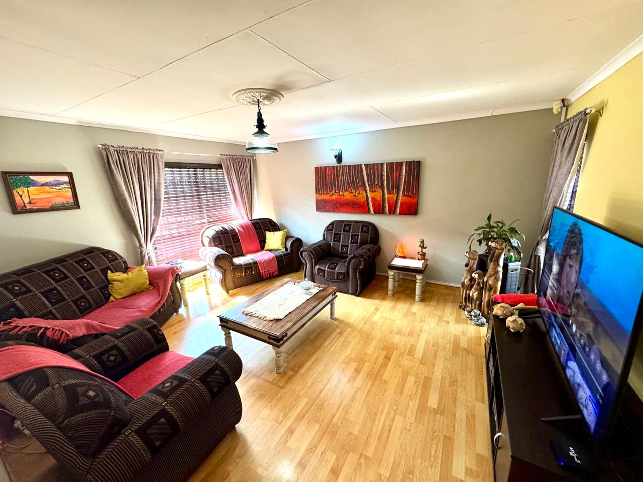 Upon entering through the front door, you are welcomed into a spacious main living area, complete with laminated flooring, blinds, and curtain railings, creating a modern and comfortable space. A second living area—ideal as a dining room—also features laminated flooring and flows easily into the kitchen.