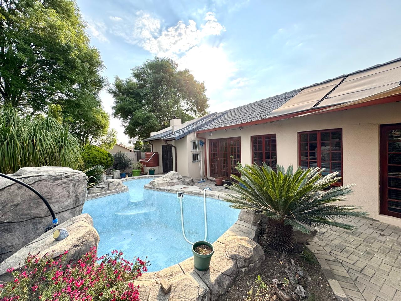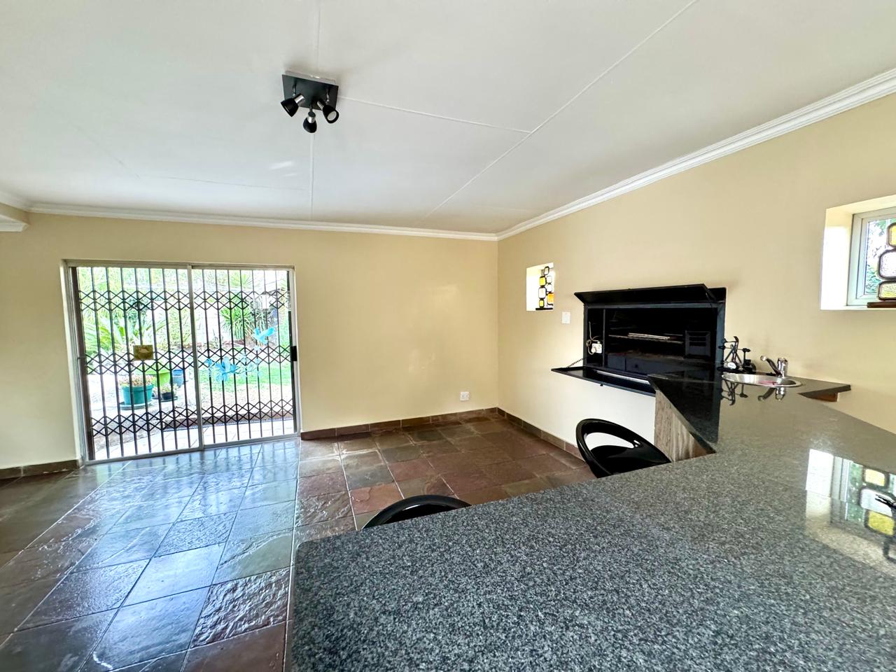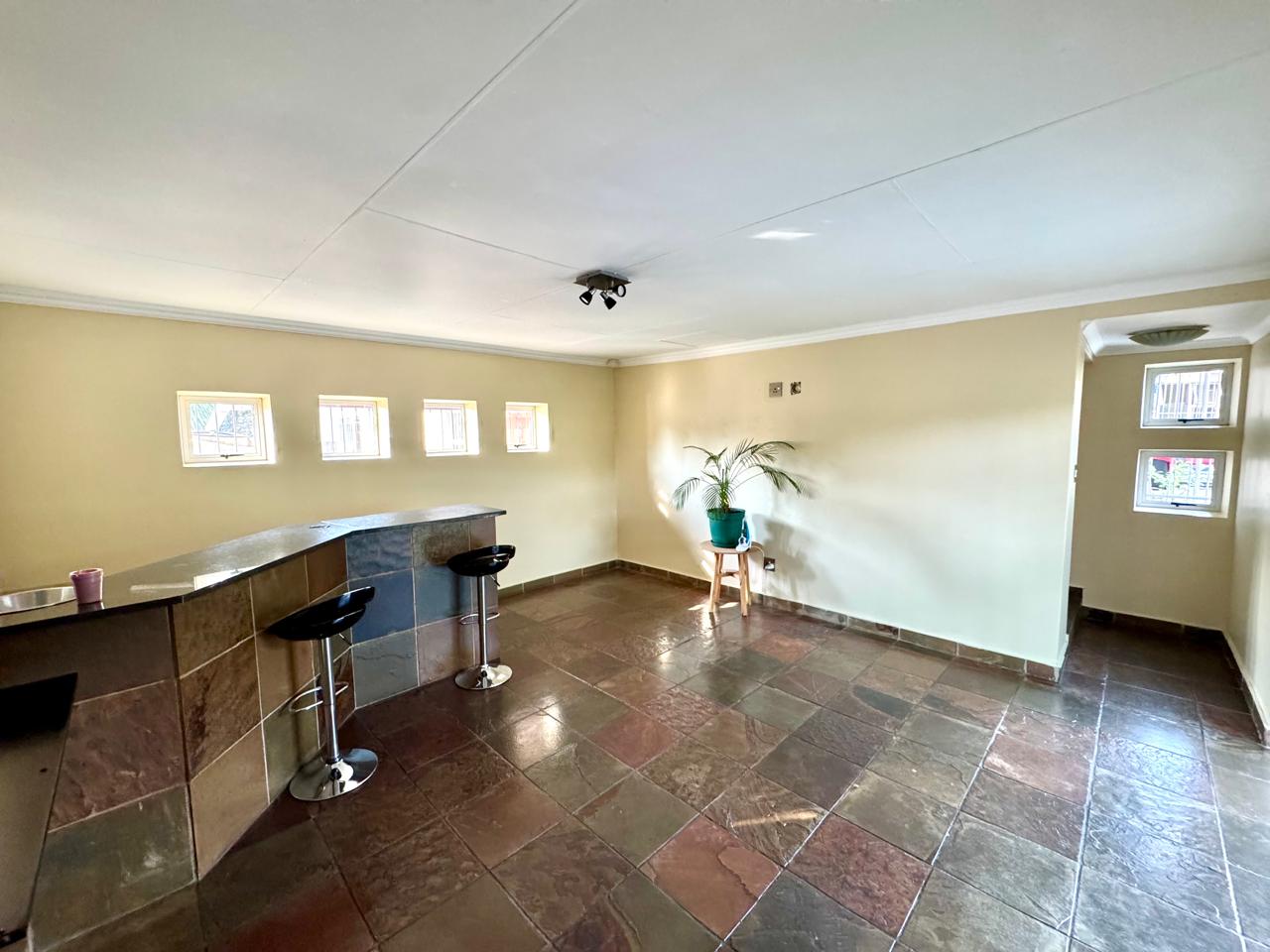 Living areas are expansive and well thought out. The first lounge features a cozy fireplace, perfect for winter evenings. The second living area opens into a spacious indoor braai and entertainment area, complete with a built in bar topped with granite. This space extends to a patio overlooking a heated swimming pool (currently being repainted), creating a seamless blend of indoor and outdoor living for year round enjoyment.