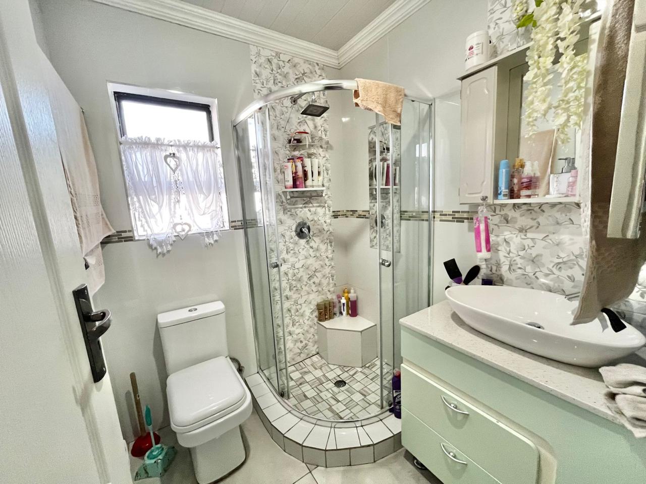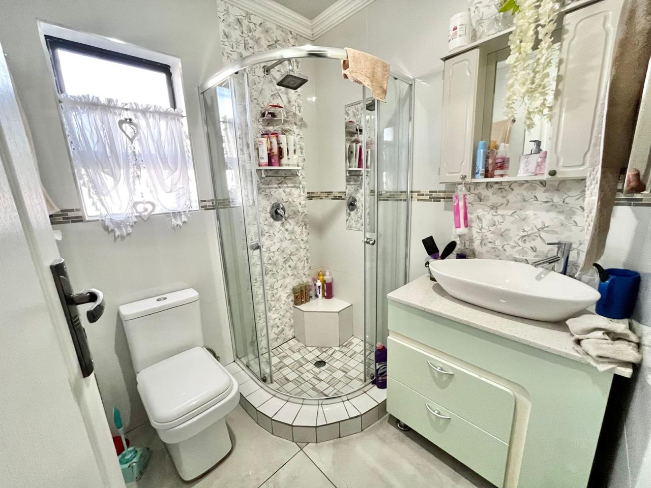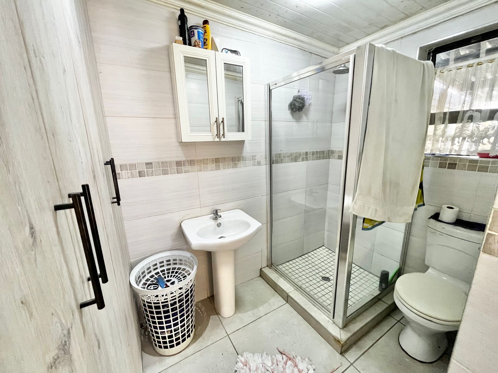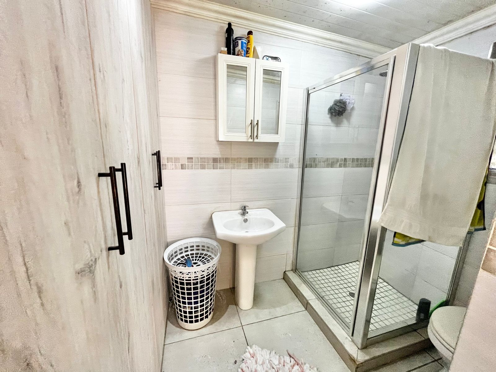 Down the hallway are three bedrooms, two of which are tiled and fitted with built-in cupboards, sharing a modern bathroom with a shower, basin, and toilet.