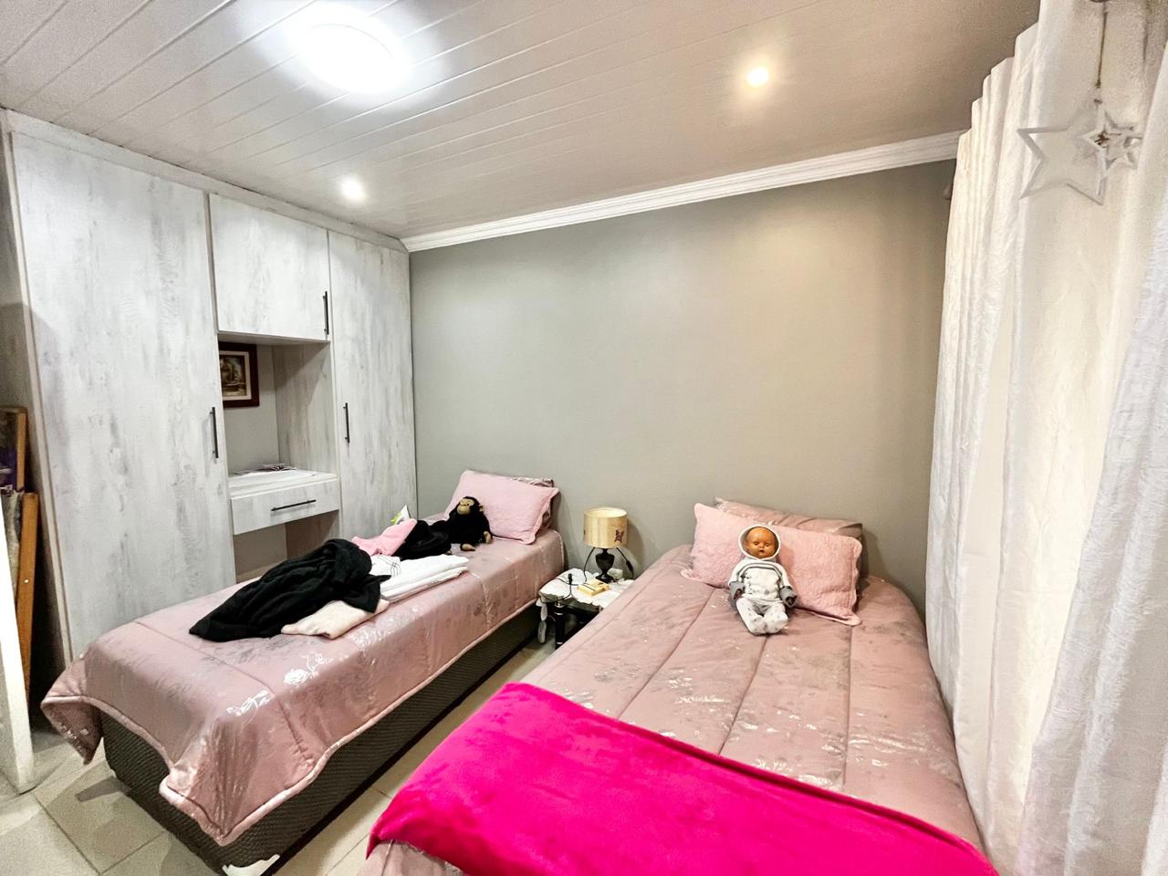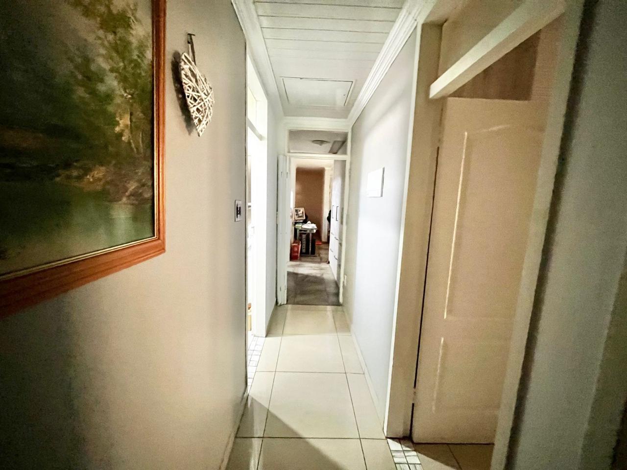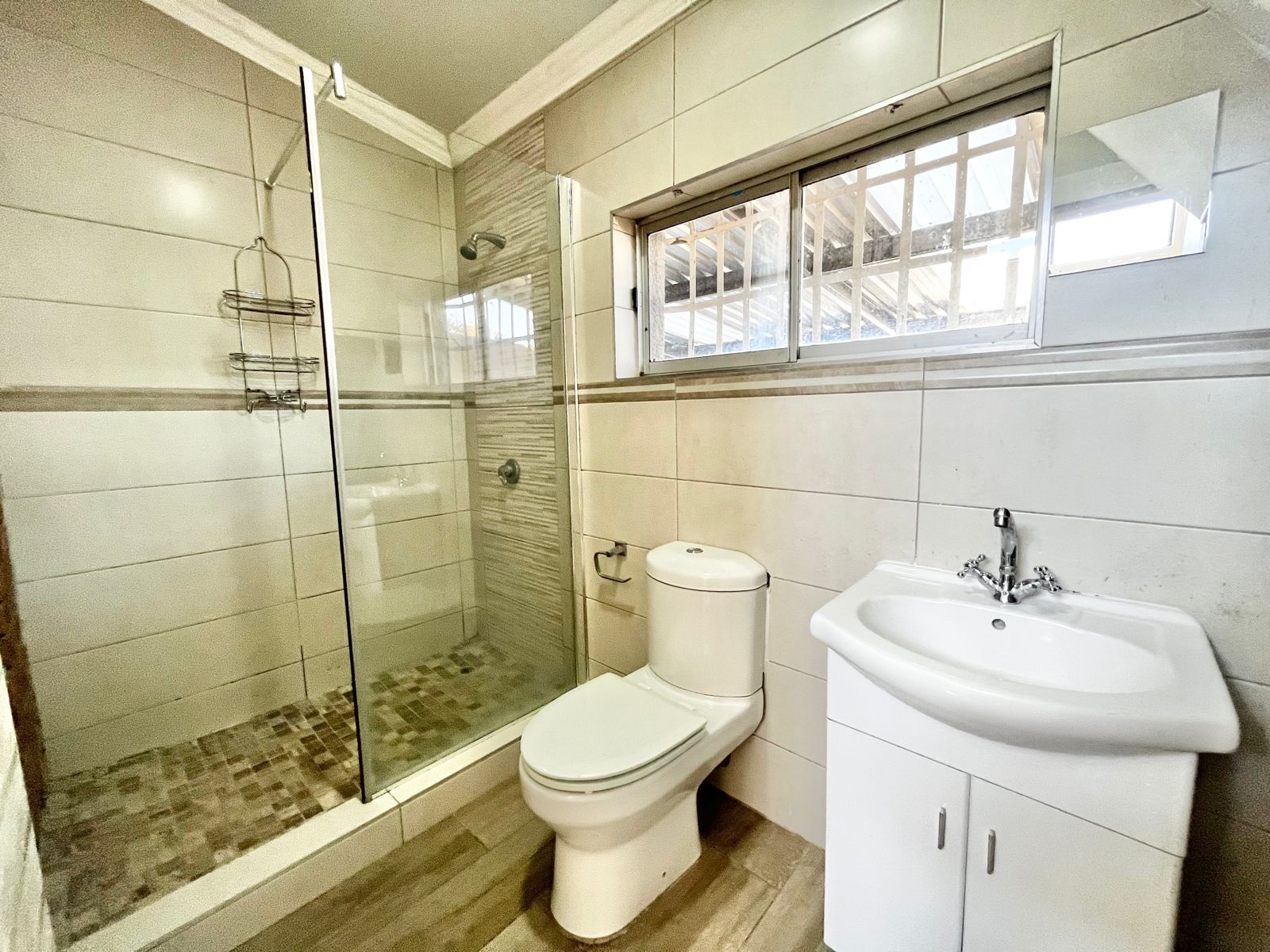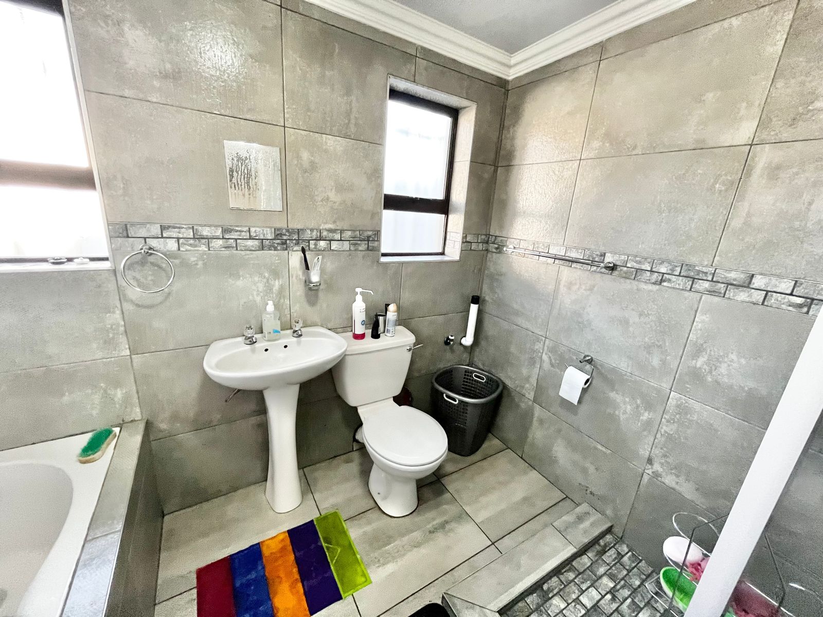 Down the hallway are three bedrooms, two of which are tiled and fitted with built-in cupboards, sharing a modern bathroom with a shower, basin, and toilet.