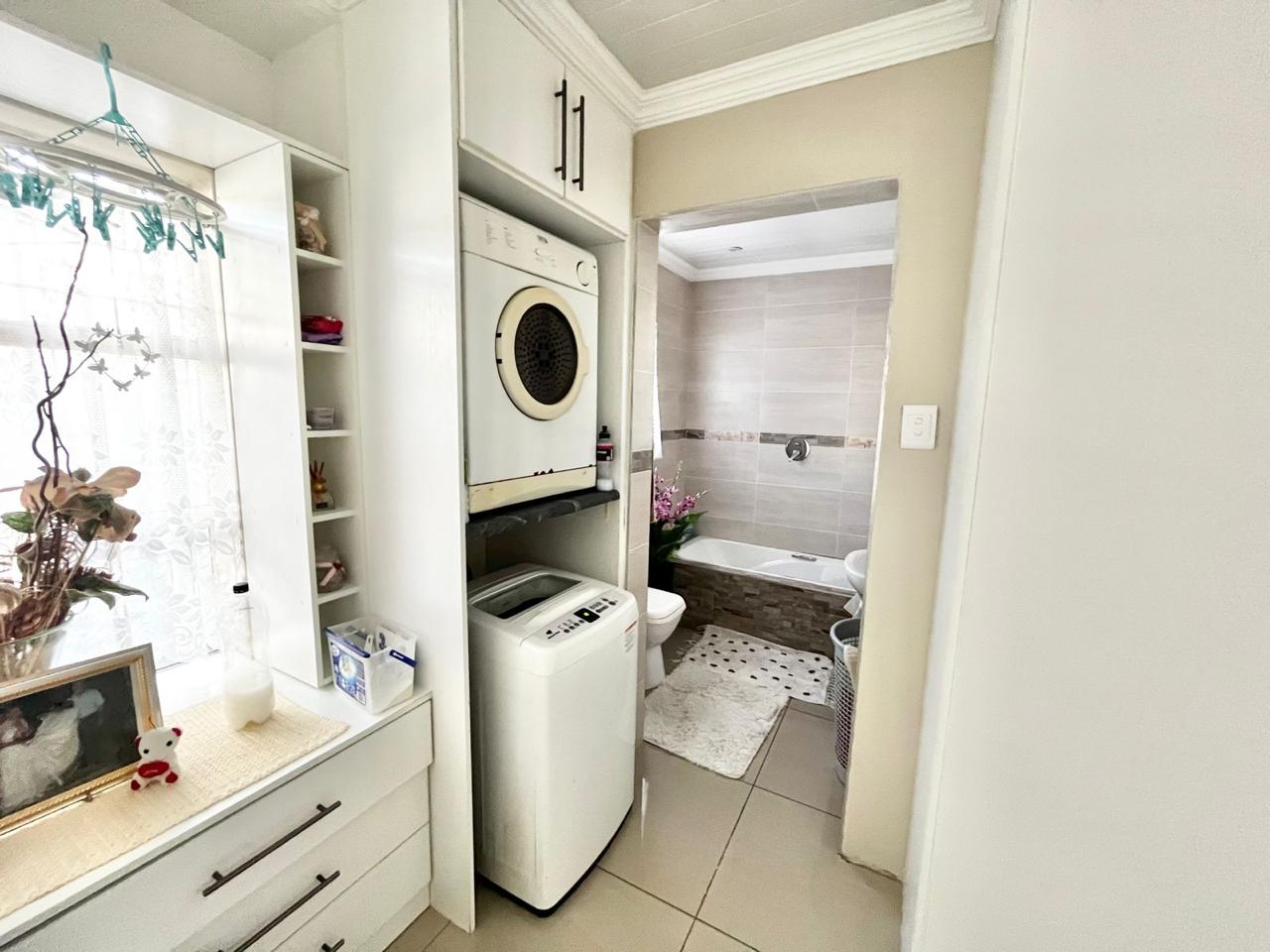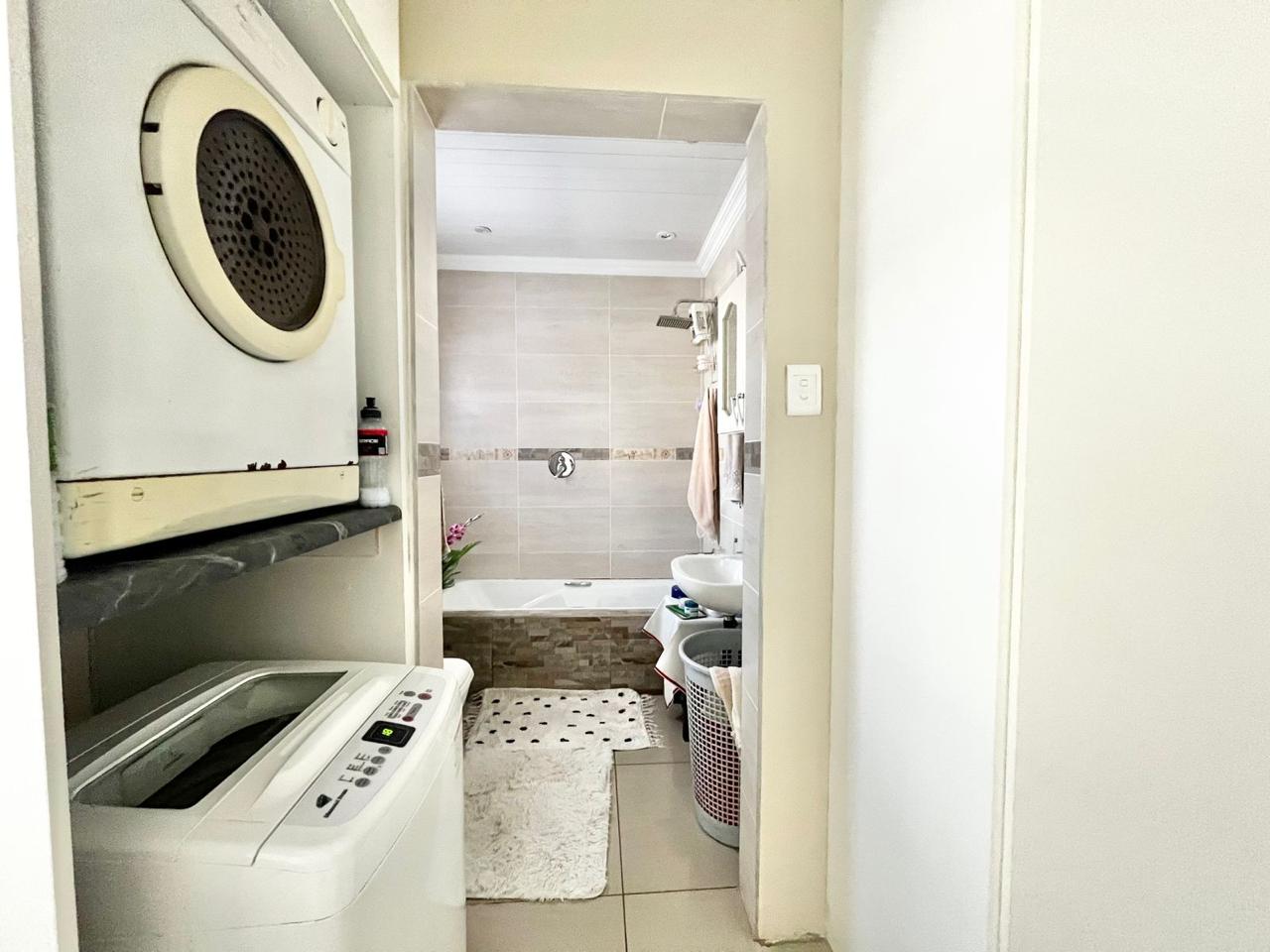 The main bedroom is spacious, featuring a walk-in closet with washing machine connections and an en-suite bathroom with a bath/shower combo, basin, and toilet.