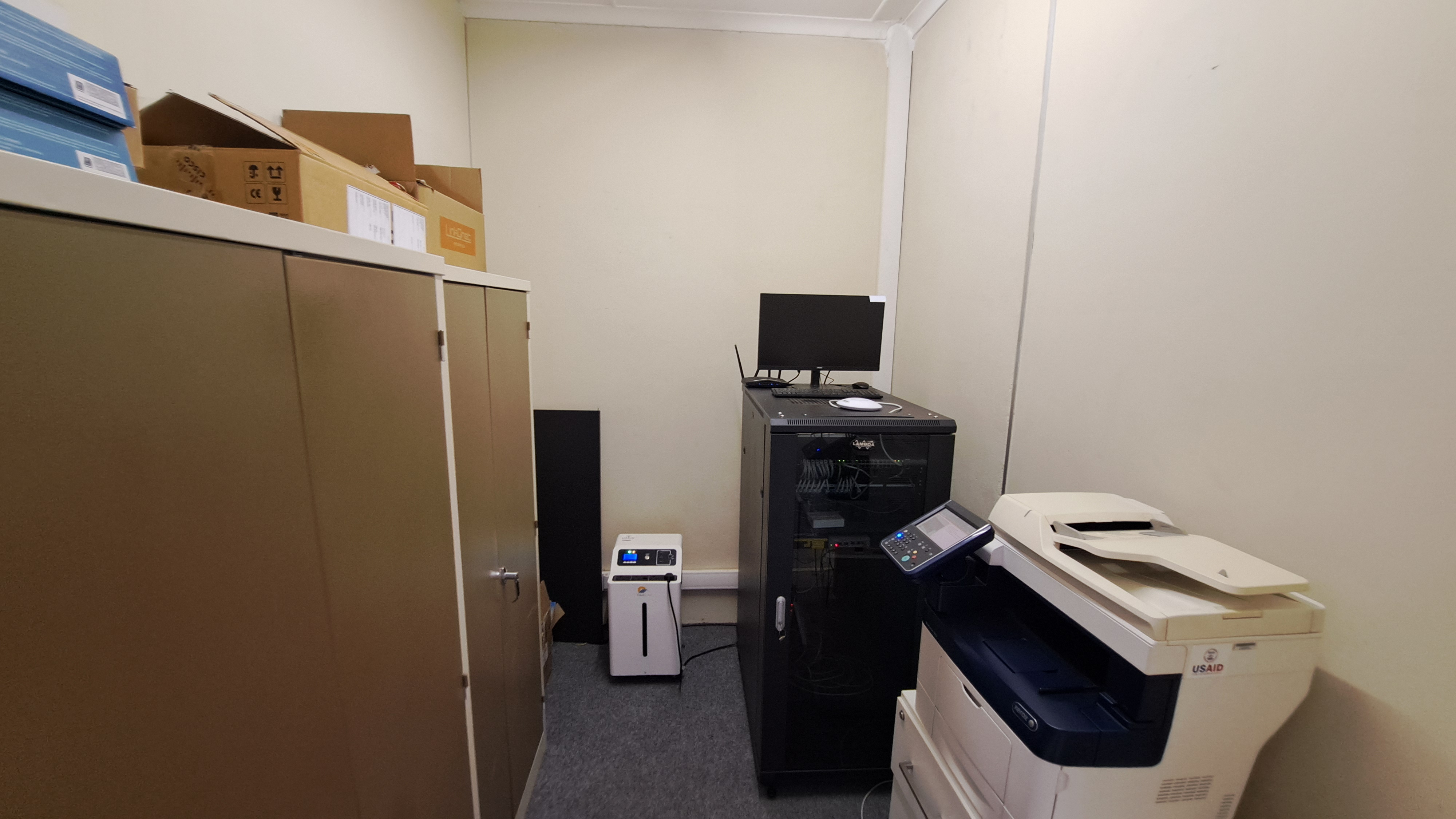 Carpeted floors, safe, and storeroom for efficient office operations