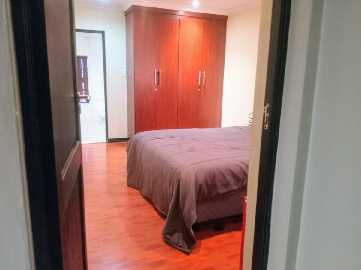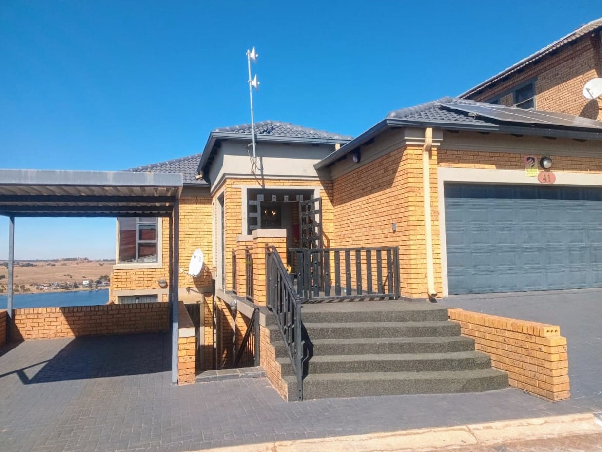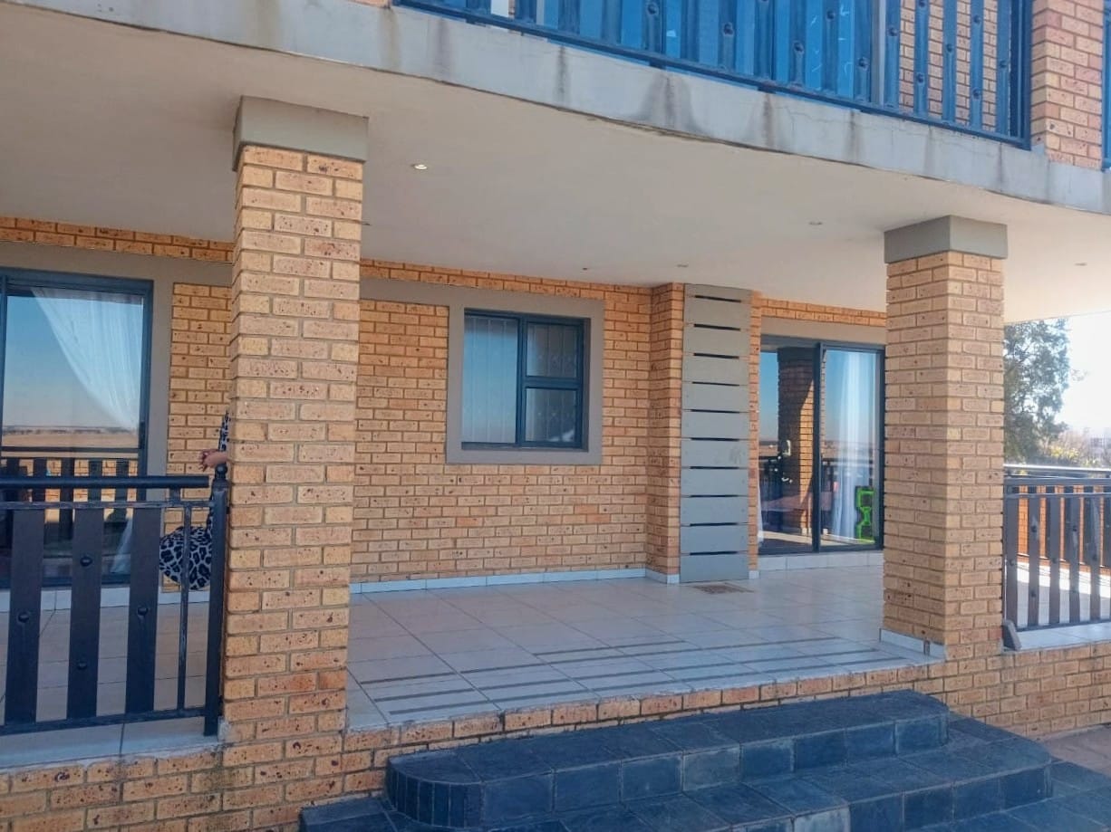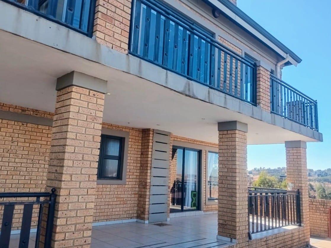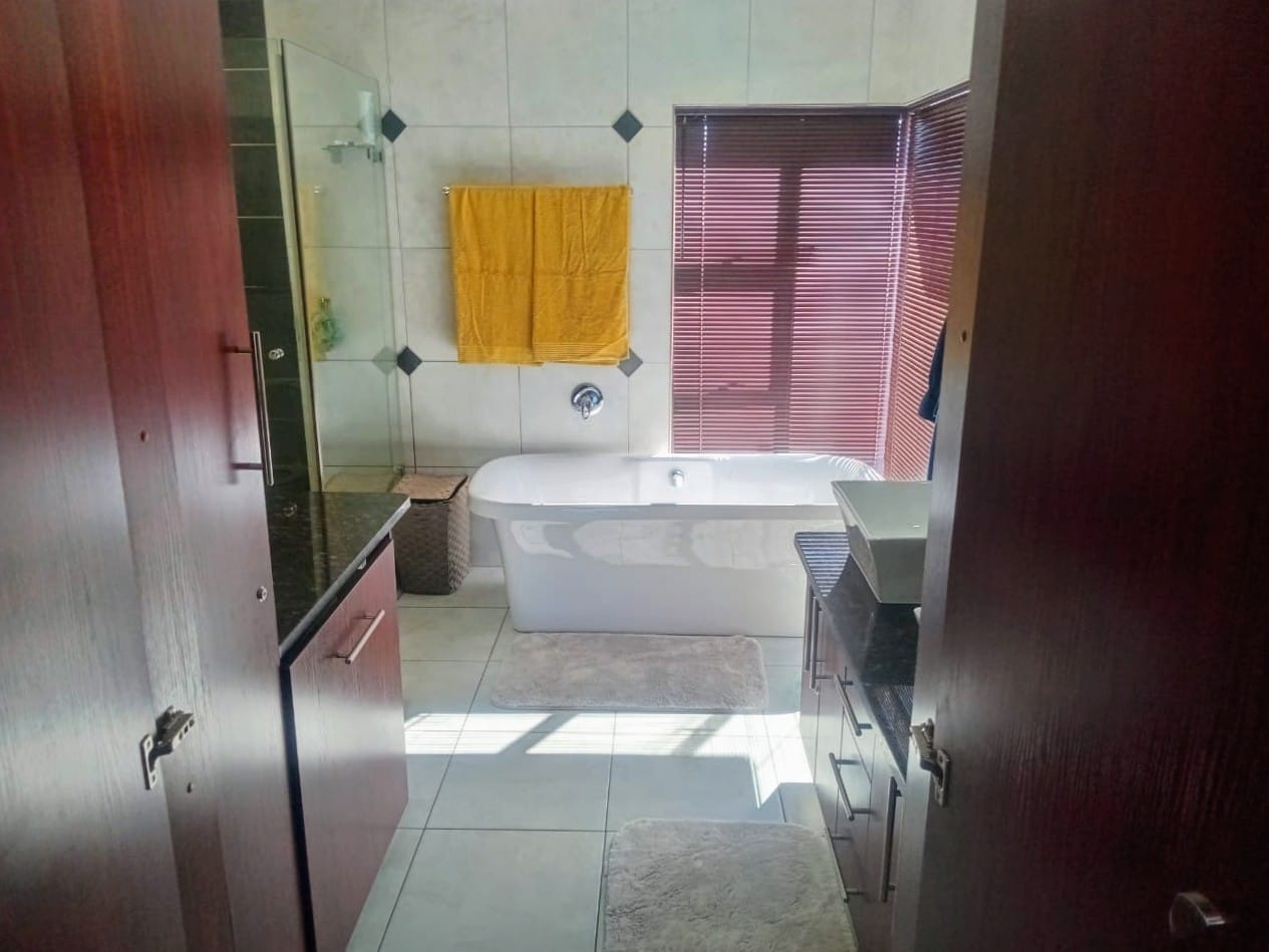 This double-story home in Kungwini Ranch offers practical comfort with a scenic dam view. The property includes four bedrooms and four-and-a-half bathrooms, with each bedroom featuring its own en-suite. Upstairs, the main bedroom has a private balcony overlooking the Bronkhorstspruit Dam, a walk-in closet, and a full bathroom with double basins. Two more bedrooms on the top floor share a balcony and each has its own en-suite bathroom. A guest toilet is also located upstairs. The kitchen is fitted with a gas stove, eye-level oven, extractor fan, granite countertops, prep bowl, breakfast nook, and a separate scullery. The open-plan lounge and dining area lead to a built-in bar and braai, offering a functional space for everyday living and occasional entertaining. On the ground floor, there is a bachelor flat with its own entrance, kitchenette, bedroom, bathroom, and lounge — suitable for guests or extended family. Outside, the property features a swimming pool with dam views and a built-in pizza oven. The house is equipped with air-conditioning, solar power, and an inverter system. Residents of Kungwini Ranch have access to communal facilities including a boat launch, fishing area, and picnic spots. This home offers a balanced combination of space, utility, and location. Contact me today to schedule a viewing.