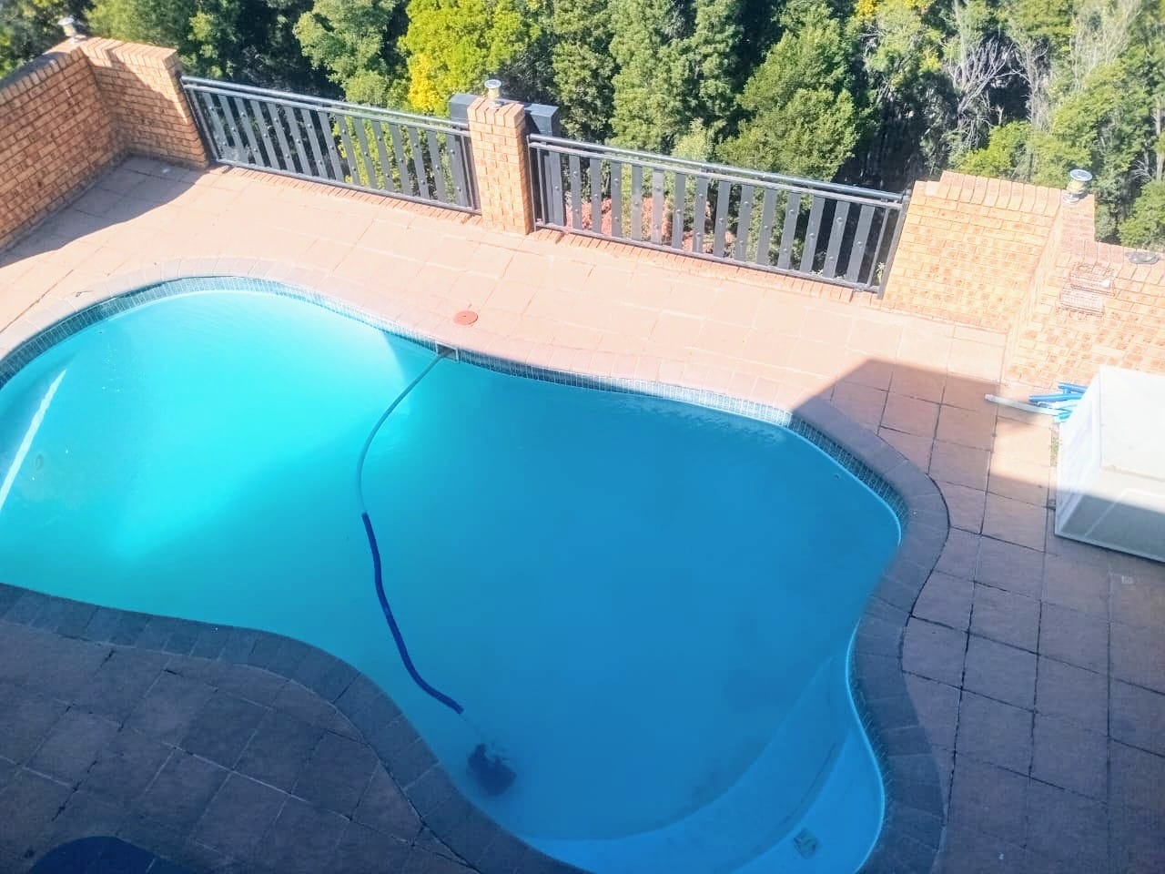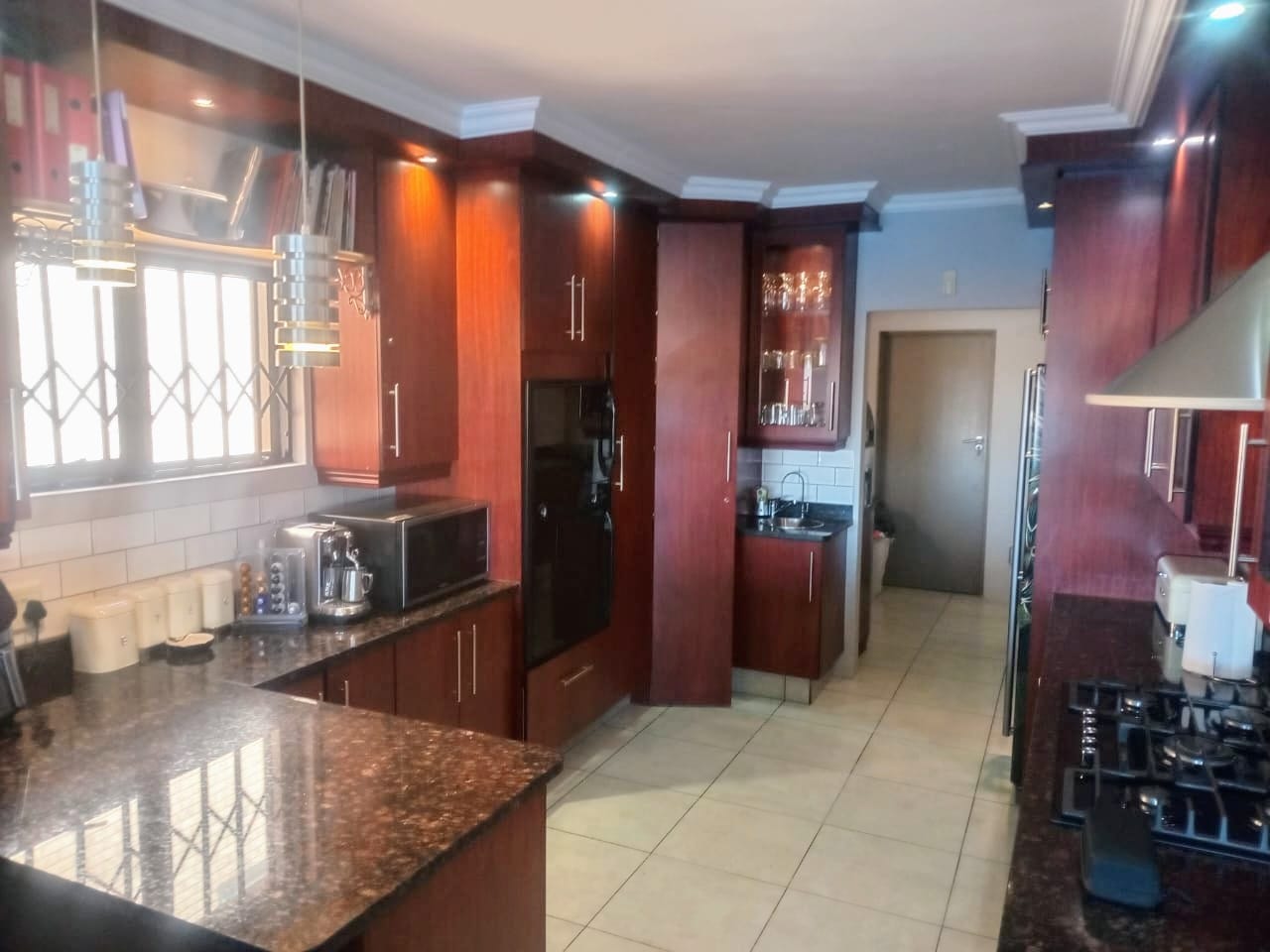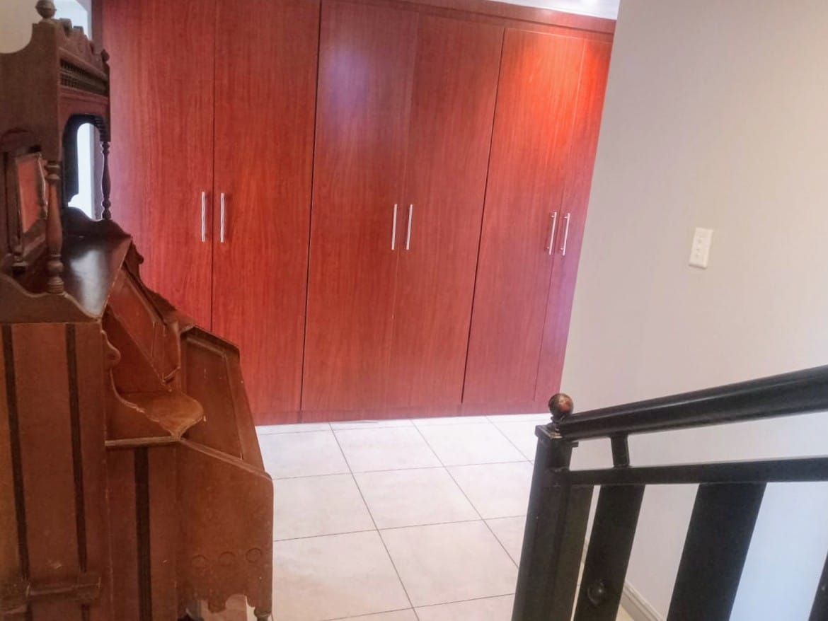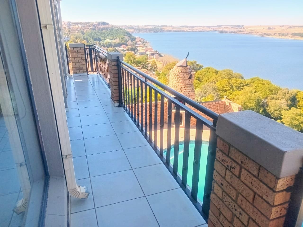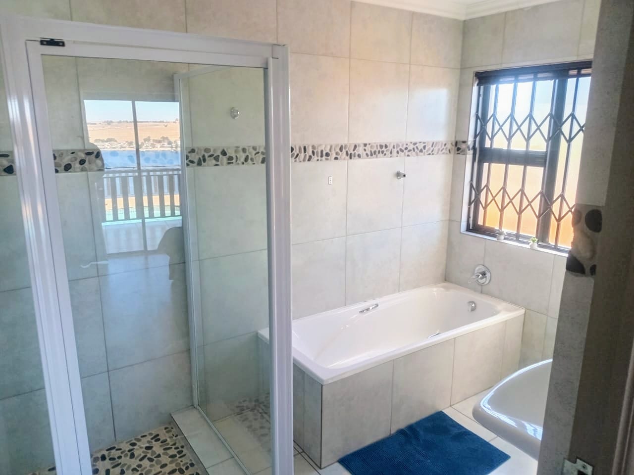 This double-story home in Kungwini Ranch offers practical comfort with a scenic dam view. The property includes four bedrooms and four-and-a-half bathrooms, with each bedroom featuring its own en-suite. Upstairs, the main bedroom has a private balcony overlooking the Bronkhorstspruit Dam, a walk-in closet, and a full bathroom with double basins. Two more bedrooms on the top floor share a balcony and each has its own en-suite bathroom. A guest toilet is also located upstairs. The kitchen is fitted with a gas stove, eye-level oven, extractor fan, granite countertops, prep bowl, breakfast nook, and a separate scullery. The open-plan lounge and dining area lead to a built-in bar and braai, offering a functional space for everyday living and occasional entertaining. On the ground floor, there is a bachelor flat with its own entrance, kitchenette, bedroom, bathroom, and lounge — suitable for guests or extended family. Outside, the property features a swimming pool with dam views and a built-in pizza oven. The house is equipped with air-conditioning, solar power, and an inverter system. Residents of Kungwini Ranch have access to communal facilities including a boat launch, fishing area, and picnic spots. This home offers a balanced combination of space, utility, and location. Contact me today to schedule a viewing.