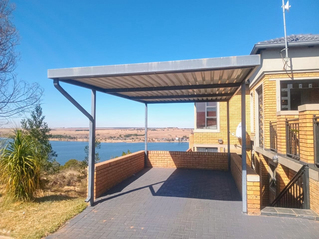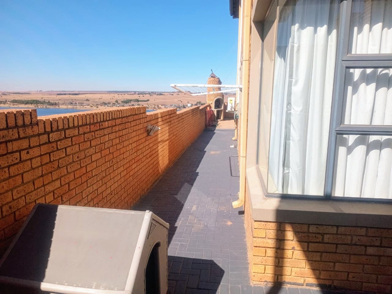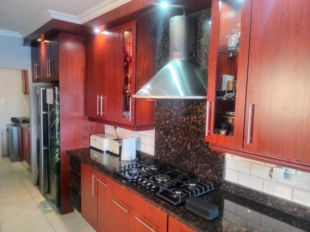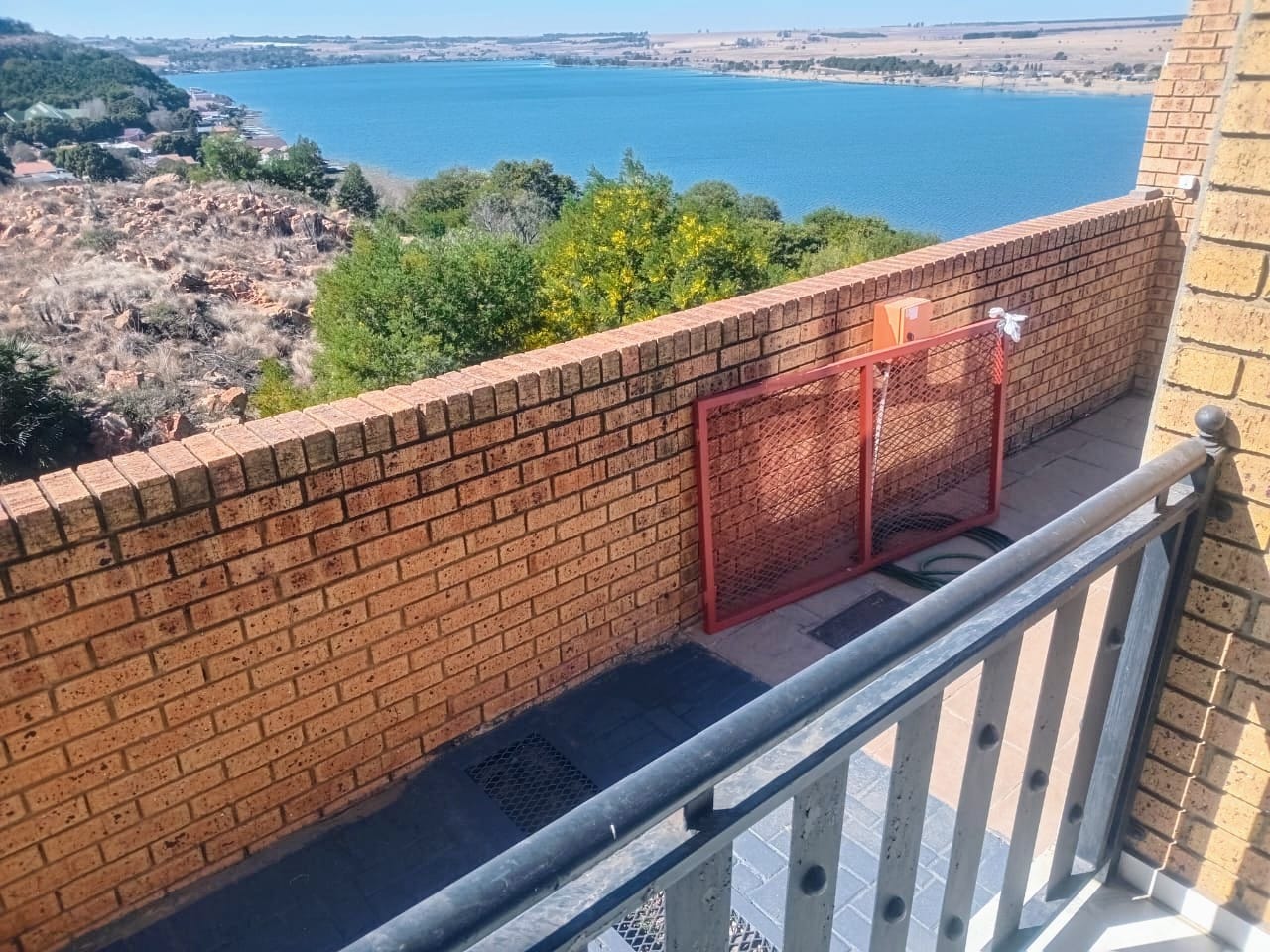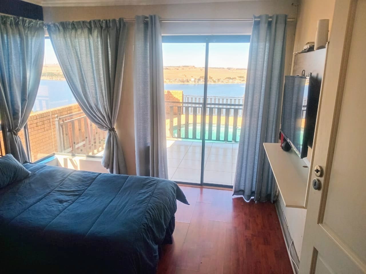 This double-story home in Kungwini Ranch offers practical comfort with a scenic dam view. The property includes four bedrooms and four-and-a-half bathrooms, with each bedroom featuring its own en-suite. Upstairs, the main bedroom has a private balcony overlooking the Bronkhorstspruit Dam, a walk-in closet, and a full bathroom with double basins. Two more bedrooms on the top floor share a balcony and each has its own en-suite bathroom. A guest toilet is also located upstairs. The kitchen is fitted with a gas stove, eye-level oven, extractor fan, granite countertops, prep bowl, breakfast nook, and a separate scullery. The open-plan lounge and dining area lead to a built-in bar and braai, offering a functional space for everyday living and occasional entertaining. On the ground floor, there is a bachelor flat with its own entrance, kitchenette, bedroom, bathroom, and lounge — suitable for guests or extended family. Outside, the property features a swimming pool with dam views and a built-in pizza oven. The house is equipped with air-conditioning, solar power, and an inverter system. Residents of Kungwini Ranch have access to communal facilities including a boat launch, fishing area, and picnic spots. This home offers a balanced combination of space, utility, and location. Contact me today to schedule a viewing.