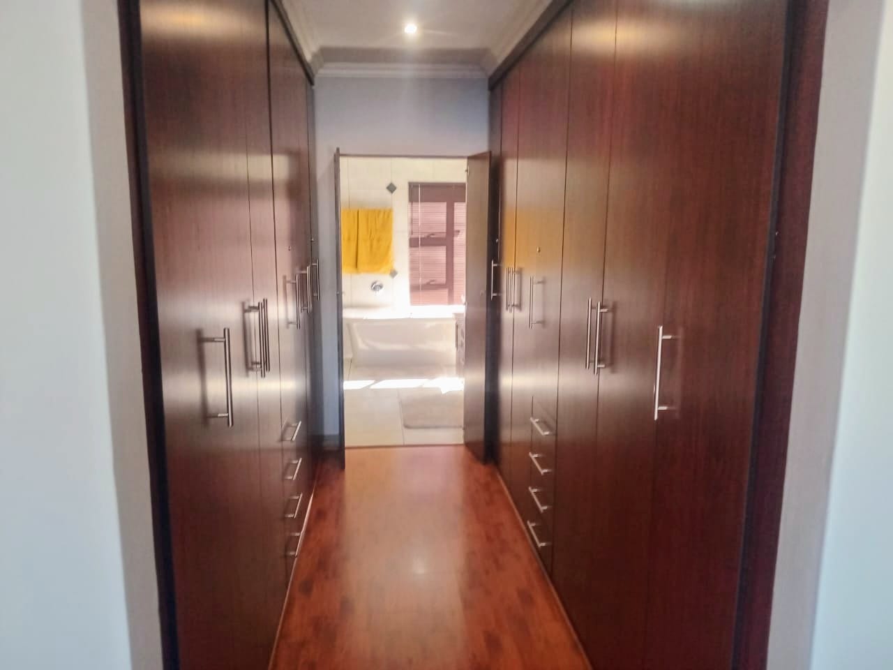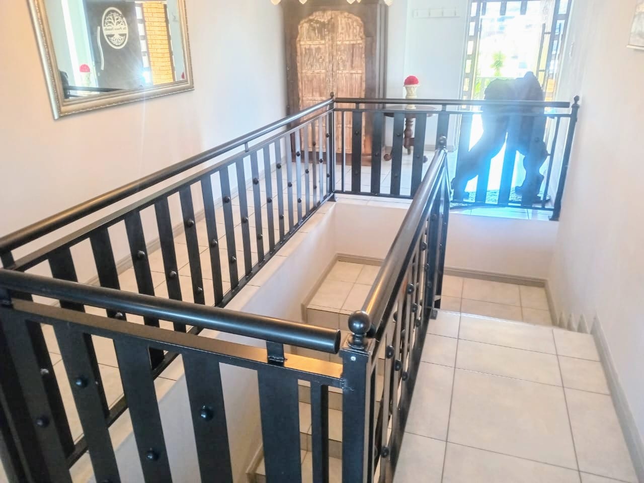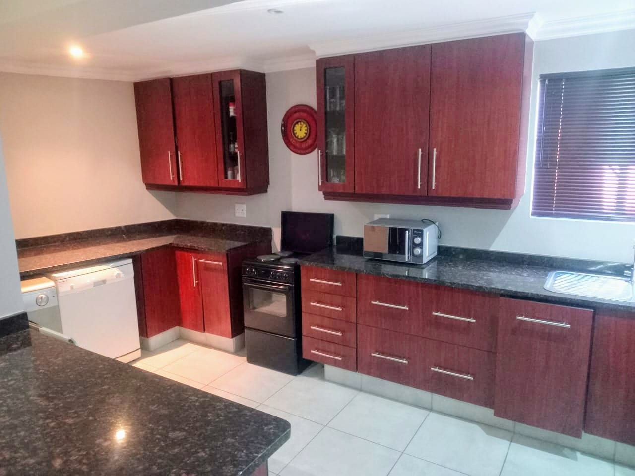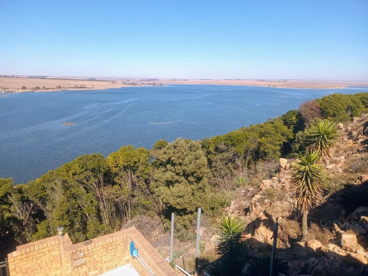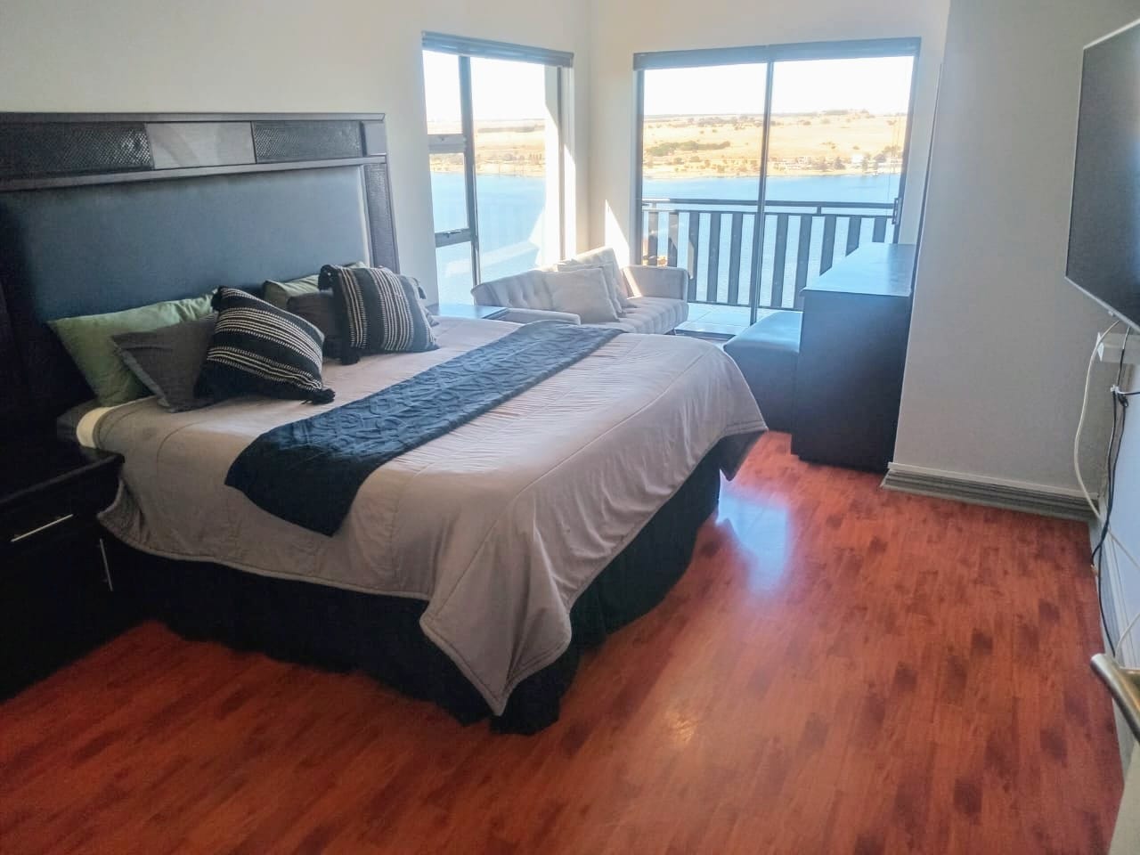 This double-story home in Kungwini Ranch offers practical comfort with a scenic dam view. The property includes four bedrooms and four-and-a-half bathrooms, with each bedroom featuring its own en-suite. Upstairs, the main bedroom has a private balcony overlooking the Bronkhorstspruit Dam, a walk-in closet, and a full bathroom with double basins. Two more bedrooms on the top floor share a balcony and each has its own en-suite bathroom. A guest toilet is also located upstairs. The kitchen is fitted with a gas stove, eye-level oven, extractor fan, granite countertops, prep bowl, breakfast nook, and a separate scullery. The open-plan lounge and dining area lead to a built-in bar and braai, offering a functional space for everyday living and occasional entertaining. On the ground floor, there is a bachelor flat with its own entrance, kitchenette, bedroom, bathroom, and lounge — suitable for guests or extended family. Outside, the property features a swimming pool with dam views and a built-in pizza oven. The house is equipped with air-conditioning, solar power, and an inverter system. Residents of Kungwini Ranch have access to communal facilities including a boat launch, fishing area, and picnic spots. This home offers a balanced combination of space, utility, and location. Contact me today to schedule a viewing.