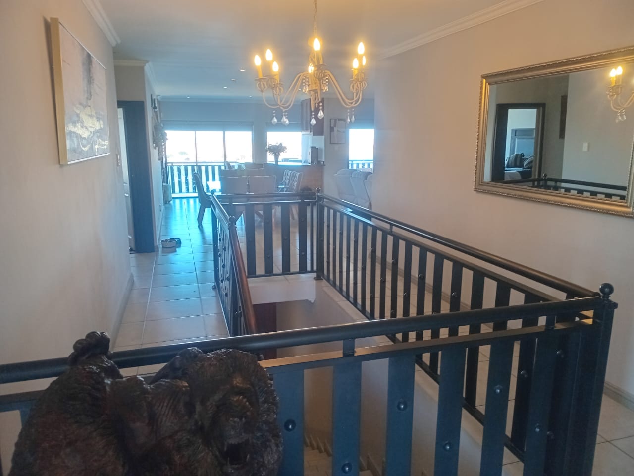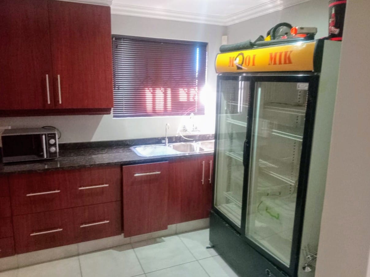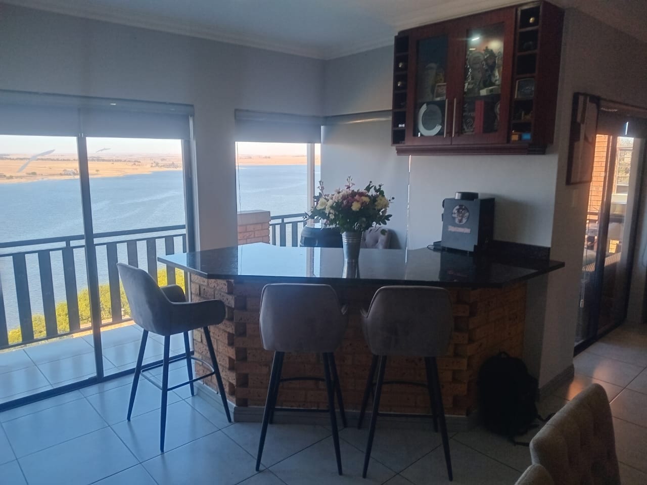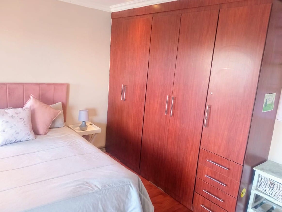 This double-story home in Kungwini Ranch offers practical comfort with a scenic dam view. The property includes four bedrooms and four-and-a-half bathrooms, with each bedroom featuring its own en-suite. Upstairs, the main bedroom has a private balcony overlooking the Bronkhorstspruit Dam, a walk-in closet, and a full bathroom with double basins. Two more bedrooms on the top floor share a balcony and each has its own en-suite bathroom. A guest toilet is also located upstairs.