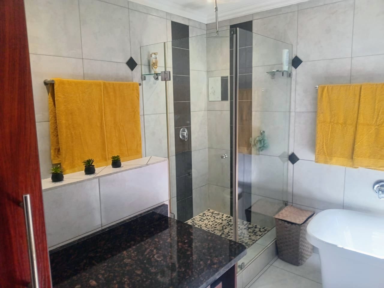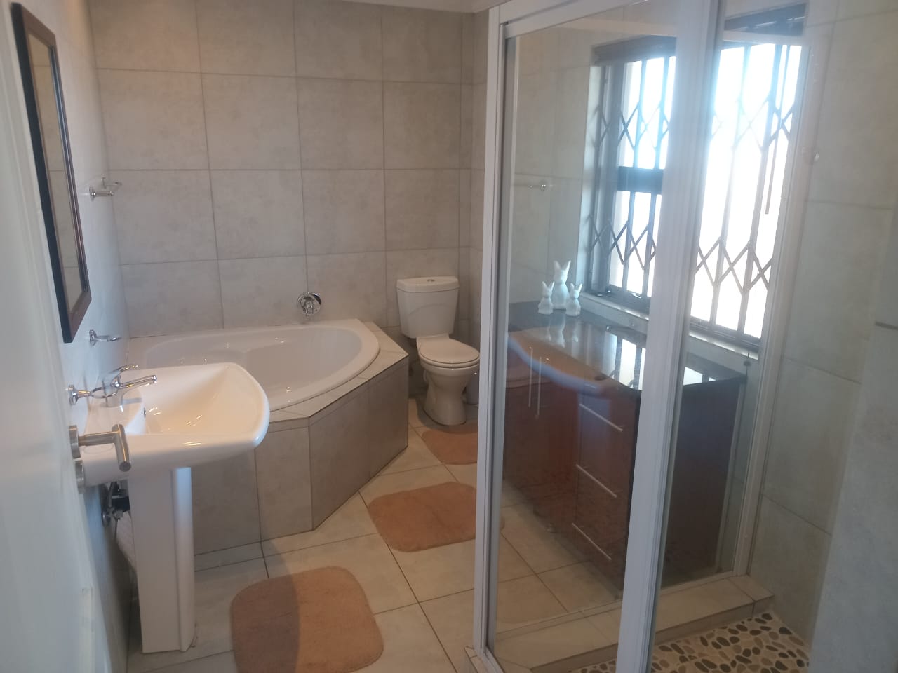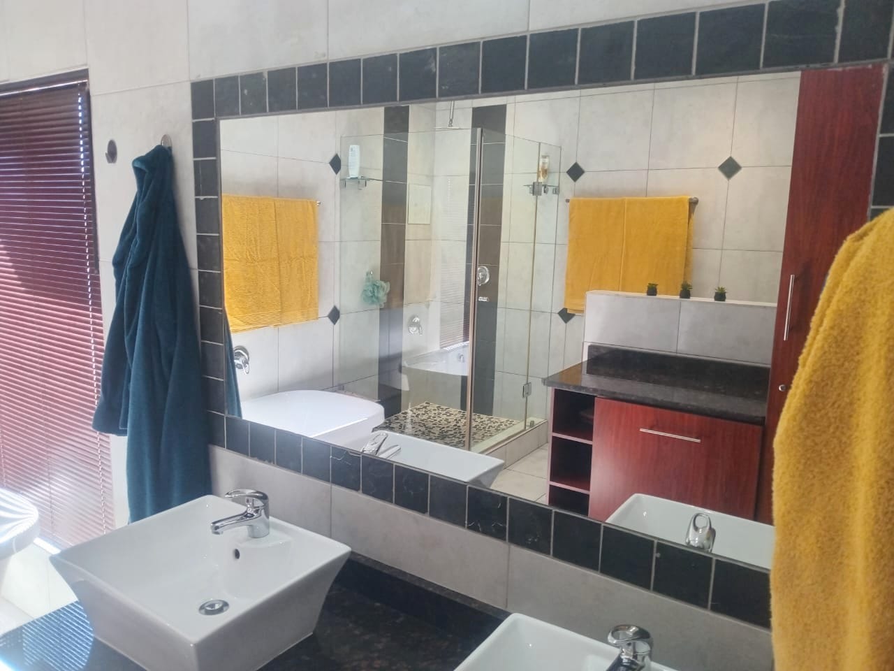 This double-story home in Kungwini Ranch offers practical comfort with a scenic dam view. The property includes four bedrooms and four-and-a-half bathrooms, with each bedroom featuring its own en-suite. Upstairs, the main bedroom has a private balcony overlooking the Bronkhorstspruit Dam, a walk-in closet, and a full bathroom with double basins. Two more bedrooms on the top floor share a balcony and each has its own en-suite bathroom. A guest toilet is also located upstairs.