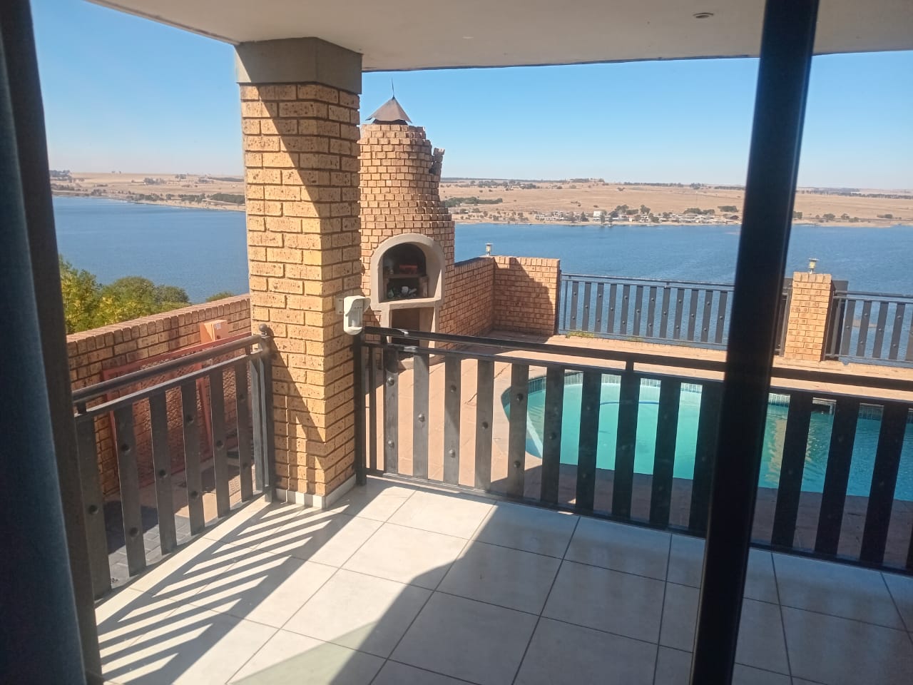 On the ground floor, there is a bachelor flat with its own entrance, kitchenette, bedroom, bathroom, and lounge — suitable for guests or extended family. Outside, the property features a swimming pool with dam views and a built-in pizza oven.