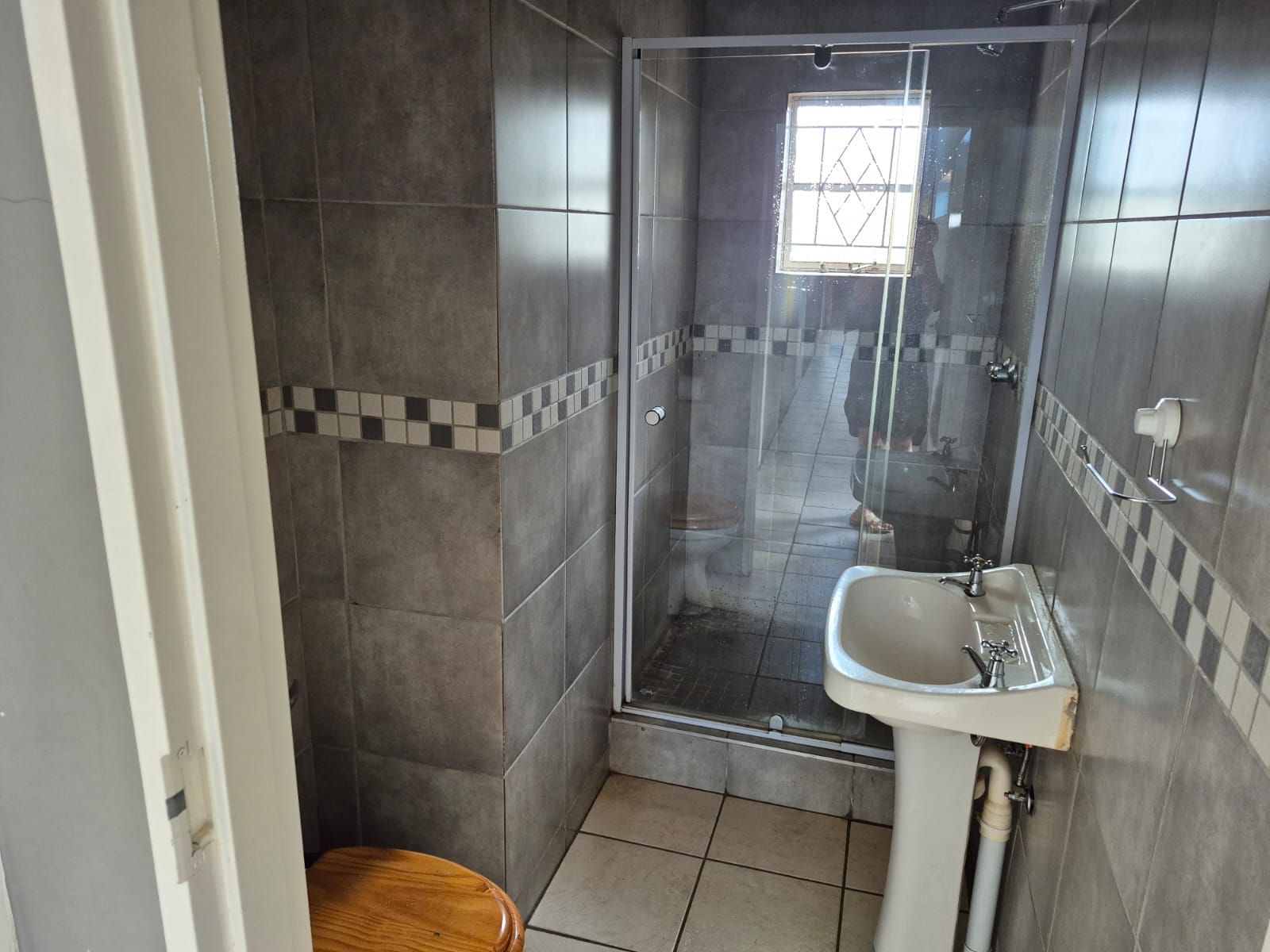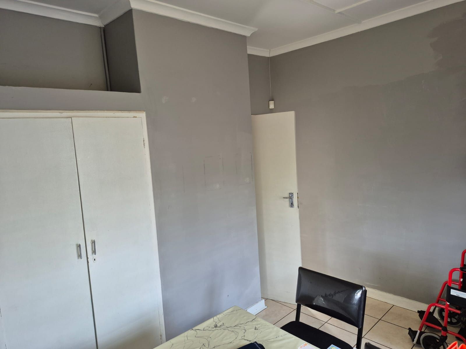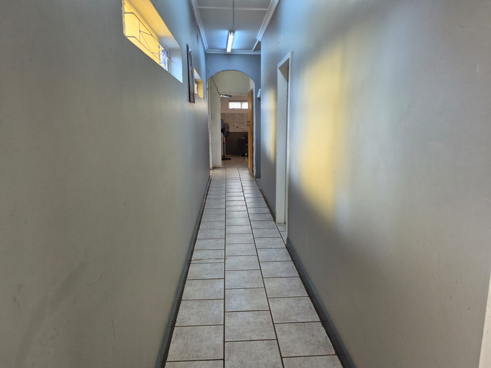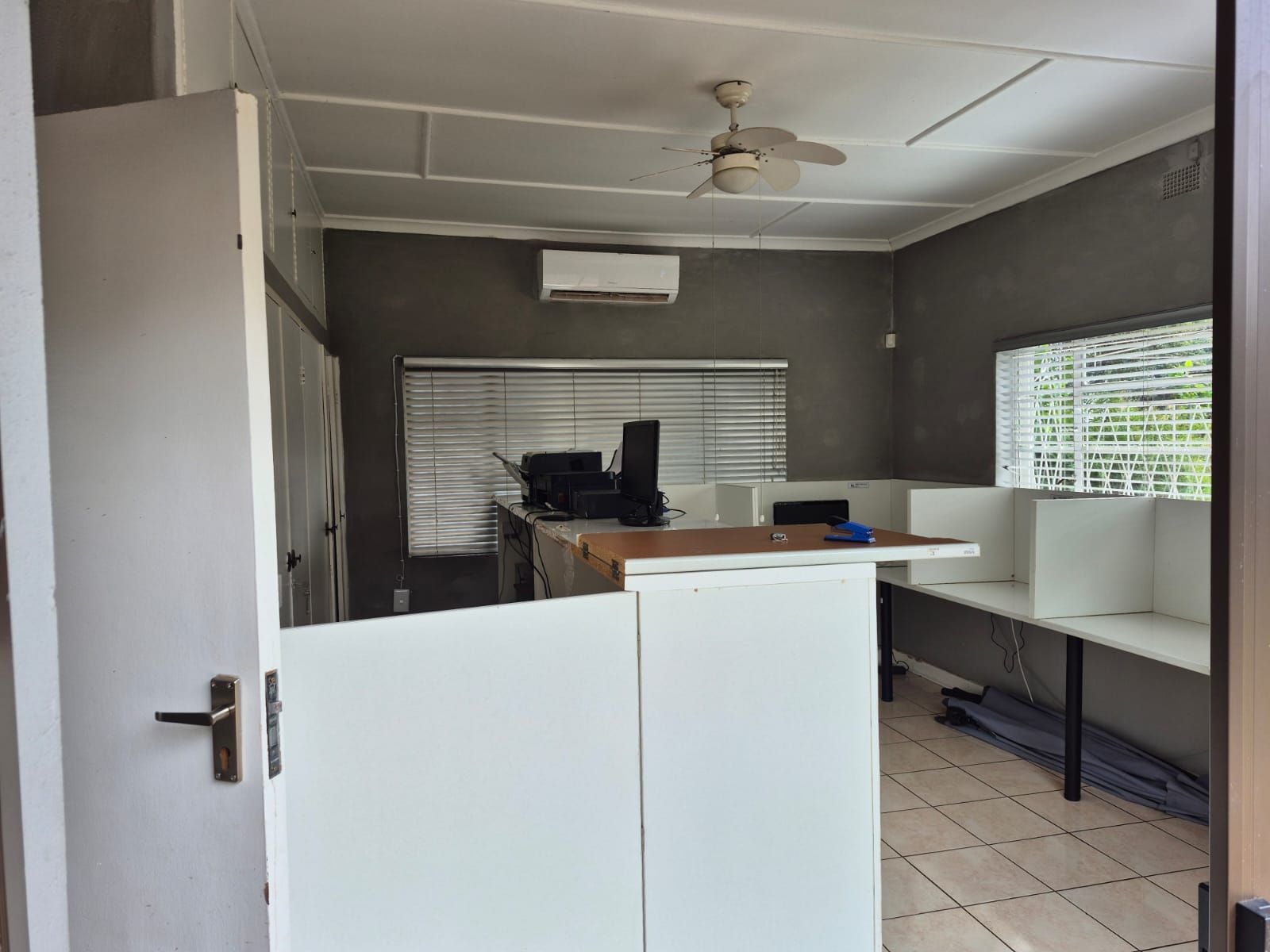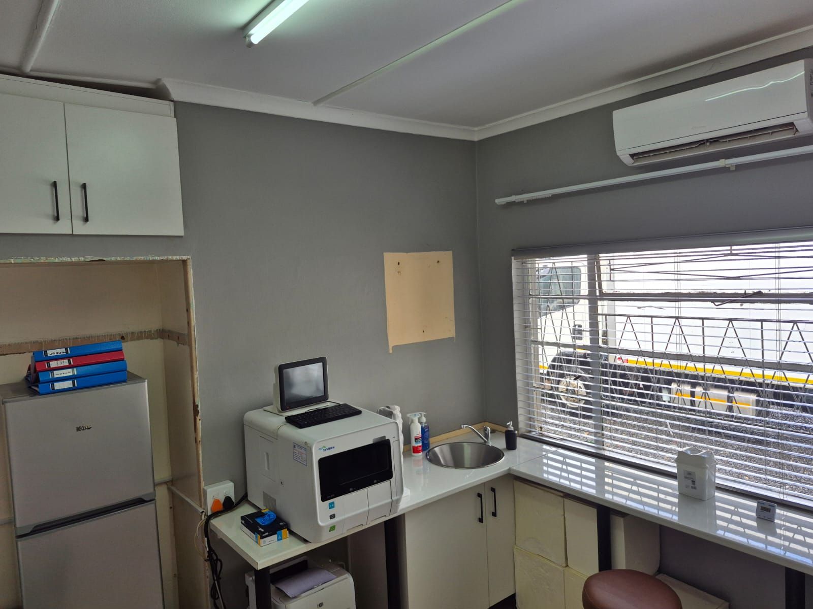 The property features three consulting rooms, each equipped with air-conditioning, tiled flooring for hygiene compliance, burglar bars for security, and built-in cupboards for practical storage. Two bathrooms—both fitted with shower, toilet, and basin—serve patients and staff with convenience.